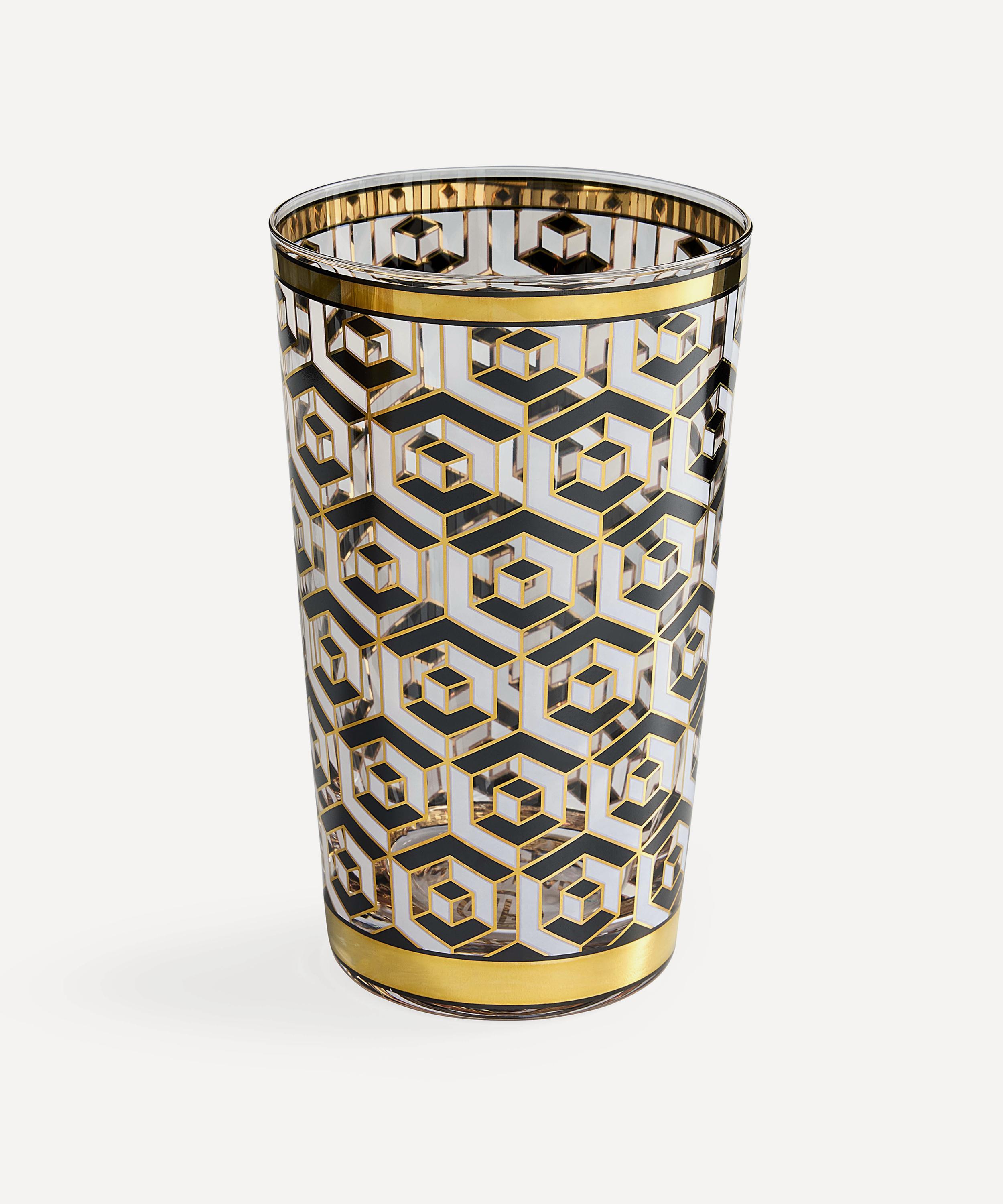 This set of four highball glasses is crafted from glass and individually decorated with black and white patterns, then finished with warming gold accents for a note of understated polish. Style them with your own home-bar favourites or mix and match them with the coordinating tumbler glasses for your next drinks gathering.