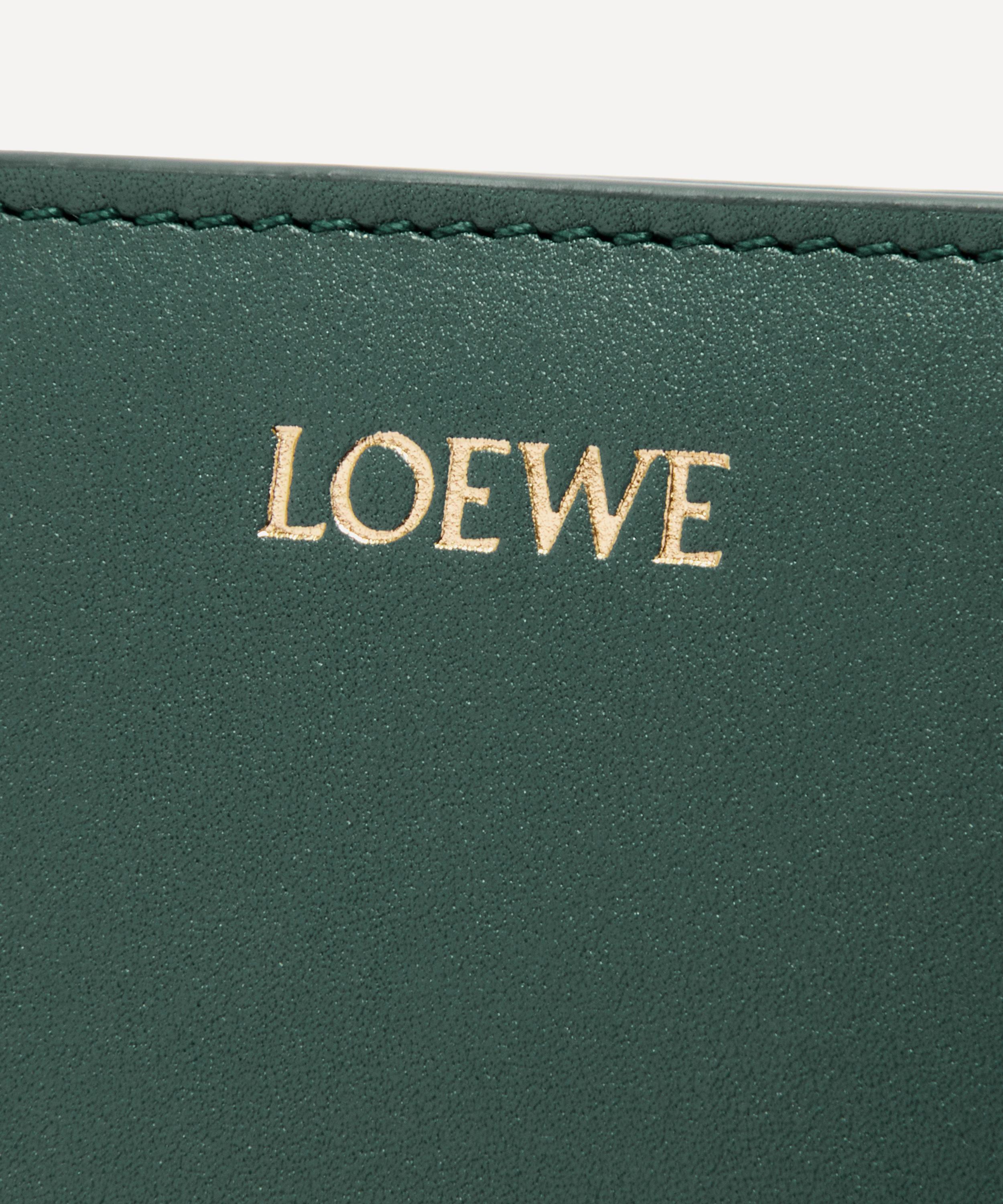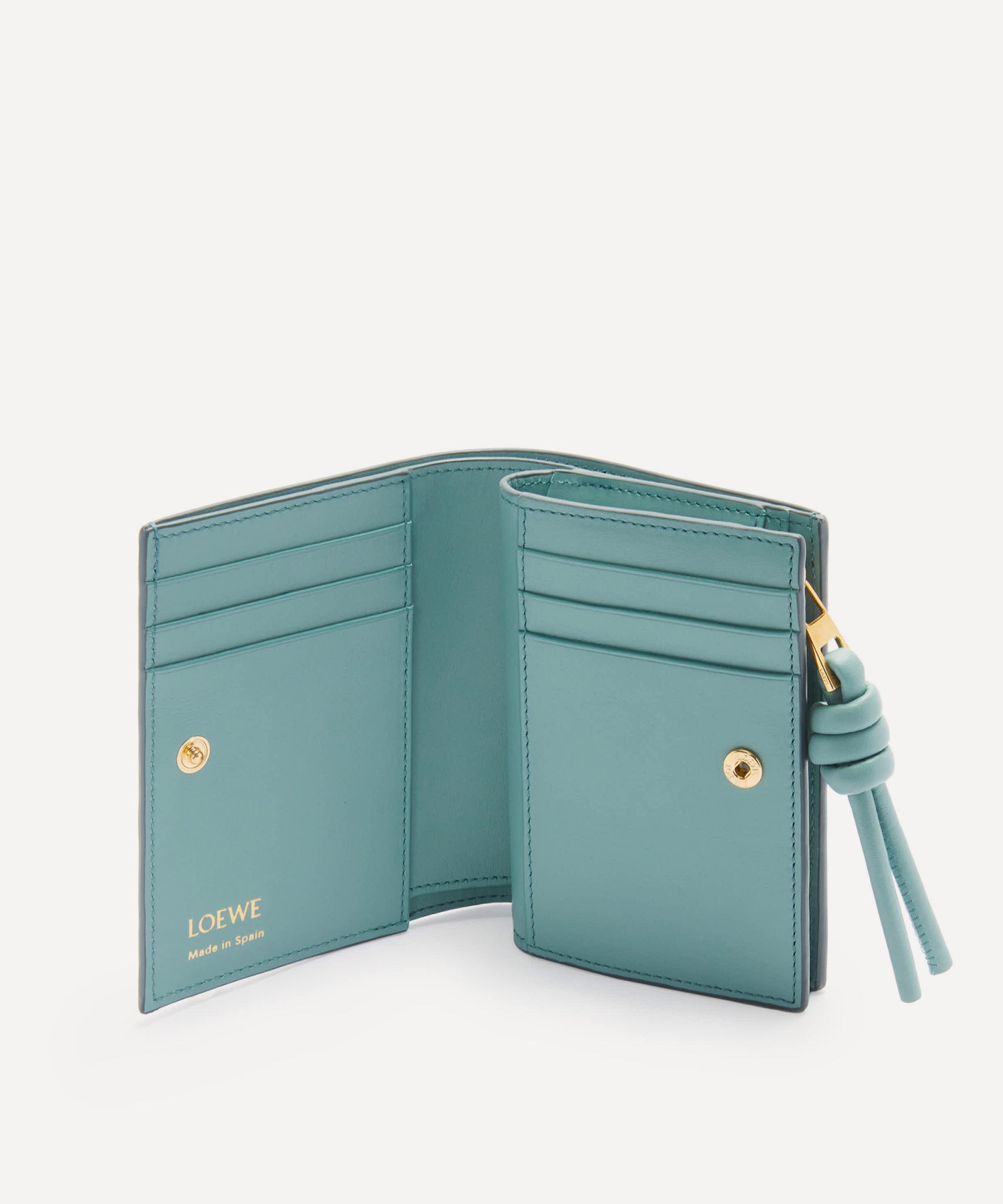 Crafted from shiny nappa calfskin leather, this compact wallet features a classic bifold silhouette with six card slots, a single coin compartment secured with the brand’s signature knot zip pull, three internal slip pockets and a snap button fastening – perfect for slipping into a handbag or jacket pocket to keep cards, coins and notes organised in signature Loewe style.