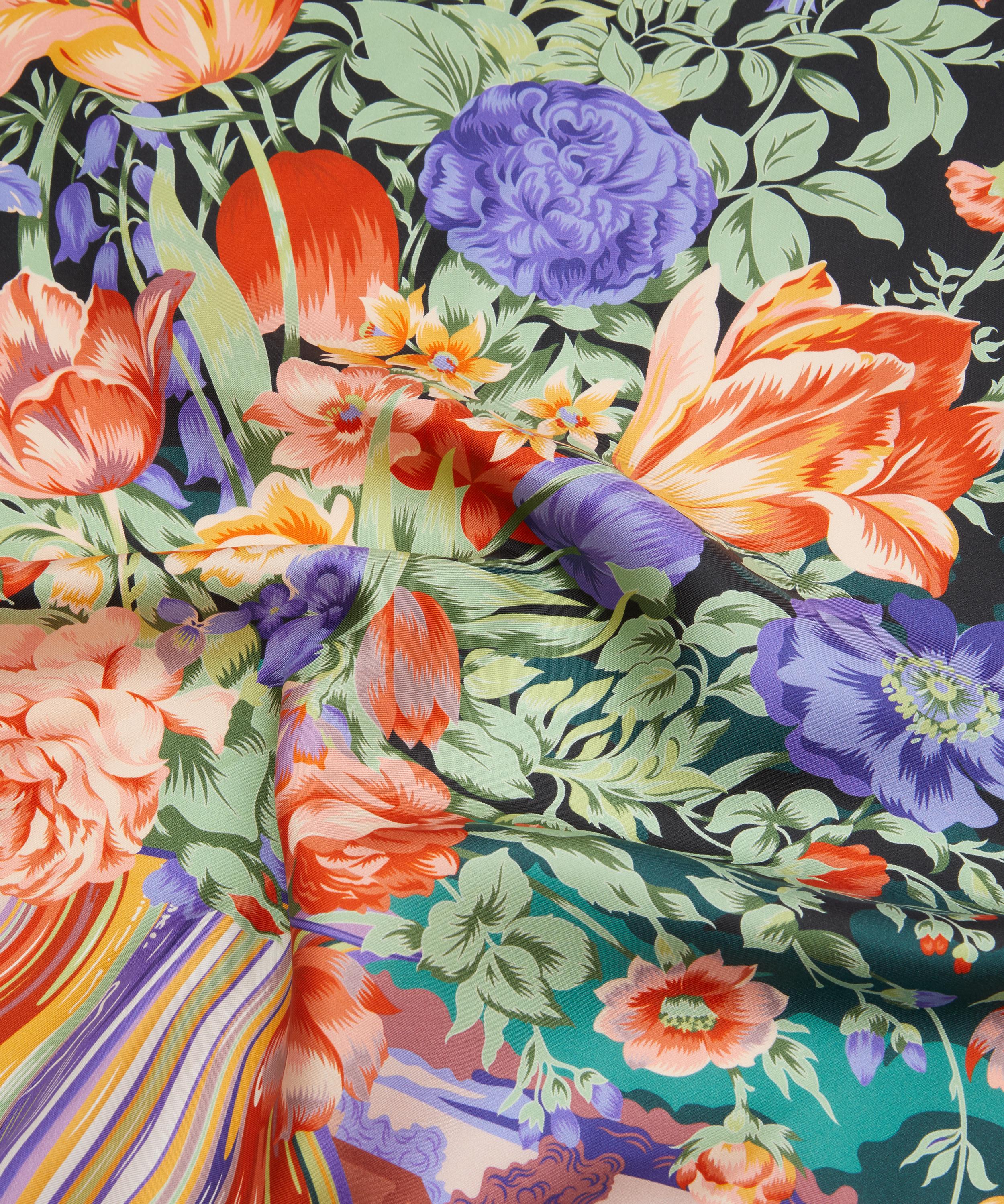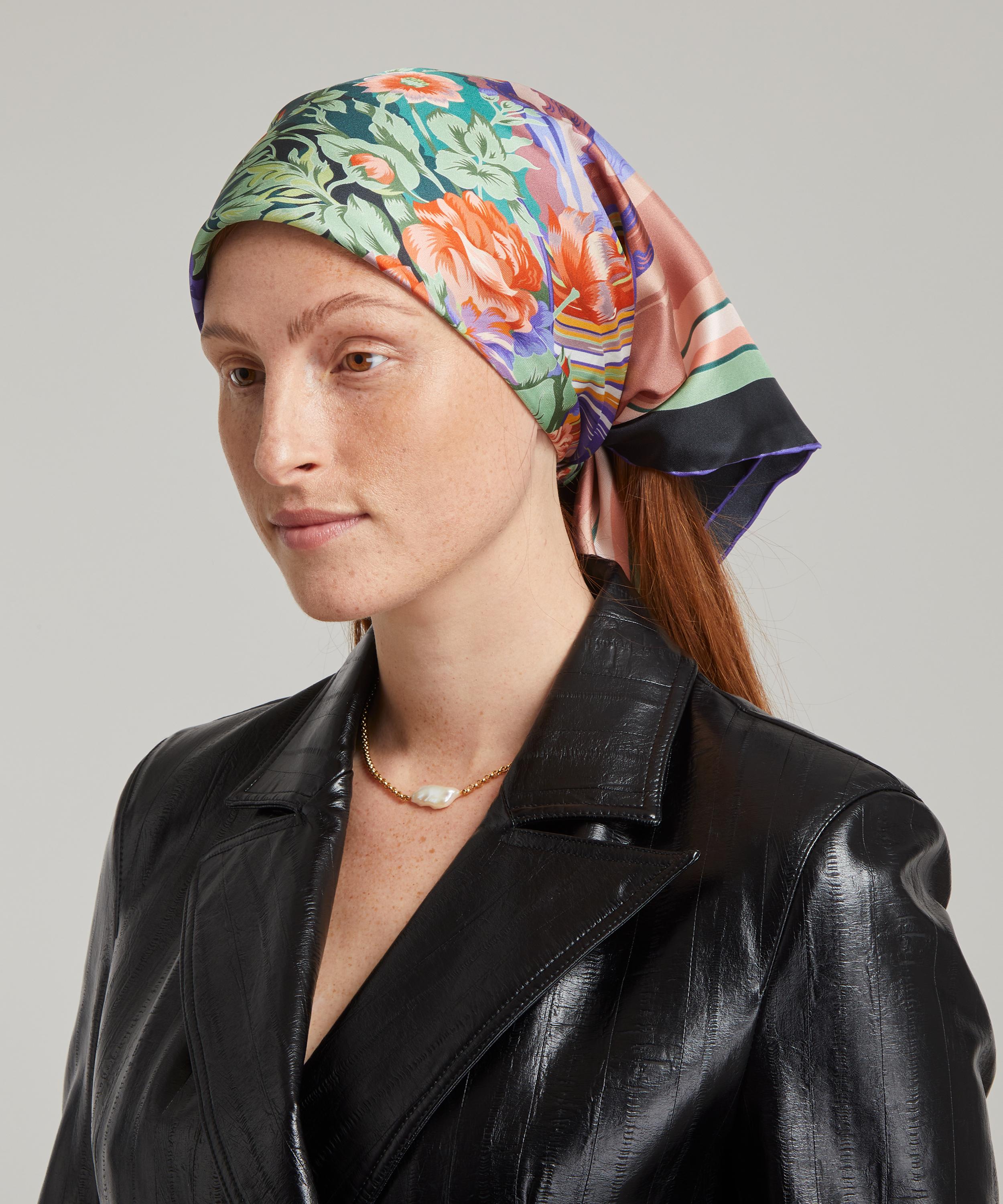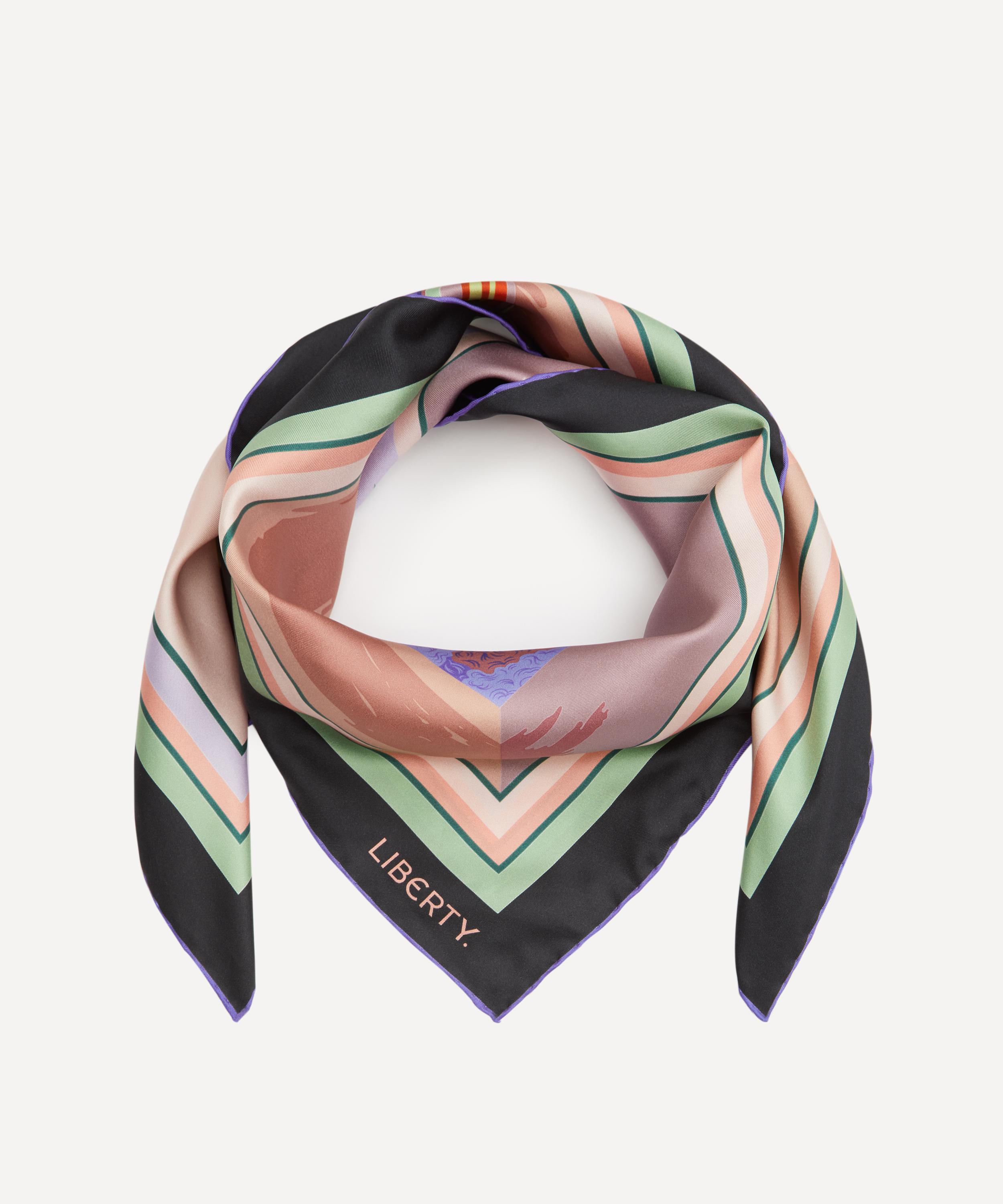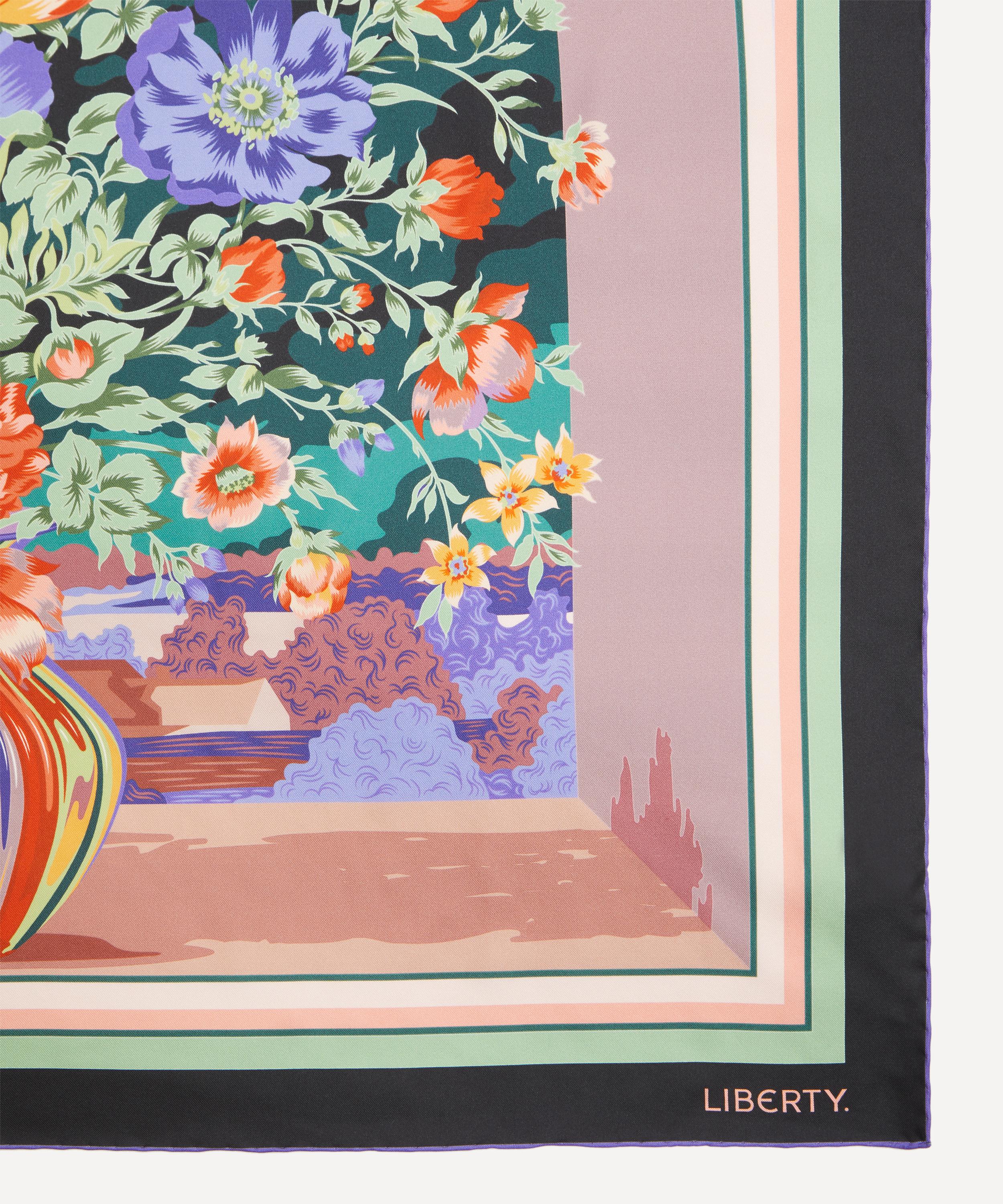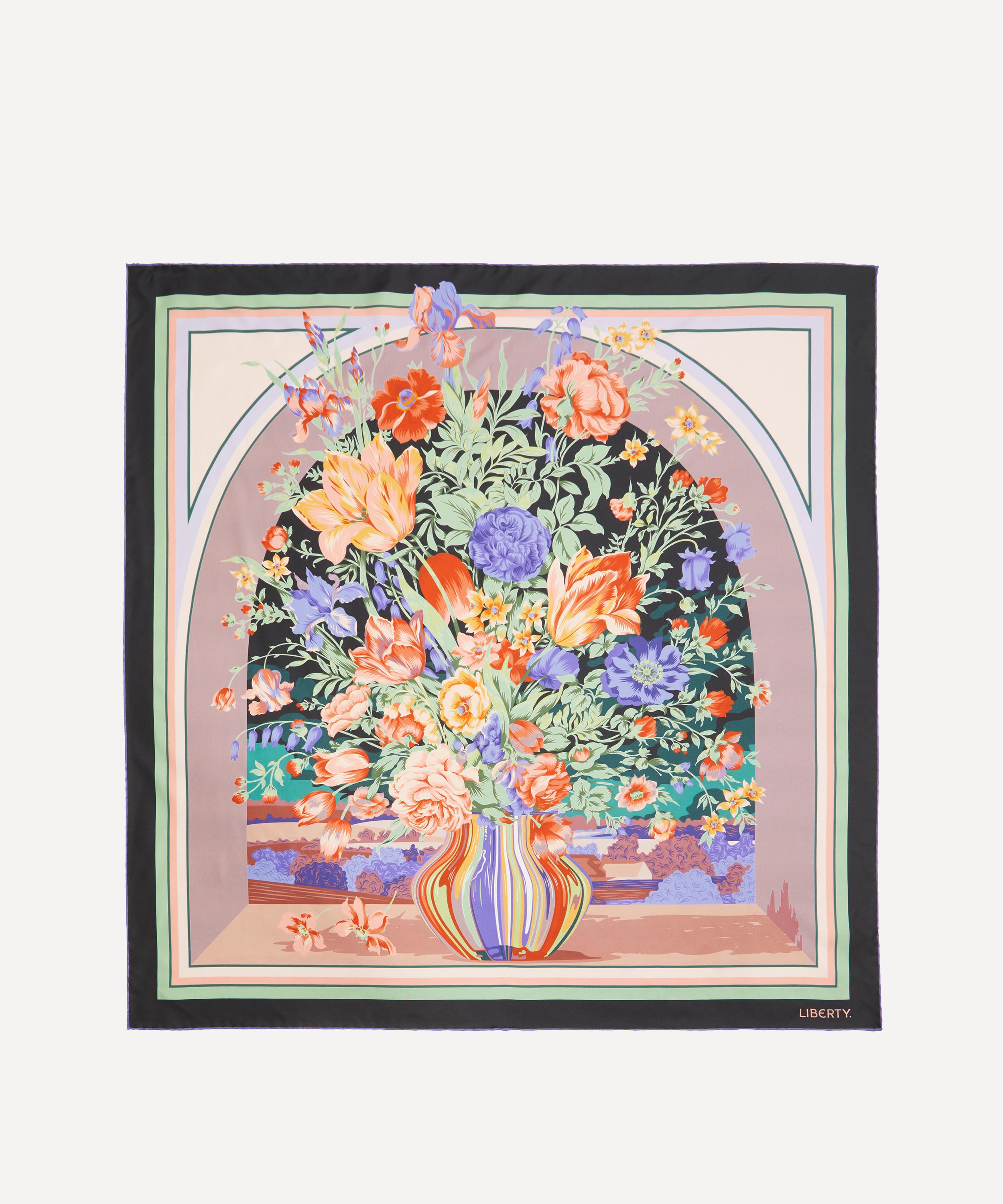 The Vista scarf features a beautifully, hand-painted design draw in our London studio. Loop it around your neck, a Liberty silk scarf is a heroine of versatile styling. New for this season, this scarf is printed with a scenic artwork depicting a view through a window with a floral bouquet at the centre. Each print has been accented with fun colourful borders to add a sporty twist to a Liberty classic.