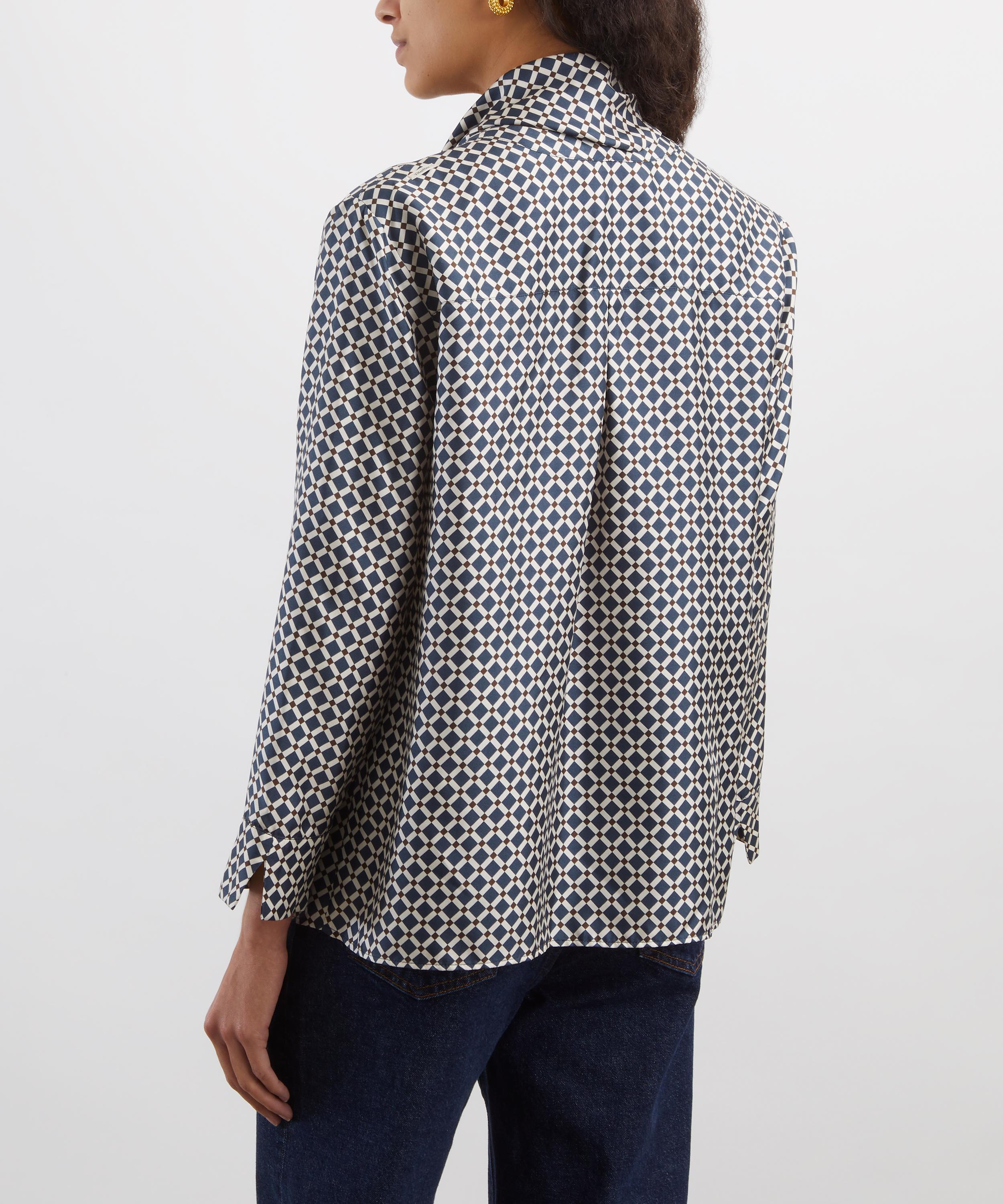 Crafted from pure silk and adorned with a navy geometric print, this shirt is cut in a classic straight fit with a V-neckline and concealed front fastening, and finished with a removable scarf-like sash for a refined yet versatile look.