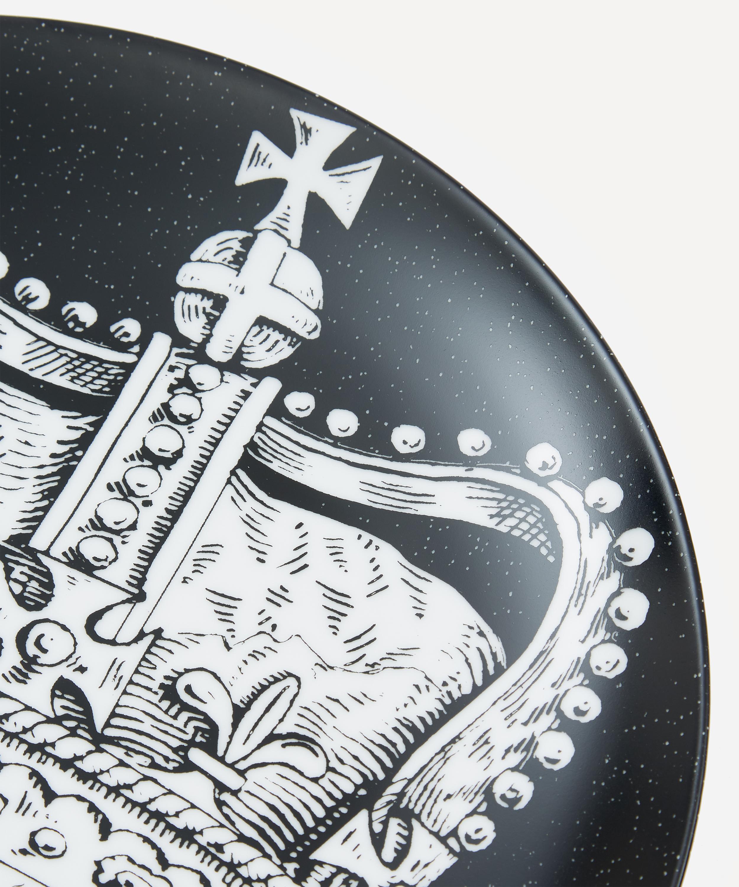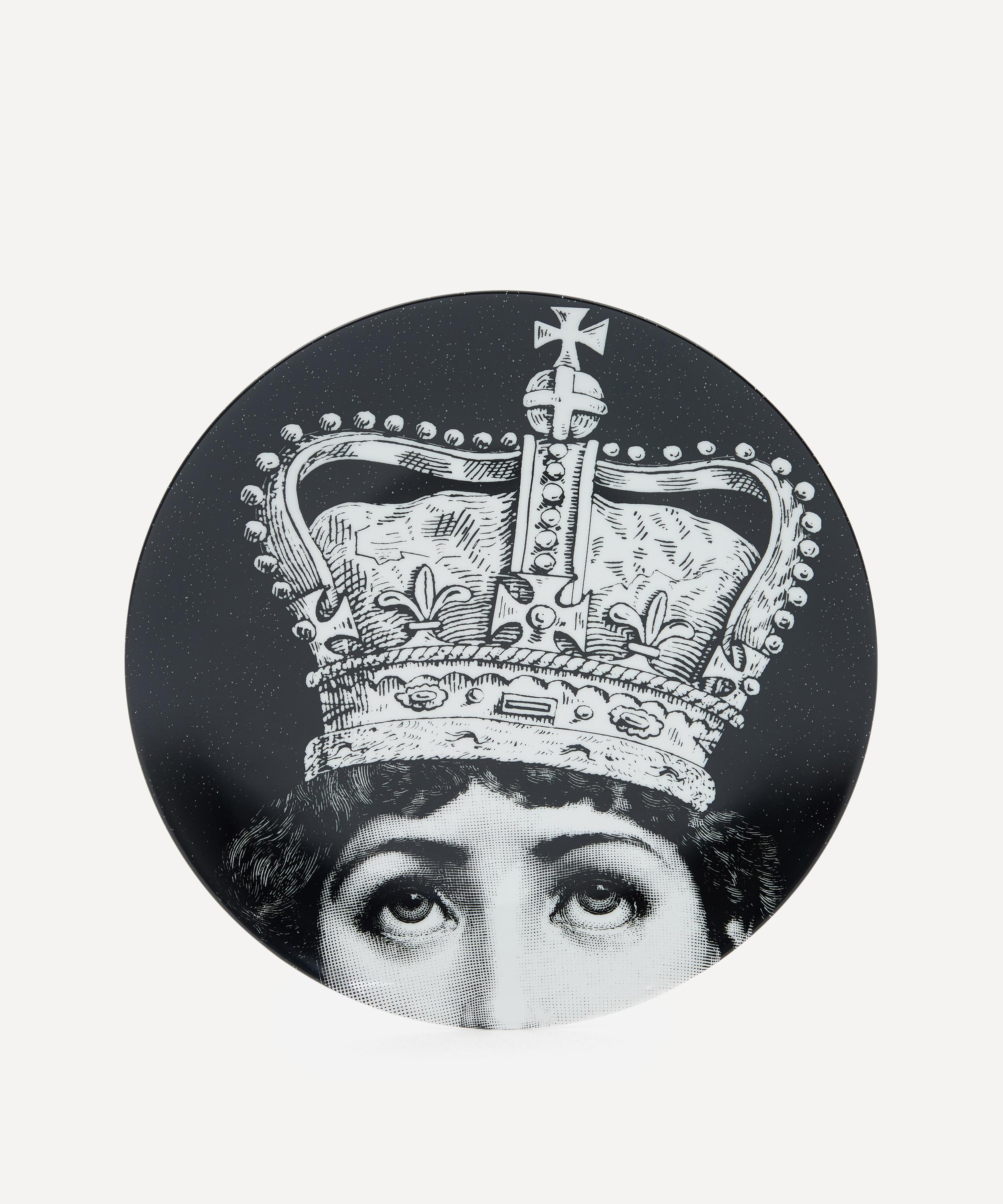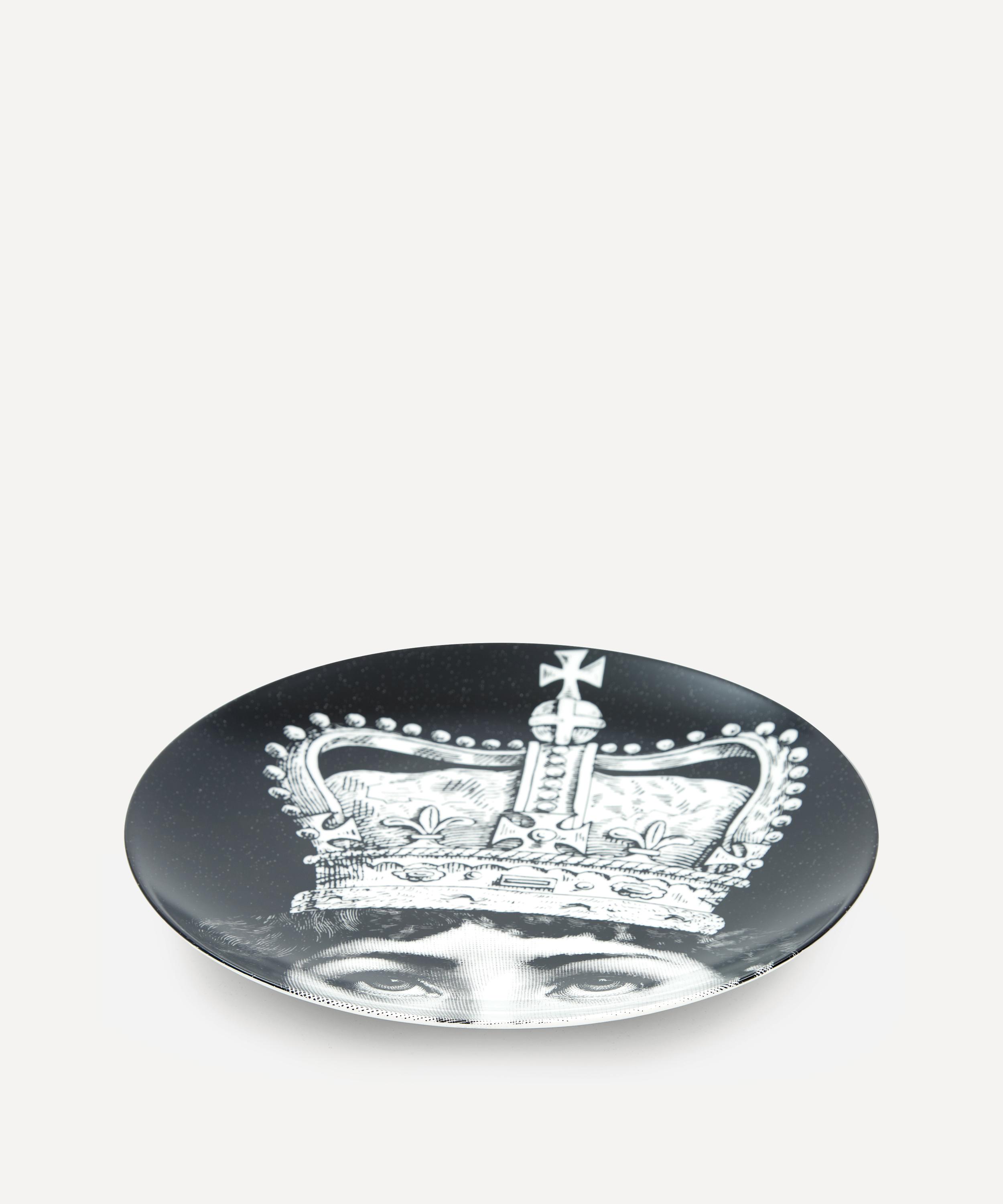 Fornasetti’s decorative plate No. 369 features a regal portrait of Cavalieri, sporting a bejewelled crown. Handcrafted from fine porcelain in Italy, this plate is a must-have for vibrant art and design enthusiasts. Hang it above your mantelpiece or in a hallway for an enigmatic addition to your living space.