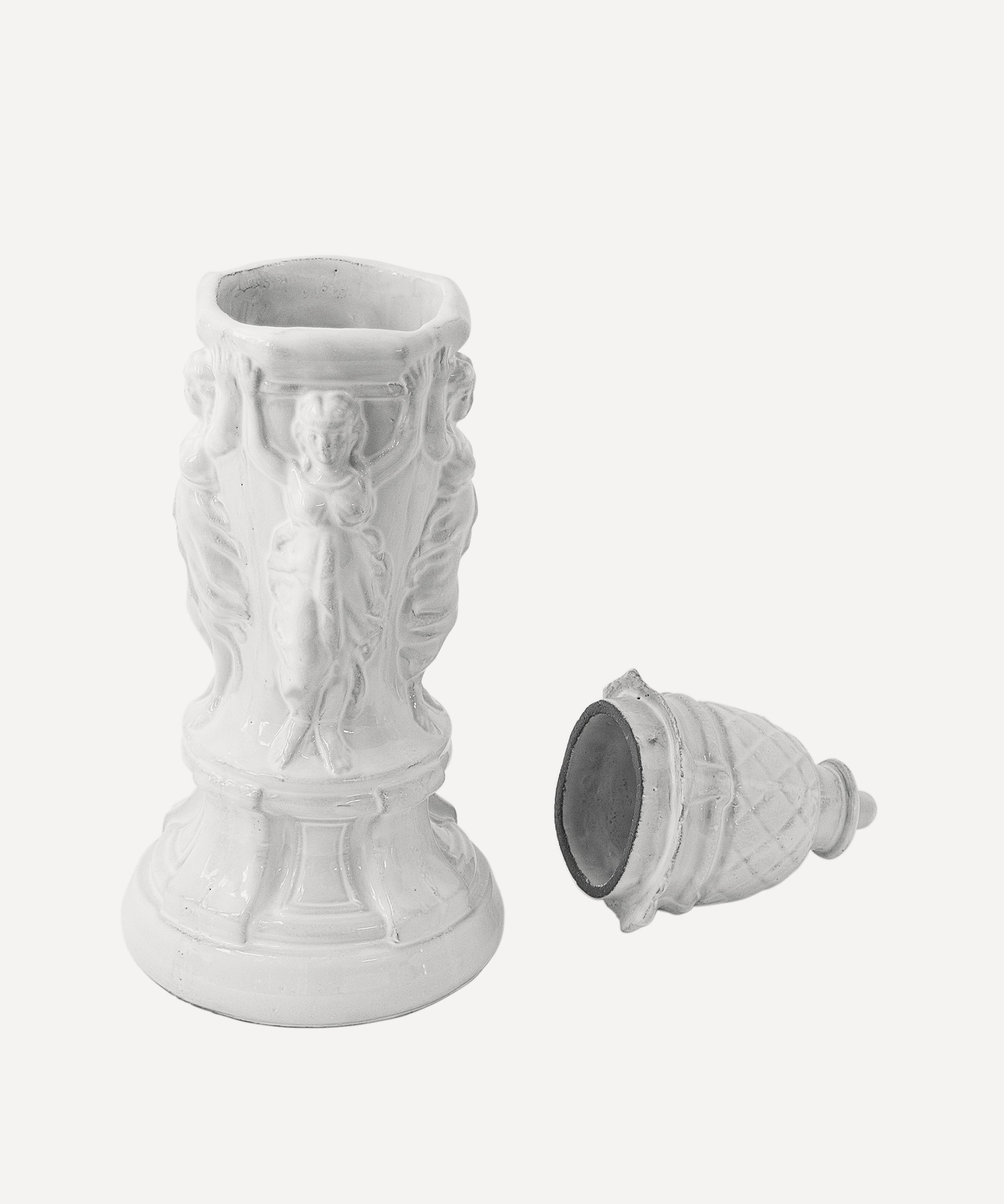 The celebrated ceramics maison crafts this piece by hand in its Parisian workshop, using black terracotta clay and a signature glossy white glaze to create a unique, one-of-a-kind finish that’s amplified by the natural drying process. Inspired by Parisian fountains and hallmarked with the Astier de Villatte monogram and the initials of the artisan who crafted it, it adds understated grace to your home.