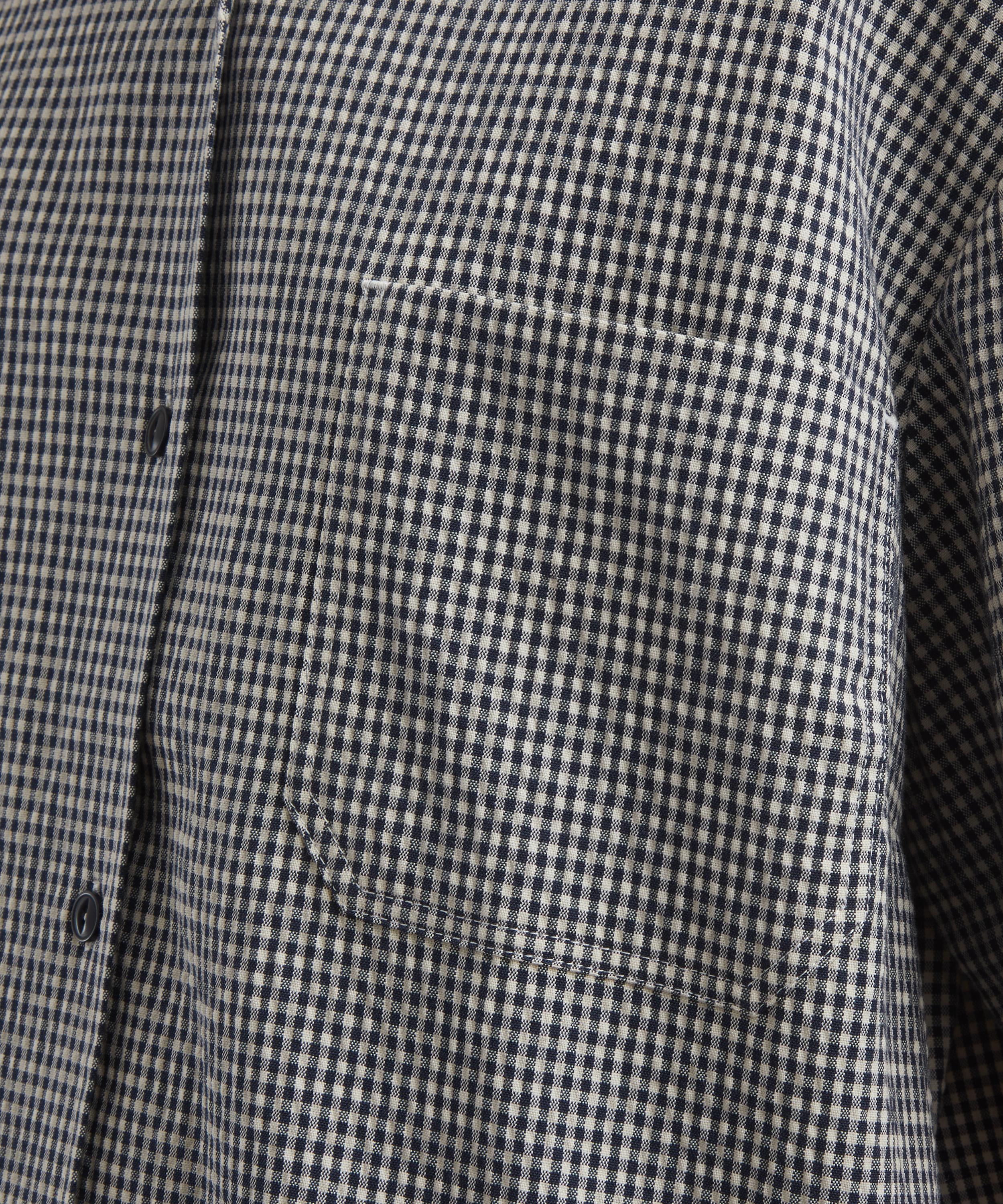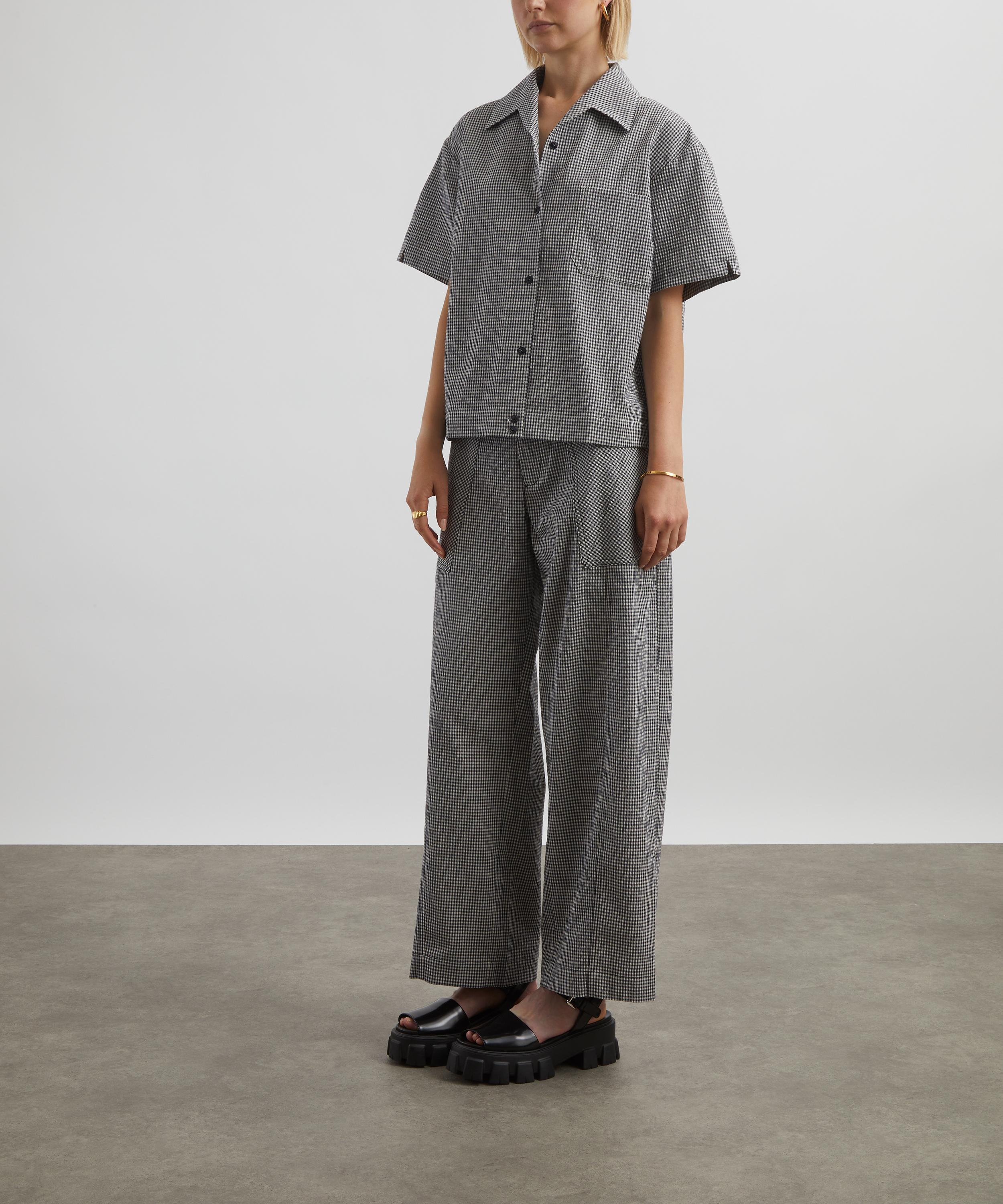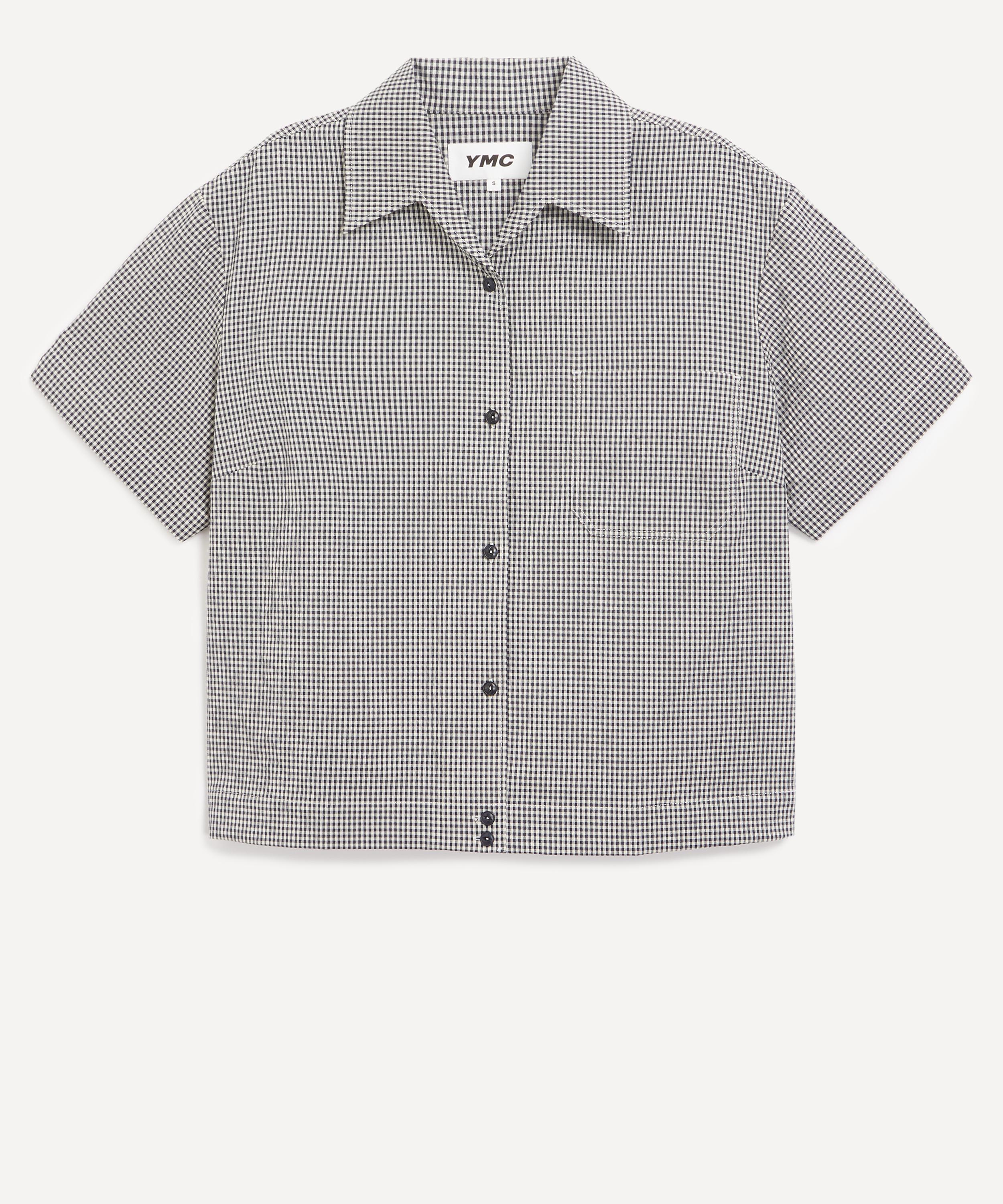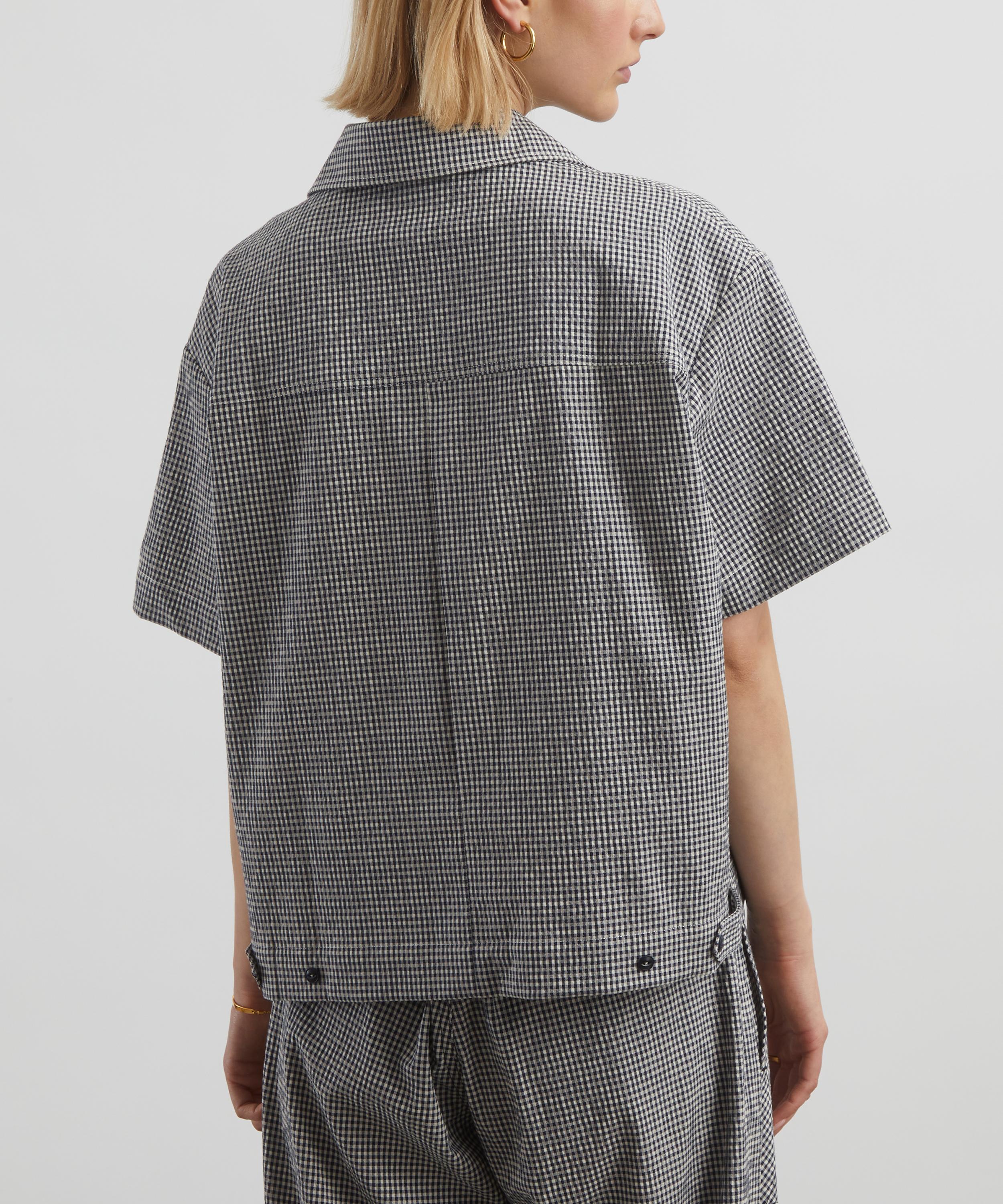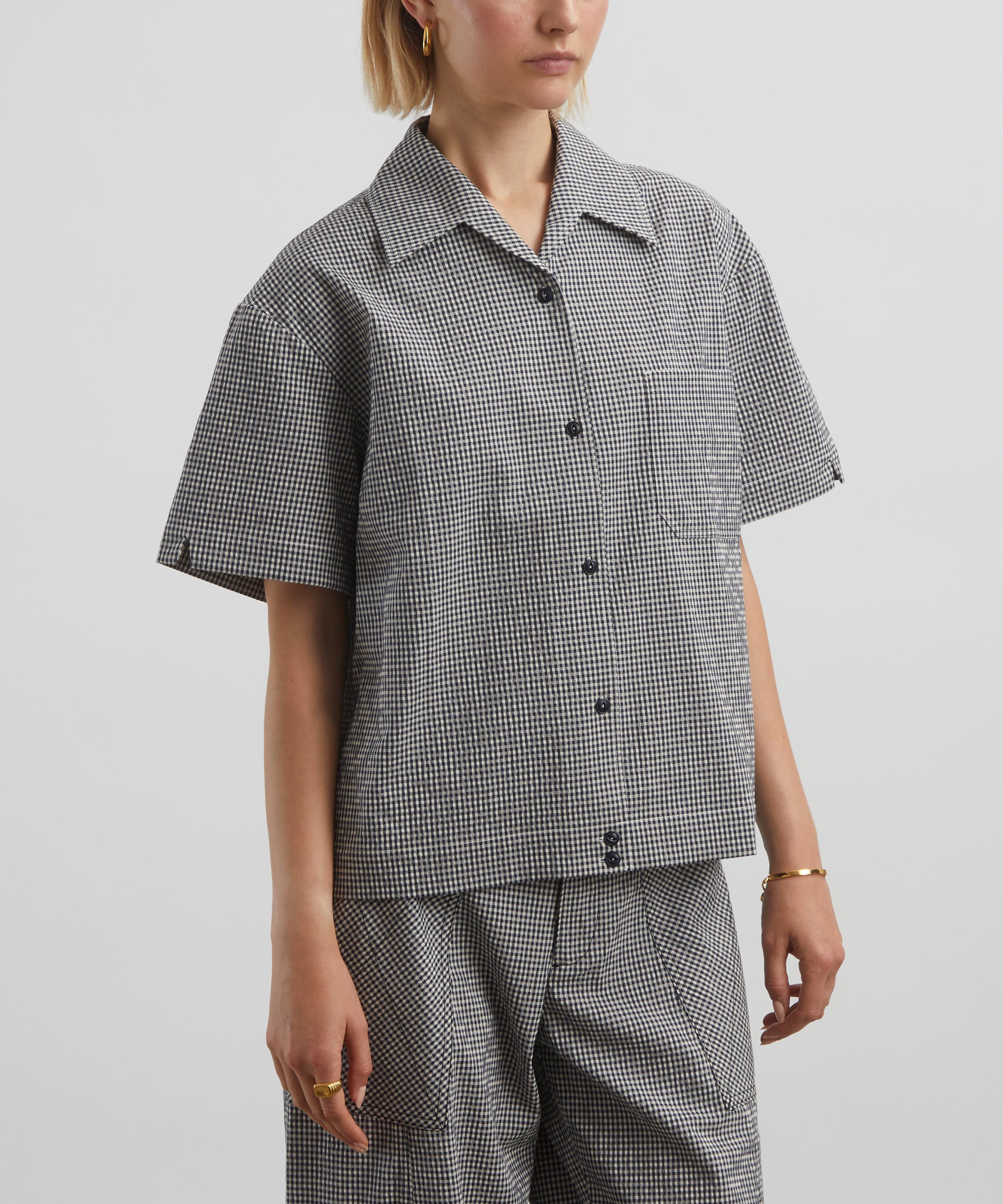 Crafted from an Italian crinkle cotton blend presenting an all-over mini check pattern, this shirt offers a boxy fit with short sleeves, a corozo button front fastening, and a single patch pocket to the chest. Pair with the Peggy trousers for an effortless, understated co ord.