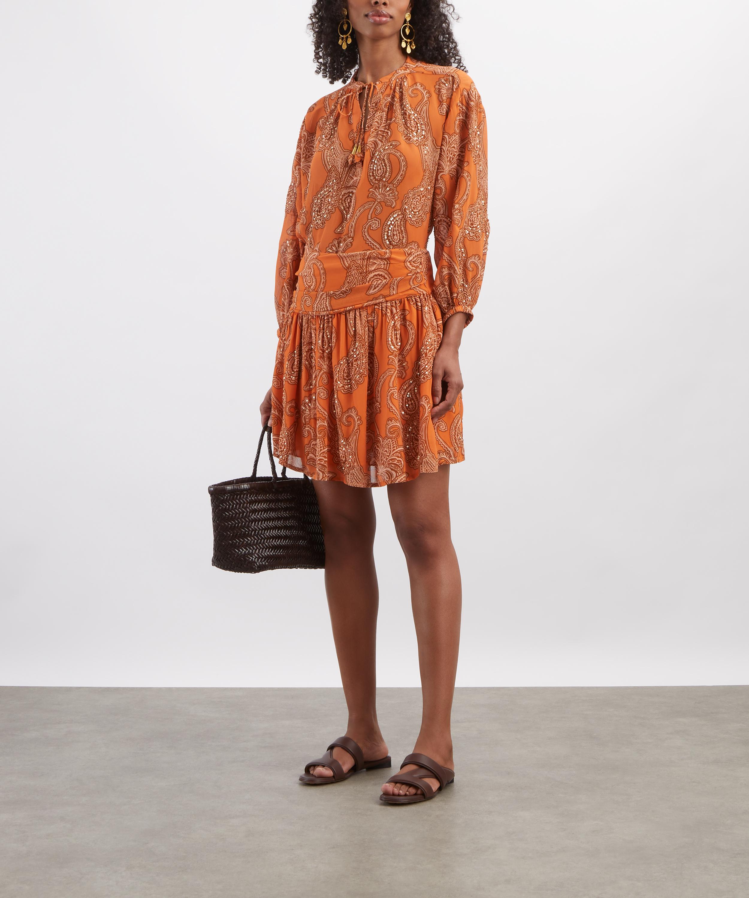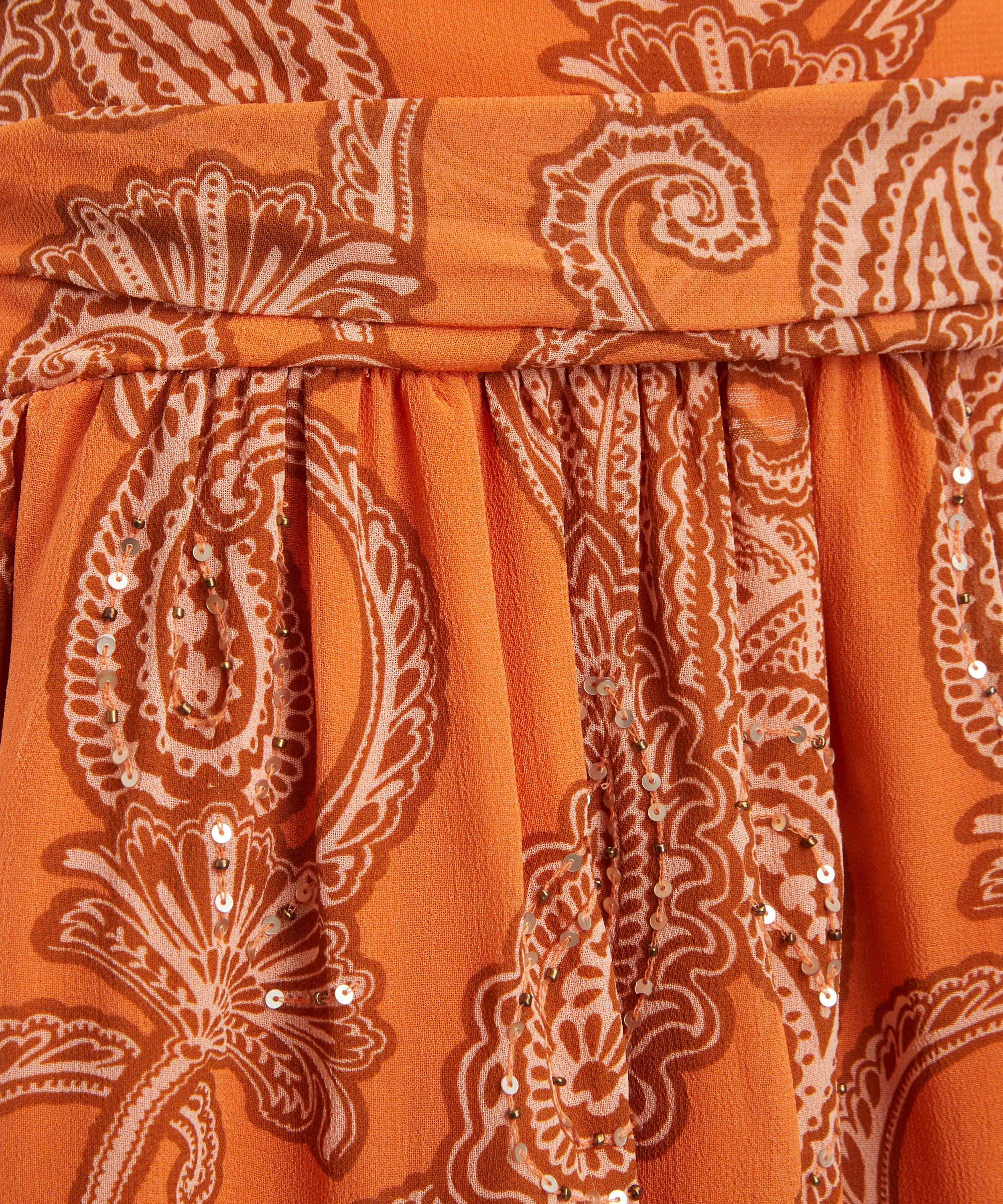 A beautiful blend of comfort and craftsmanship, it’s crafted from a lightweight, flowy viscose georgette, falling just above the knee, featuring a wide waistband. The skirt is rendered in an ornamental paisley print, embellished with gold sequins and beadwork for an artisanal touch. Pair with the Hina Top for a coordinated look.