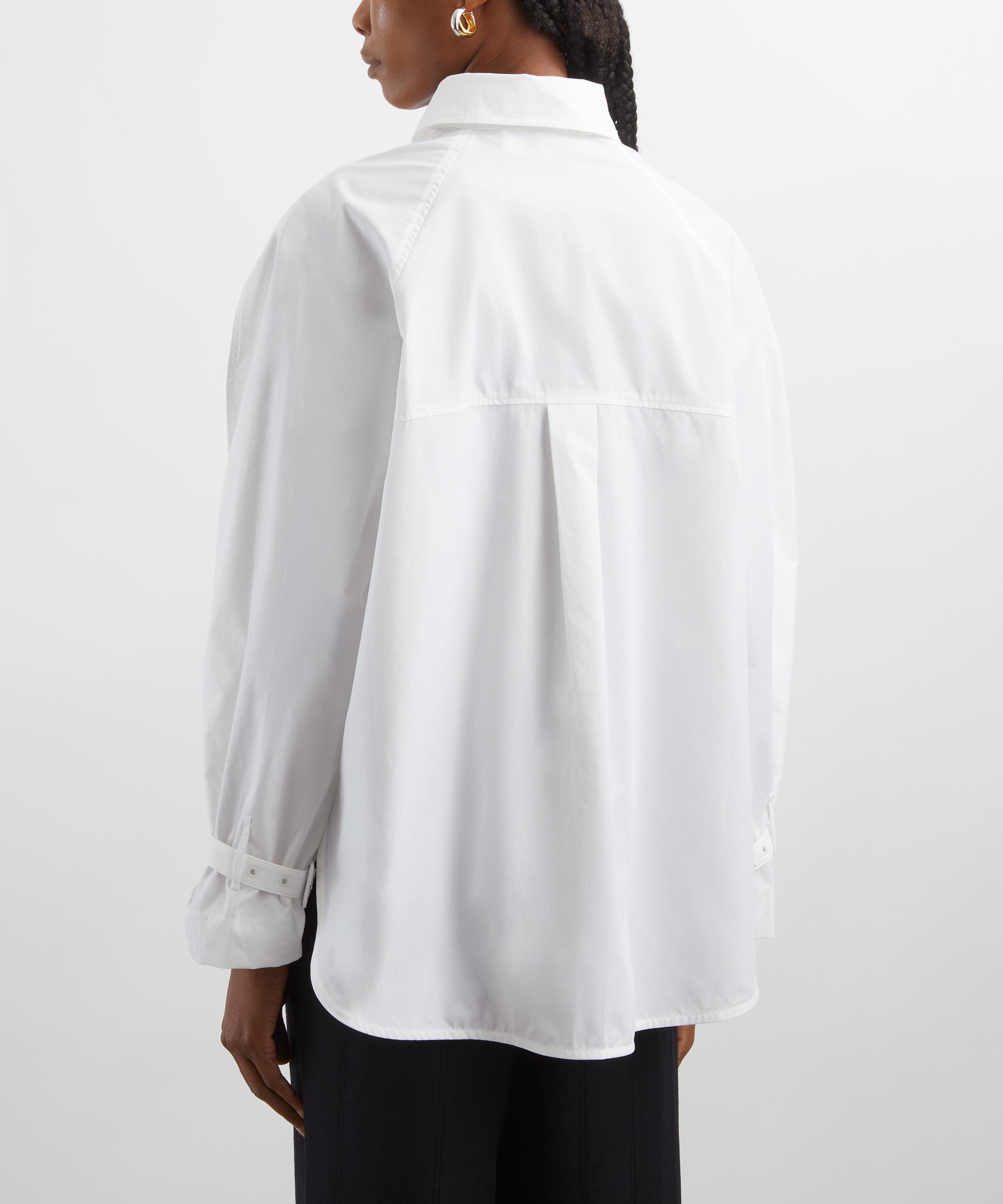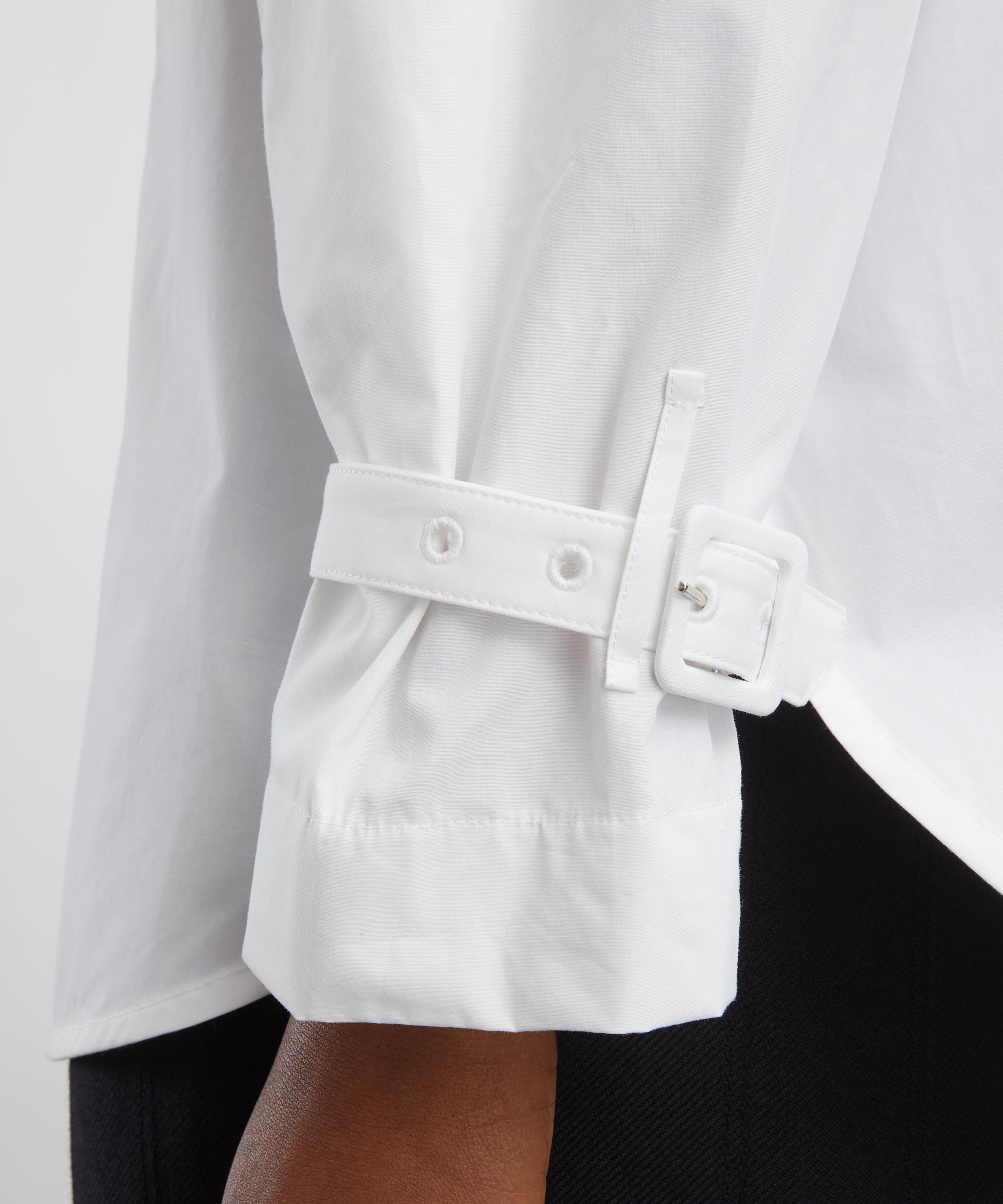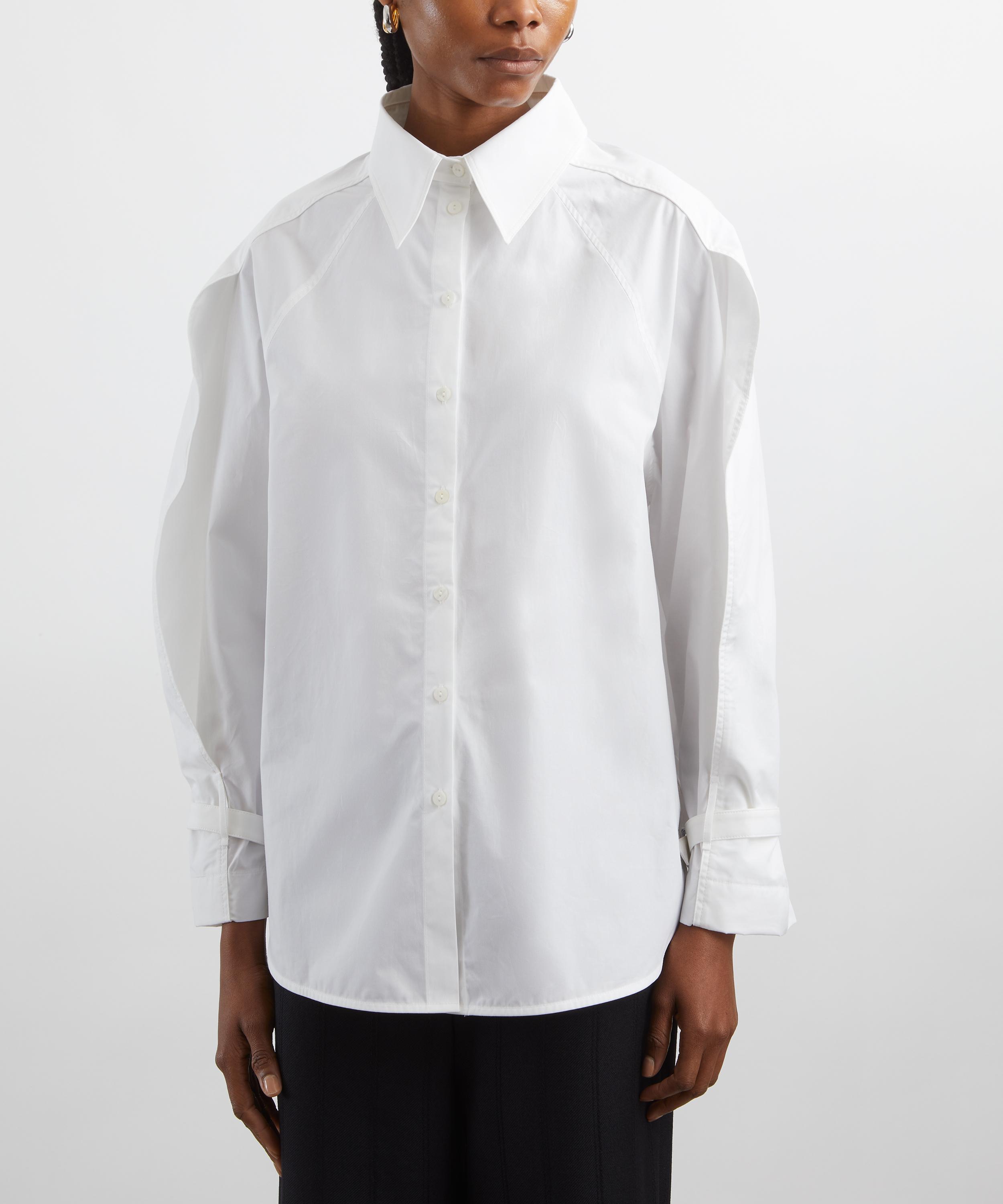 Crafted from crisp white cotton poplin, this shirt takes cues from minimalist and architectural design, featuring sculpted balloon sleeves finished with belted cuffs for a sharp, tailored look.