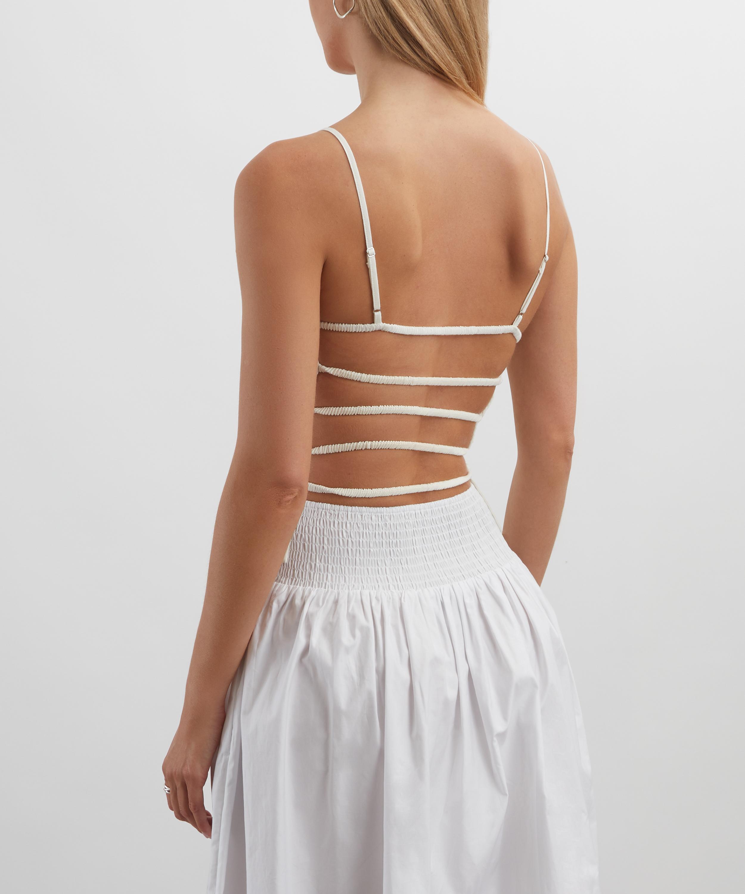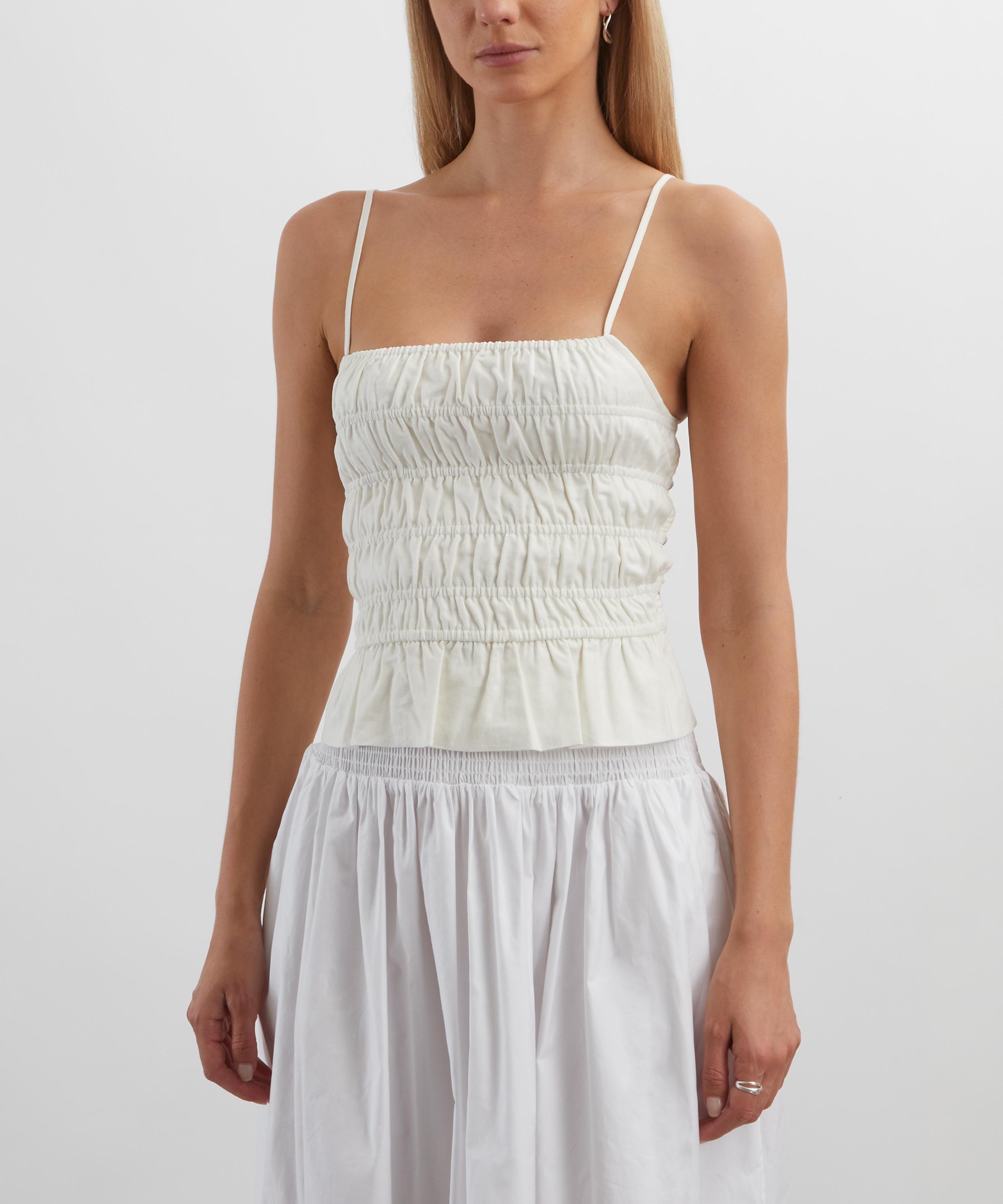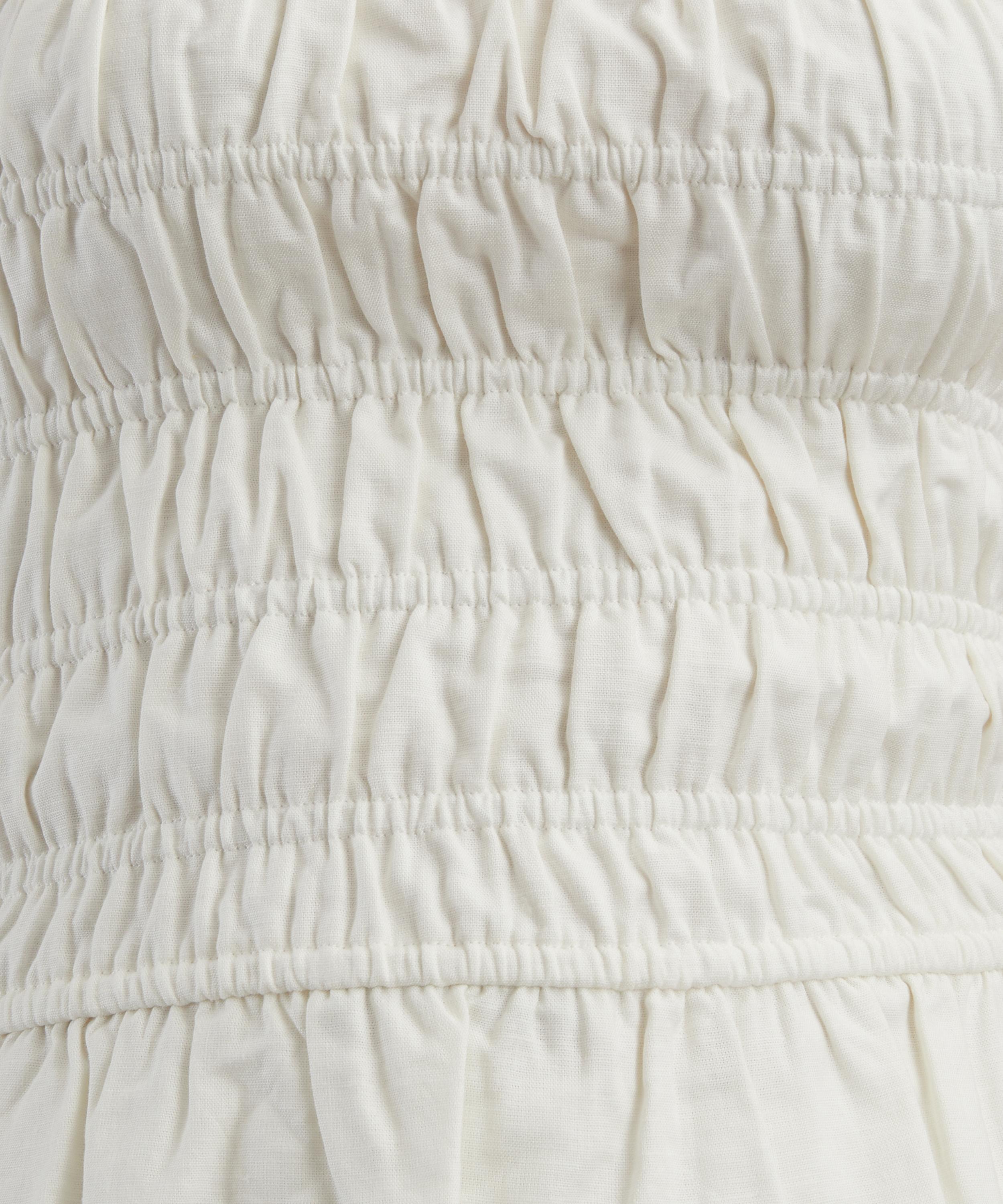 A fresh take on a best-selling silhouette, this linen summer top features adjustable straps, elastic-encased back straps, and delicate smocking with a ruffled hem. Cropped at the waist, it’s a breezy, feminine staple for effortless warm-weather styling.