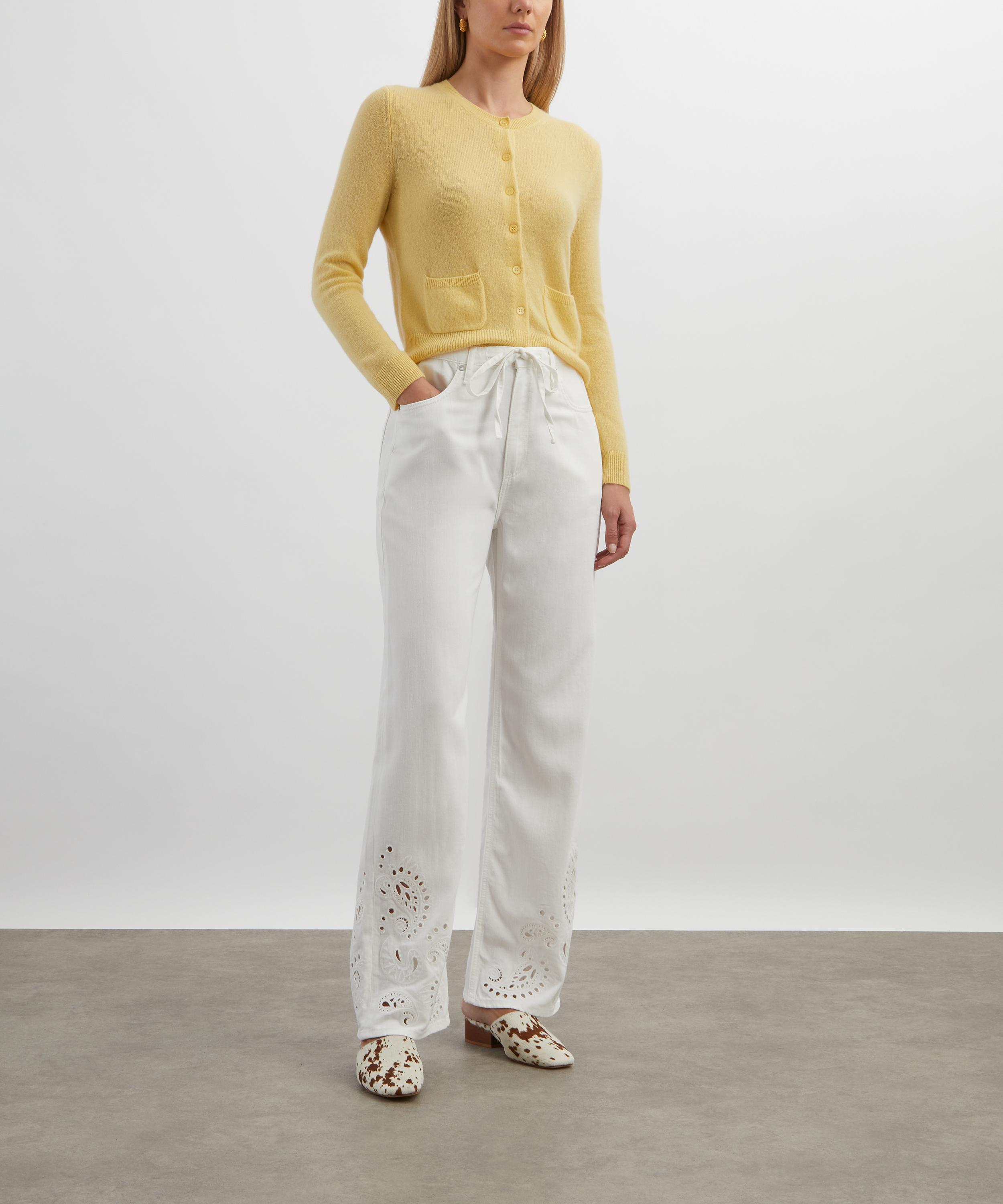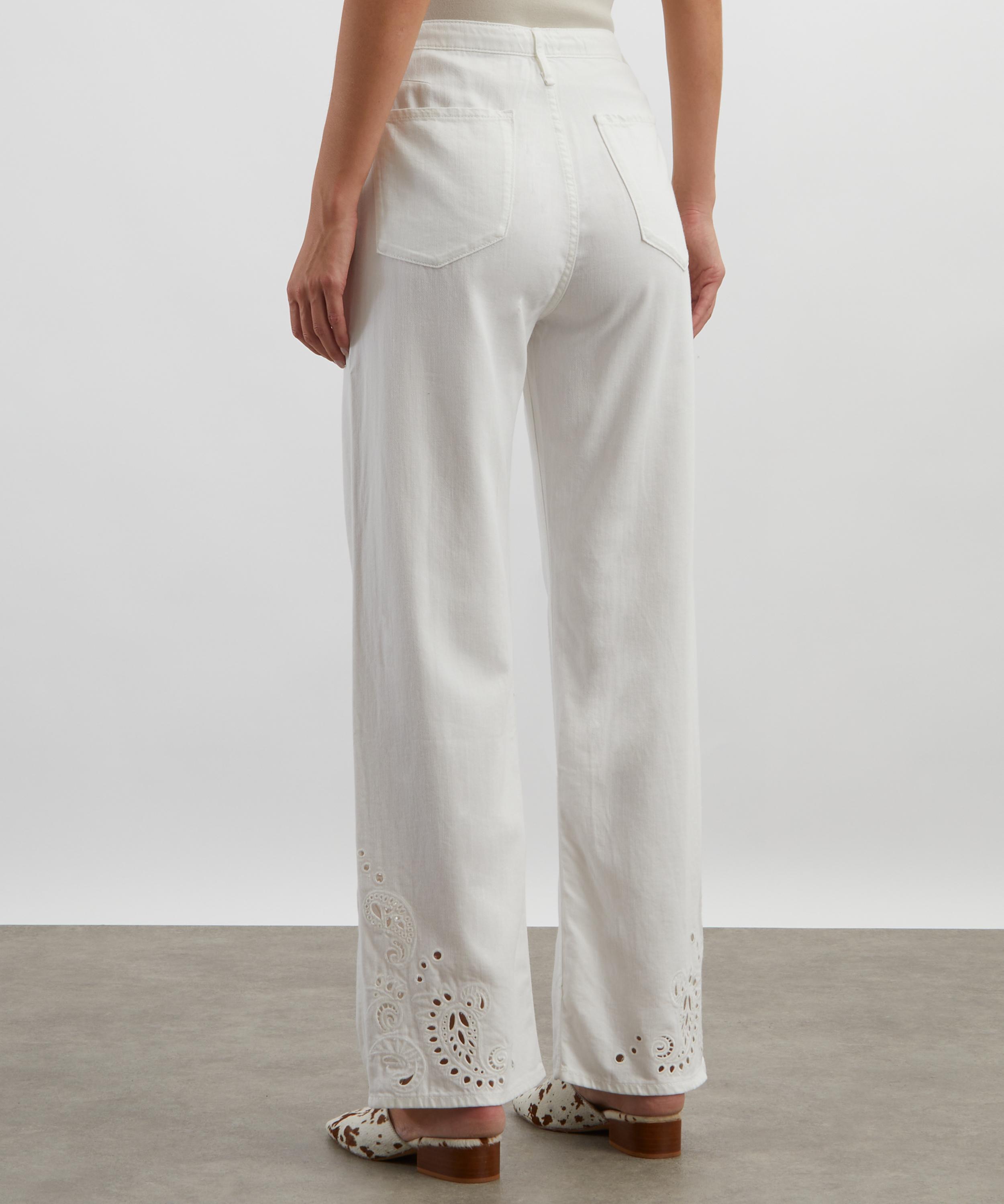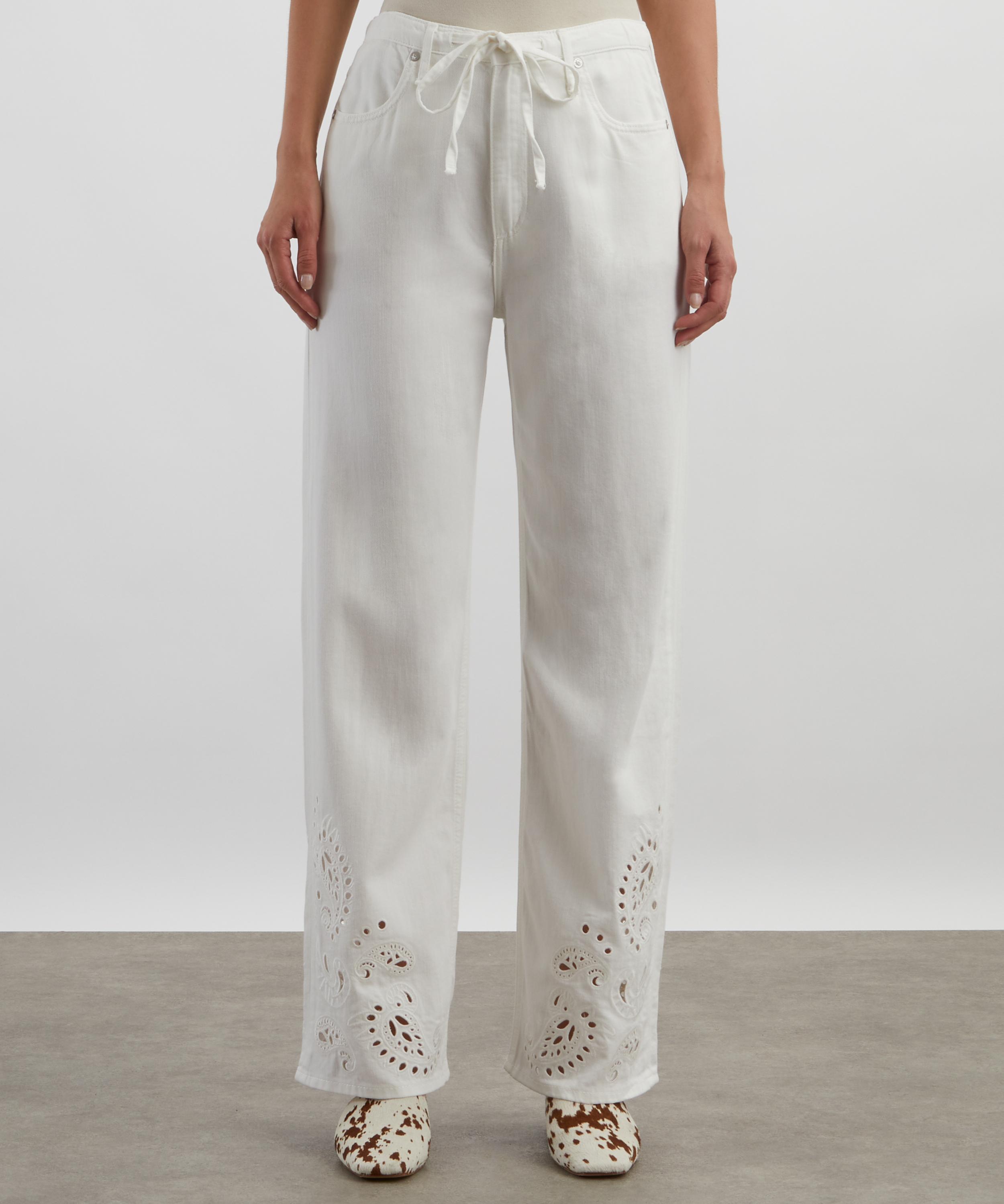 Crafted from Ultra Featherweight denim, the Phoebe Beach Pant is a mid-rise style with a relaxed fit and drawstring waistband, made for warmer days. In White Eyelet, a crisp white wash with embroidered paisley cutouts at the hem, they’re the perfect summer pair for the beach - and beyond.