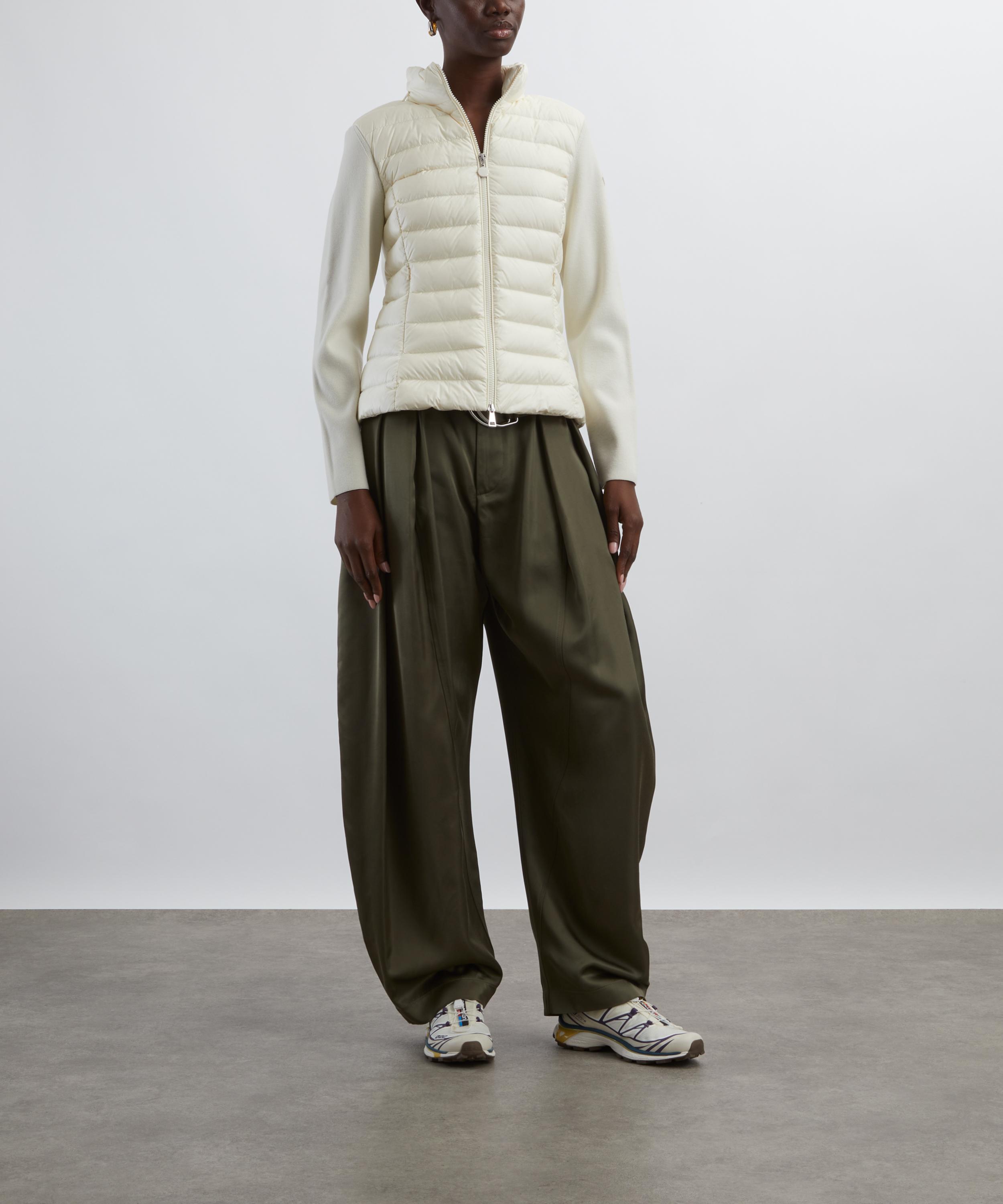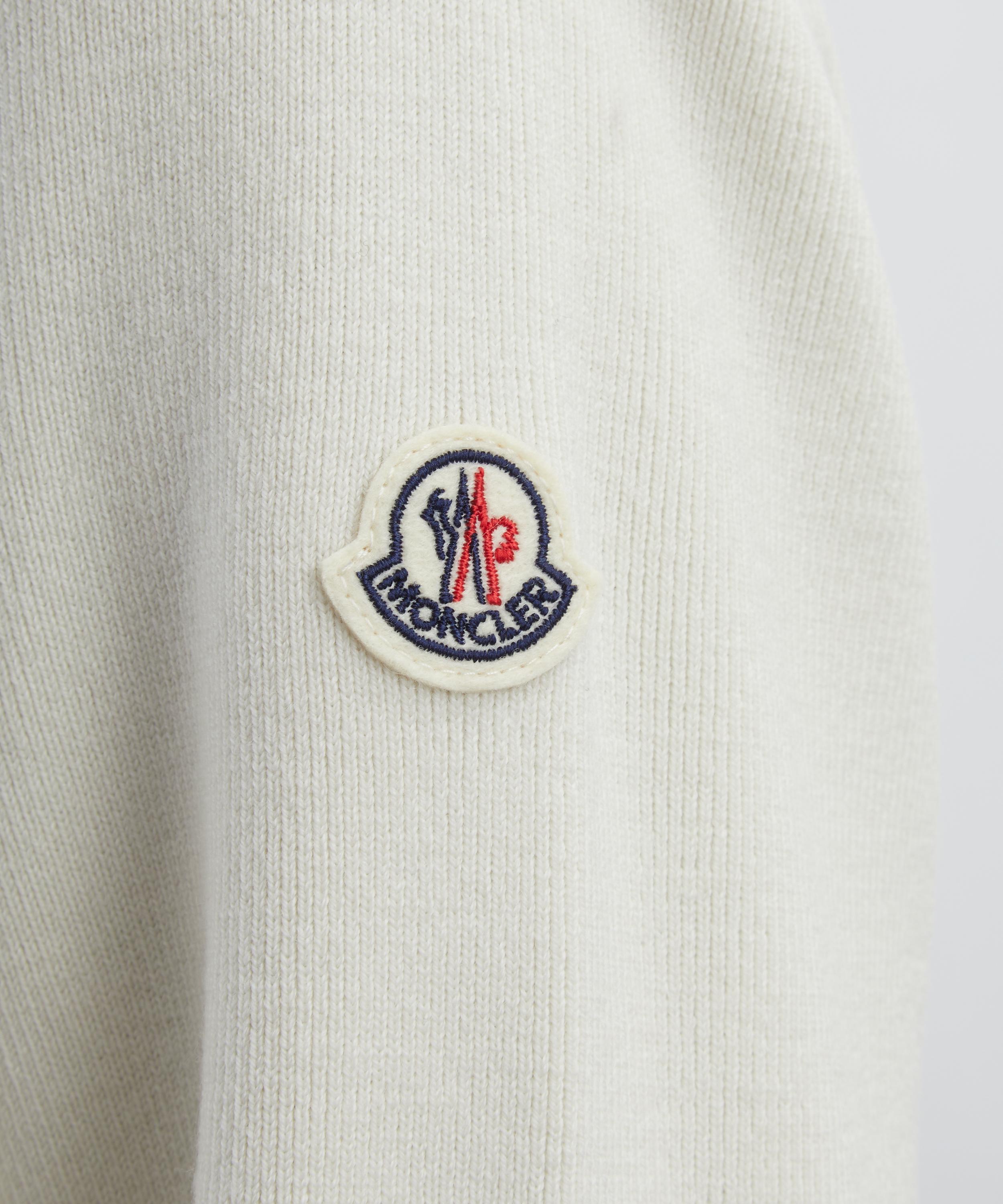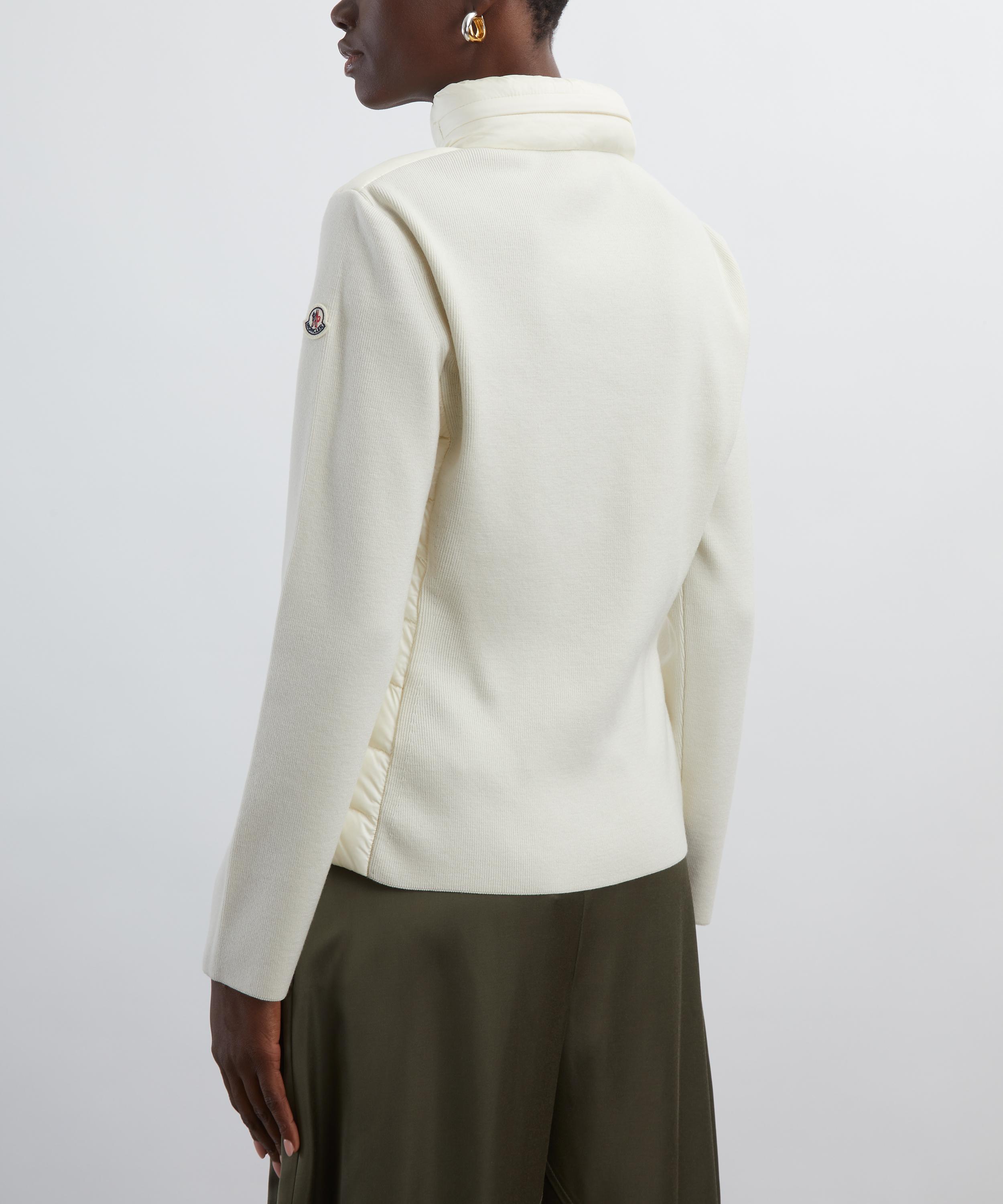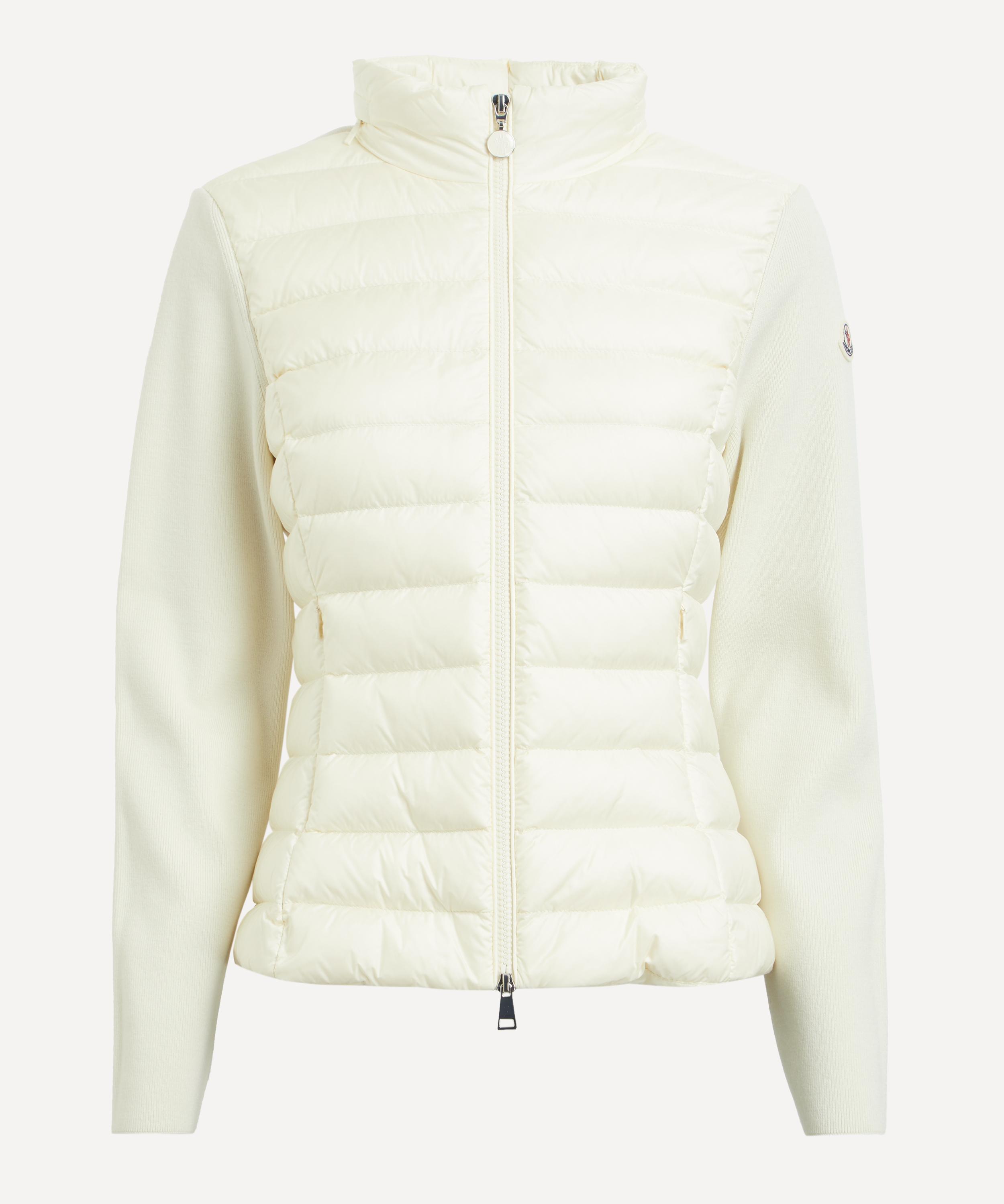 The White Ivory Padded Wool Zip-Up Cardigan from Italian lifestyle brand Moncler displays the slick finishes and technical tailoring the brand is known for.