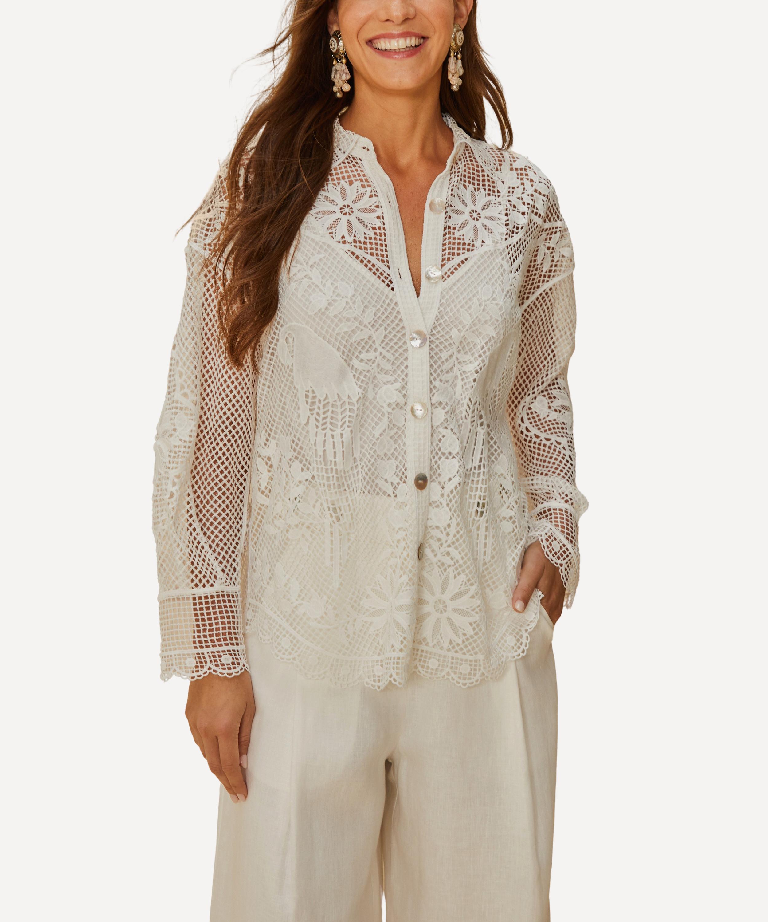 The White Landscape Guipure Shirt enchants with intricate lacework in rich emerald tones, featuring playful parrot and floral motifs. With a collar neckline and flowing silhouette, it blends elegance and tropical whimsy - bringing lush, garden-inspired charm to any look.