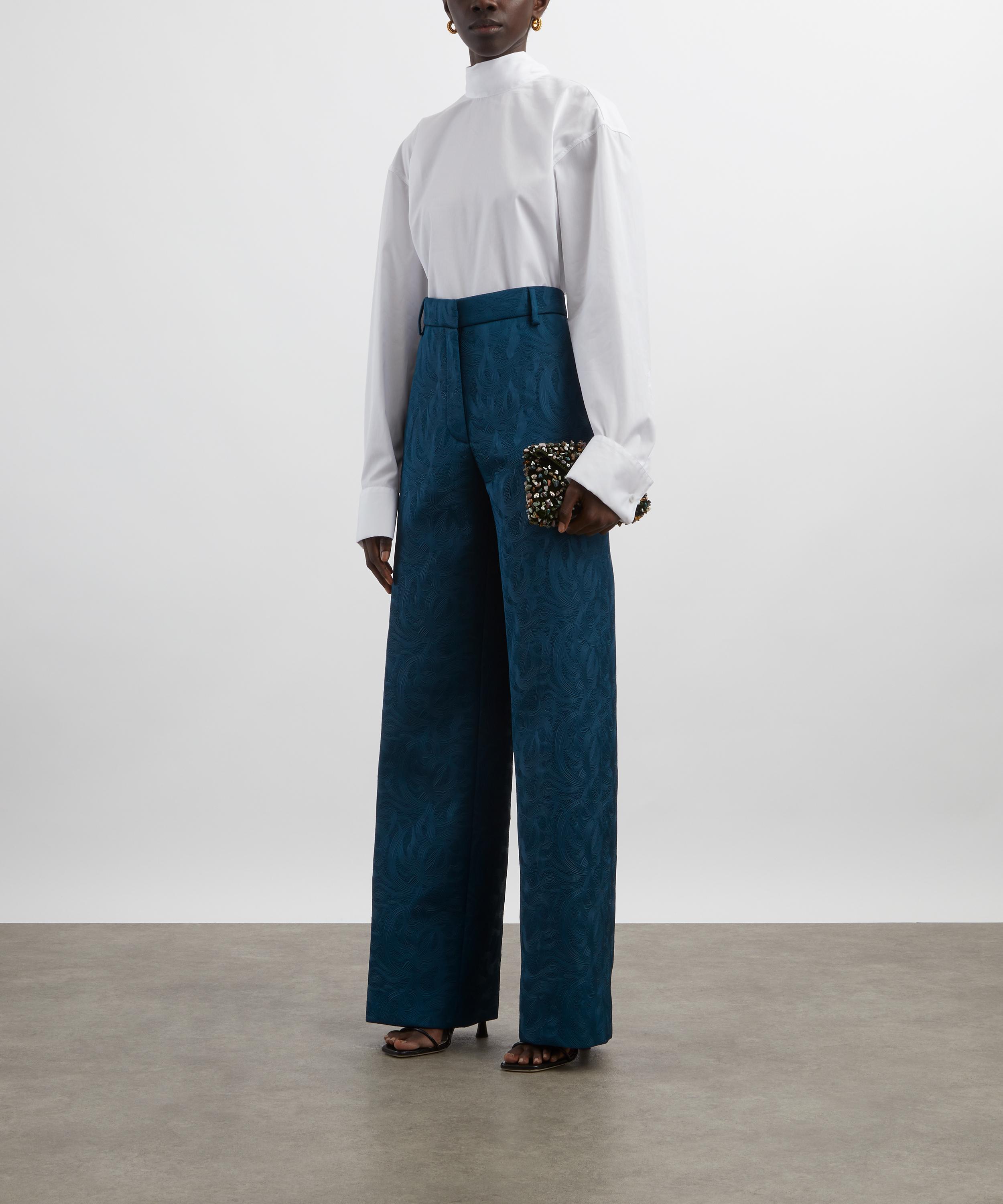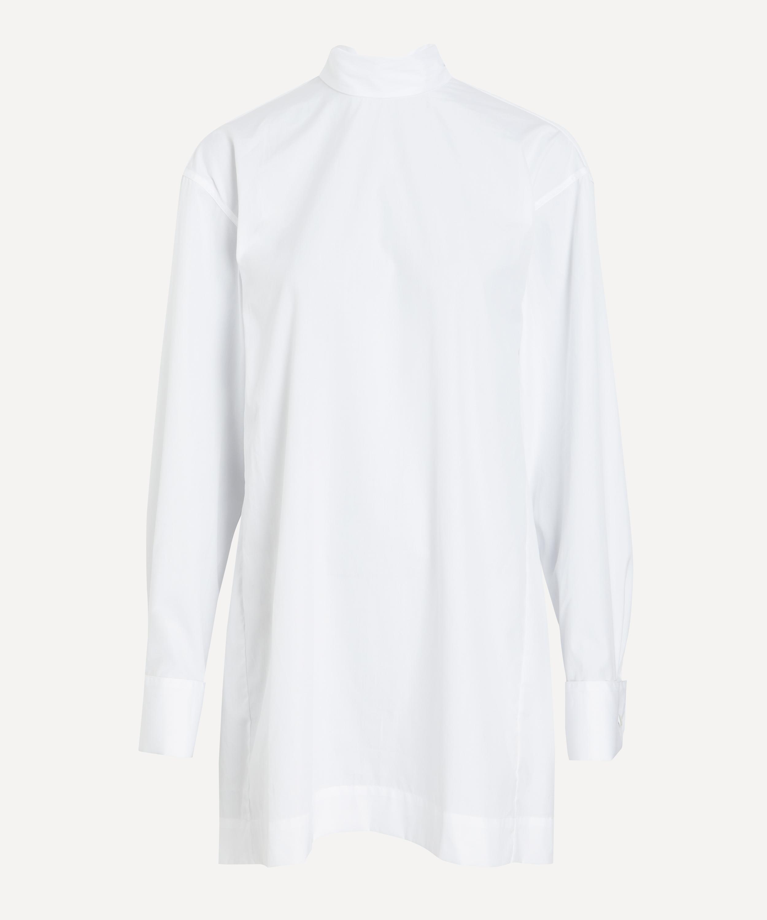 Cut from crisp cotton, this shirt features a relaxed, draped silhouette with dropped shoulders, long sleeves, and an effortlessly chic pussy-bow collar that offers versatile styling options.