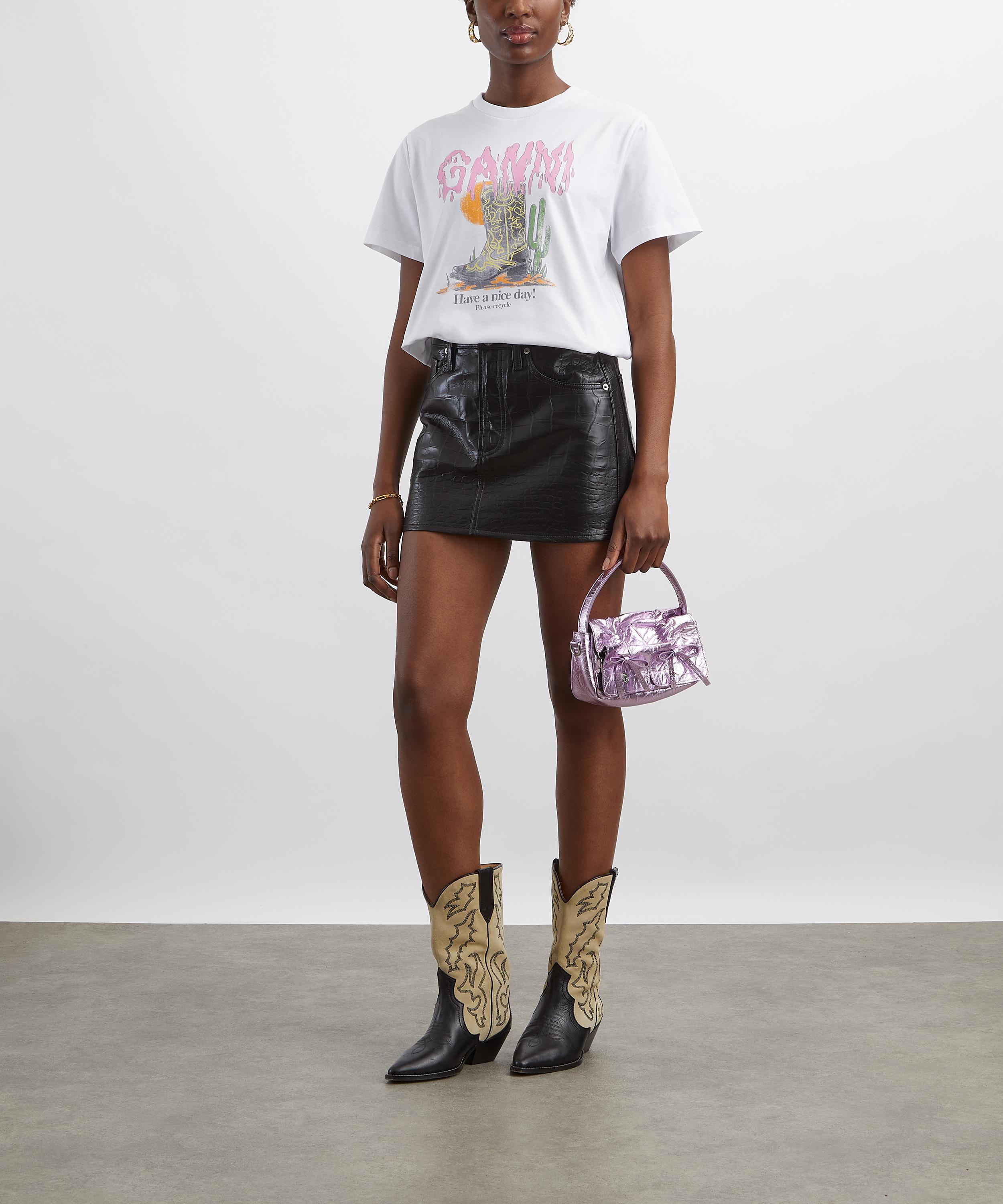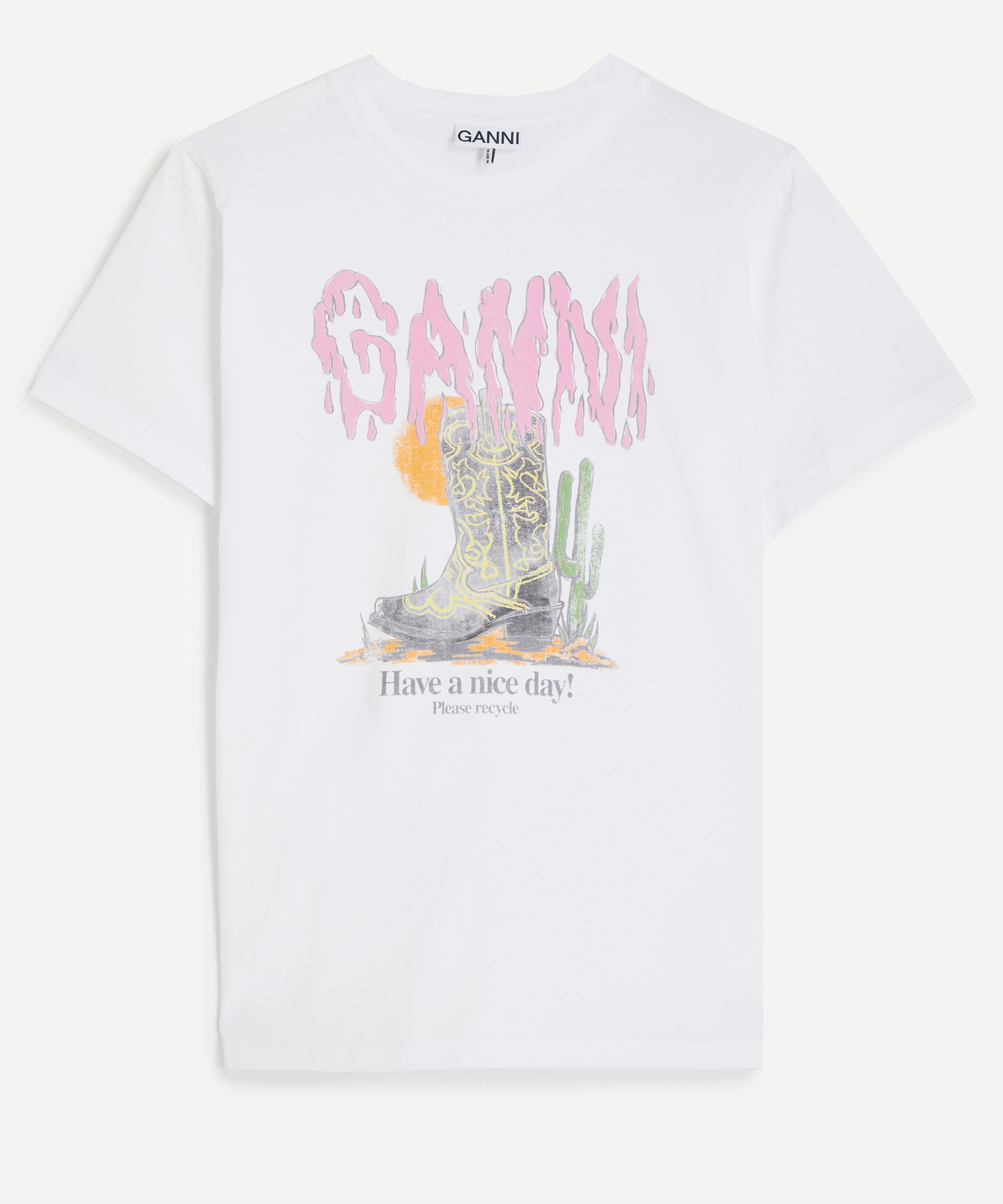 Featuring short sleeves and a classic crew neckline, this GANNI staple is refreshed for the new season with a bold Western boot graphic and a signature ‘Have a Nice Day’ motif adorned across the front for a signature finish.