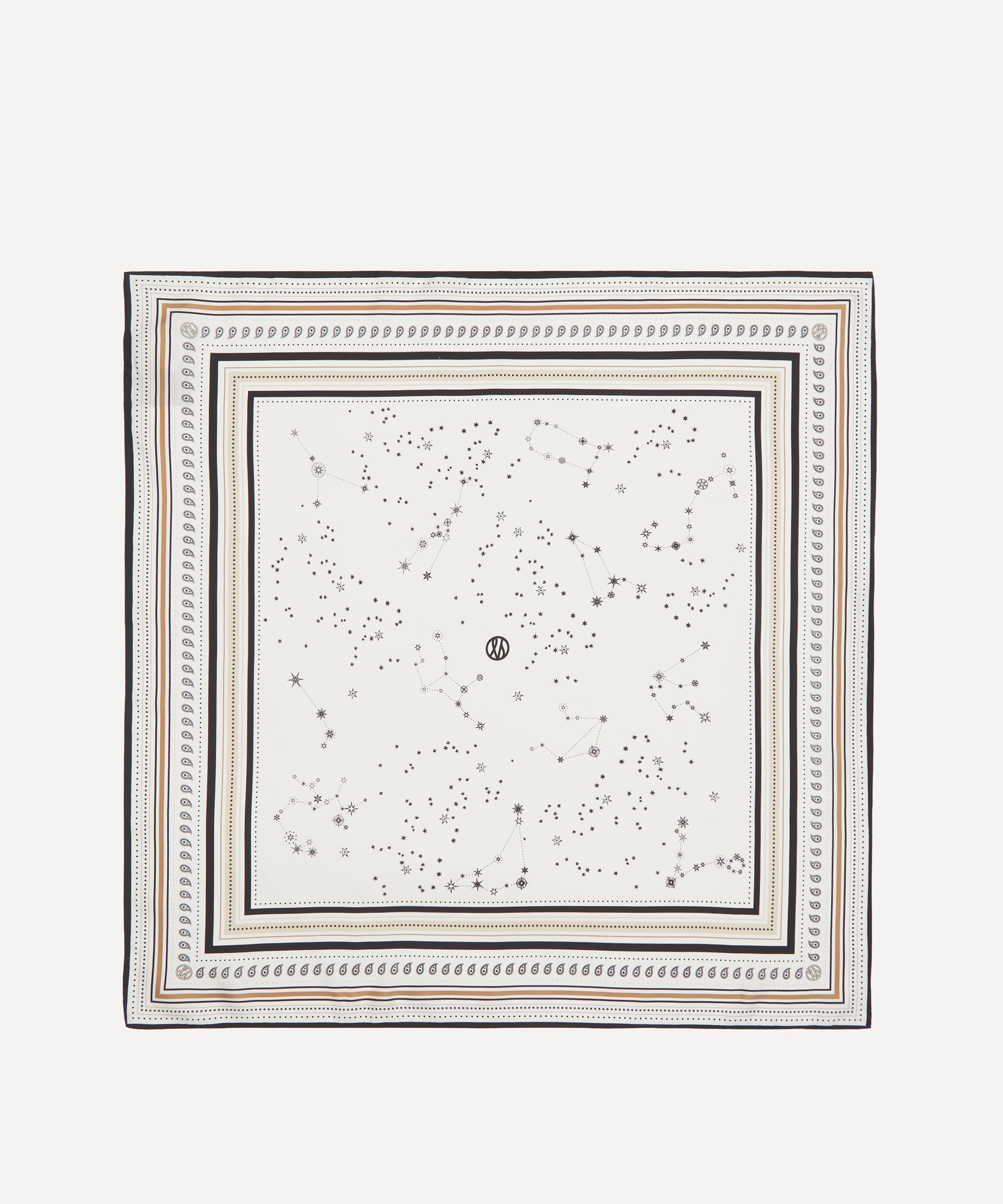 Crafted from lustrous silk in an ivory-white hue, it features a galaxy motif. Boasting a versatile, square silhouette, it offers endless styling possibilities, as it effortlessly drapes around your neck, ties up your hair or wraps around the handle of your bag.