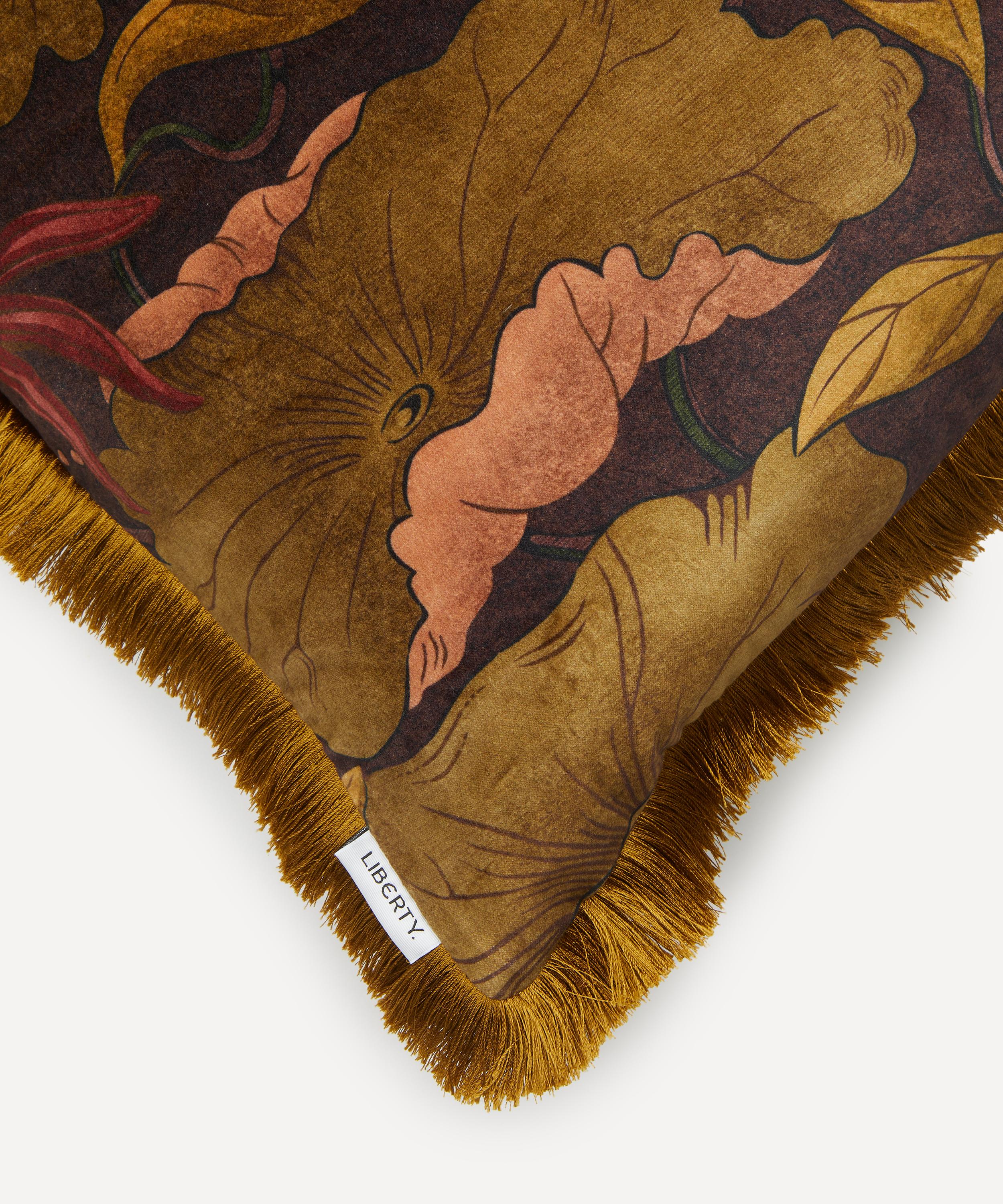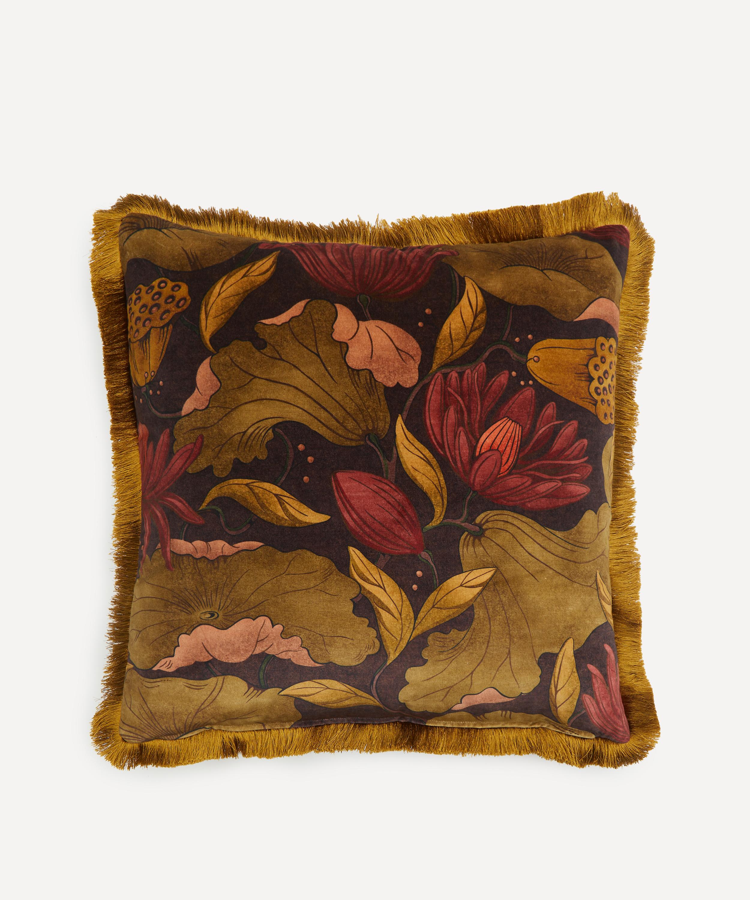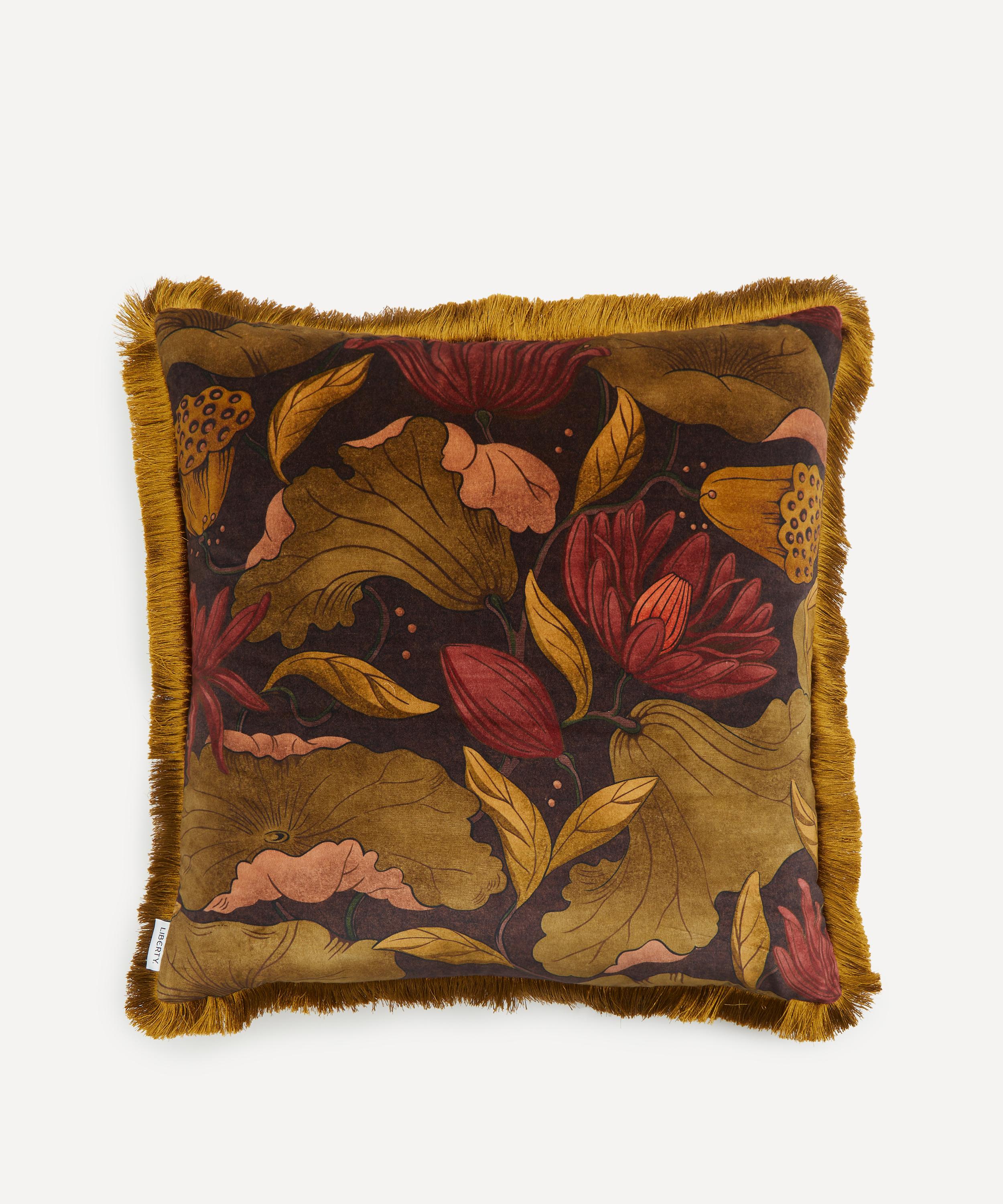 This Liberty square cushion features our Wild Lotus print and is decadently soft with a plump recycled duck feather filling. Created in the Liberty design studio, Wild Lotus – adapted from a series of small textile fragments discovered in the Liberty archive, this statement print conjures up a dreamy, Art Nouveau-style aesthetic – appears here in a beautifully engineered iteration, complete with a fringed edge for an immaculate finish. The cushion’s classic silhouette and richly hued palette add an elegant twist to modern interiors.