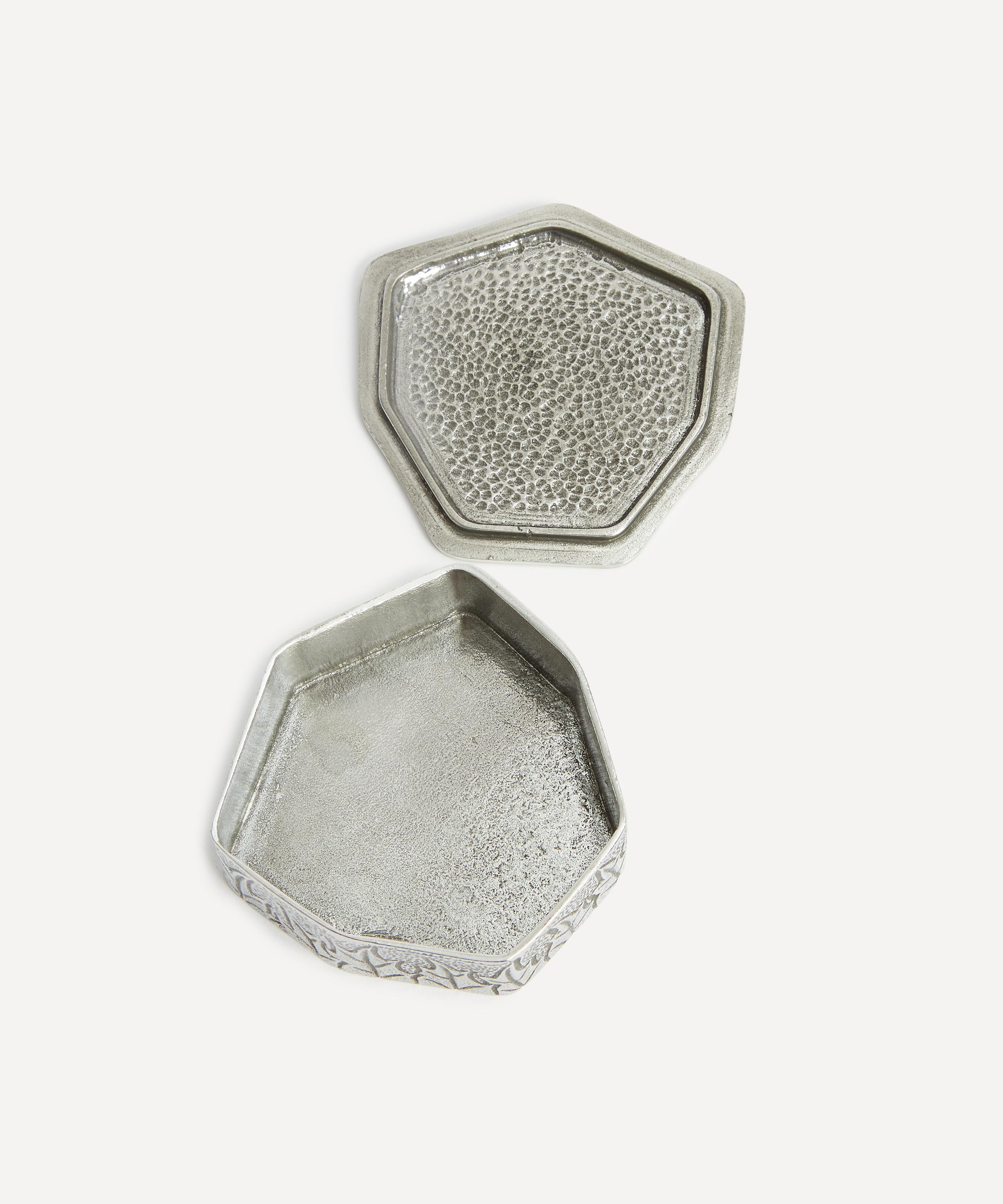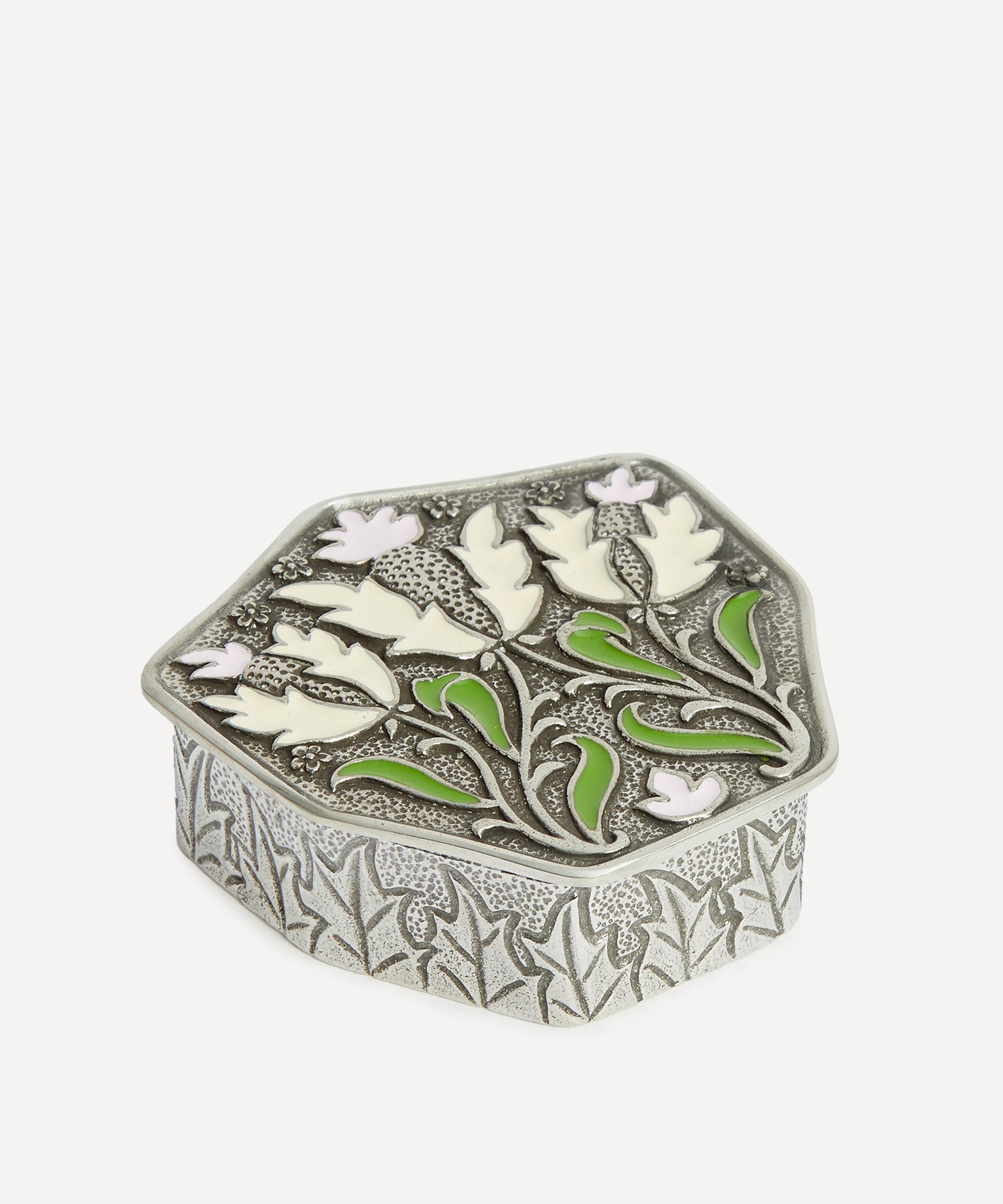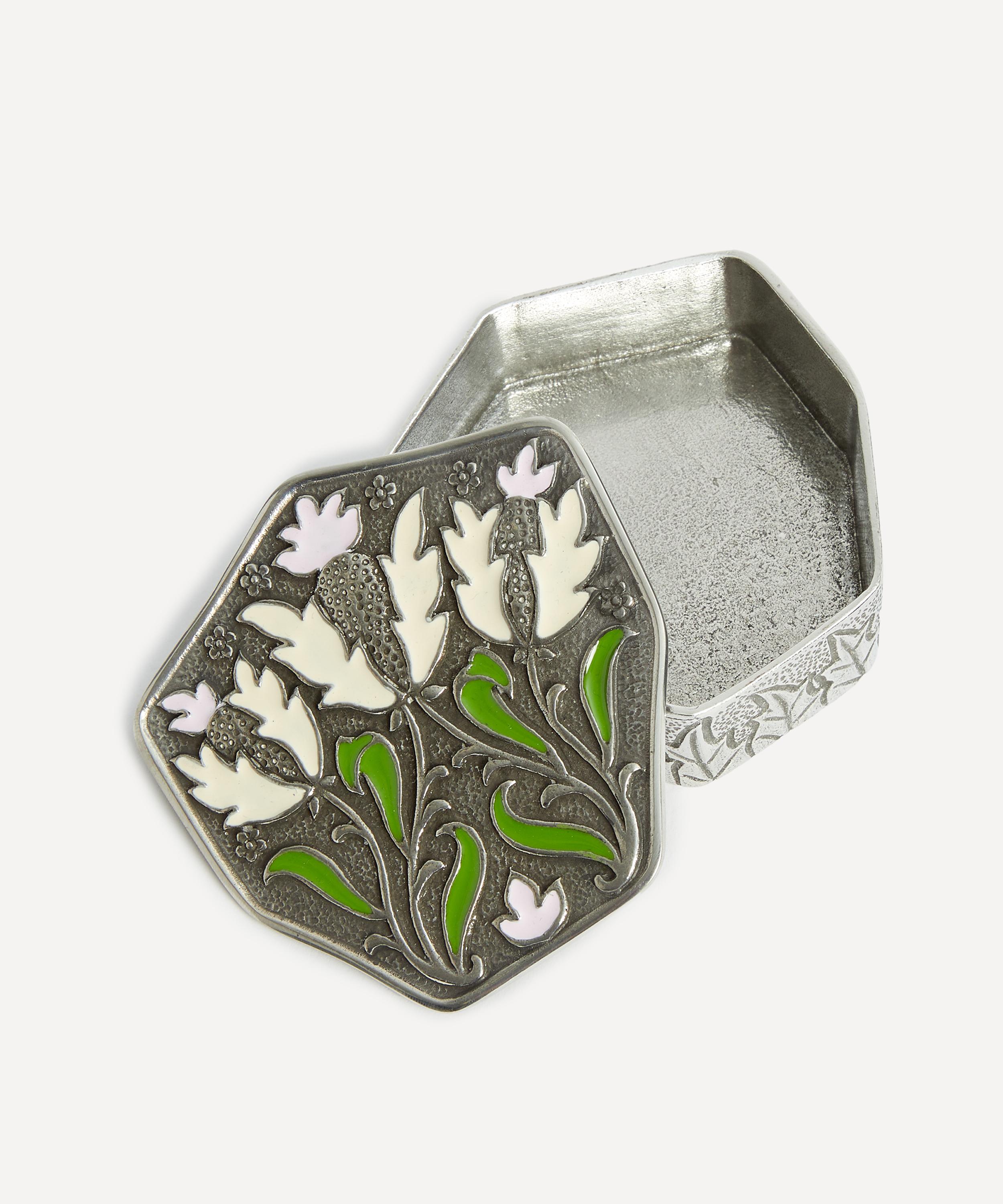 Expertly handcrafted from high-quality British Pewter, this decorative box features a charming floral design, capturing the timeless elegance of the Arts and Crafts movement. Complete with delicate hand-enamelled details on the lid, it is ideal for collectors or as a thoughtful gift.