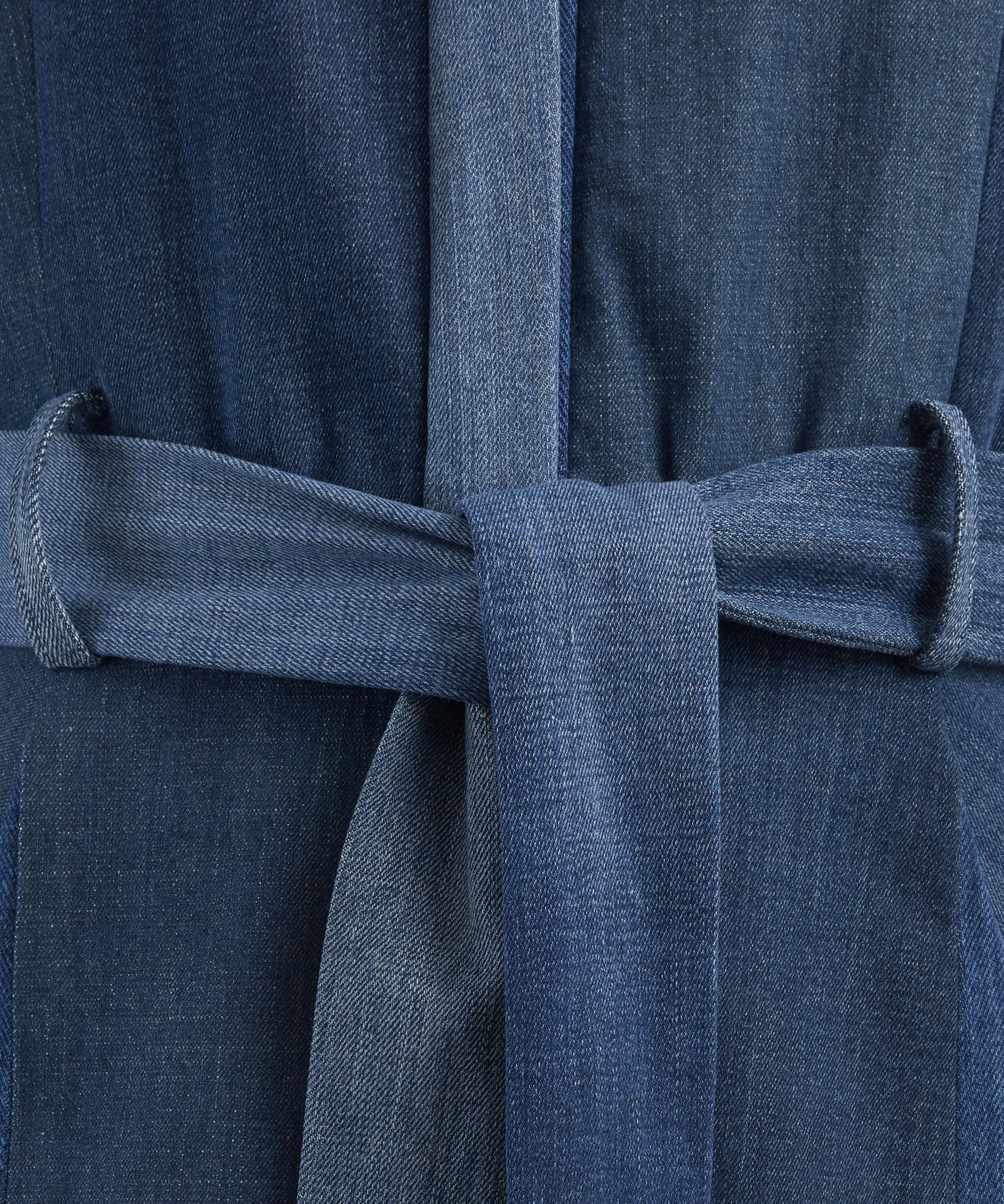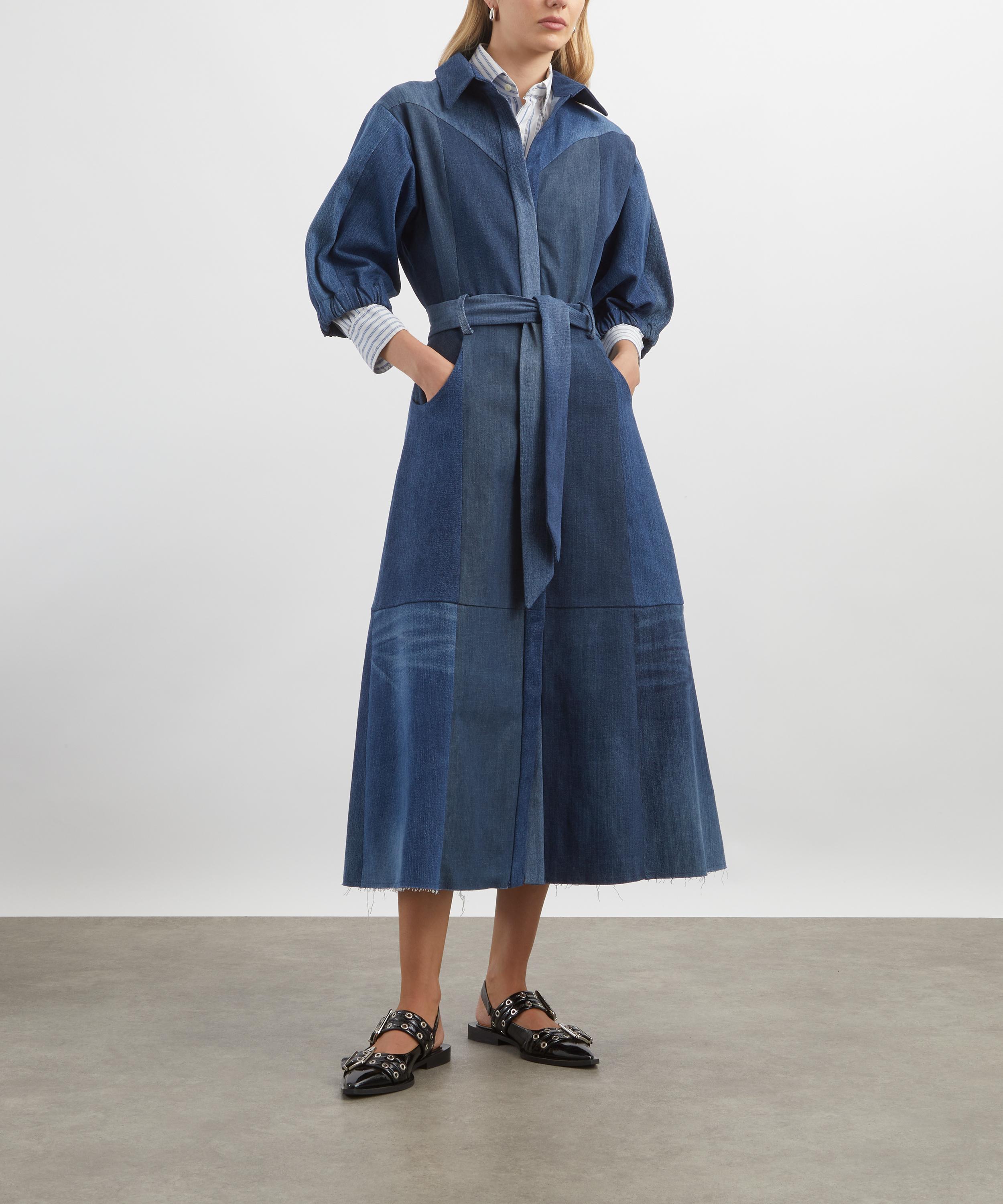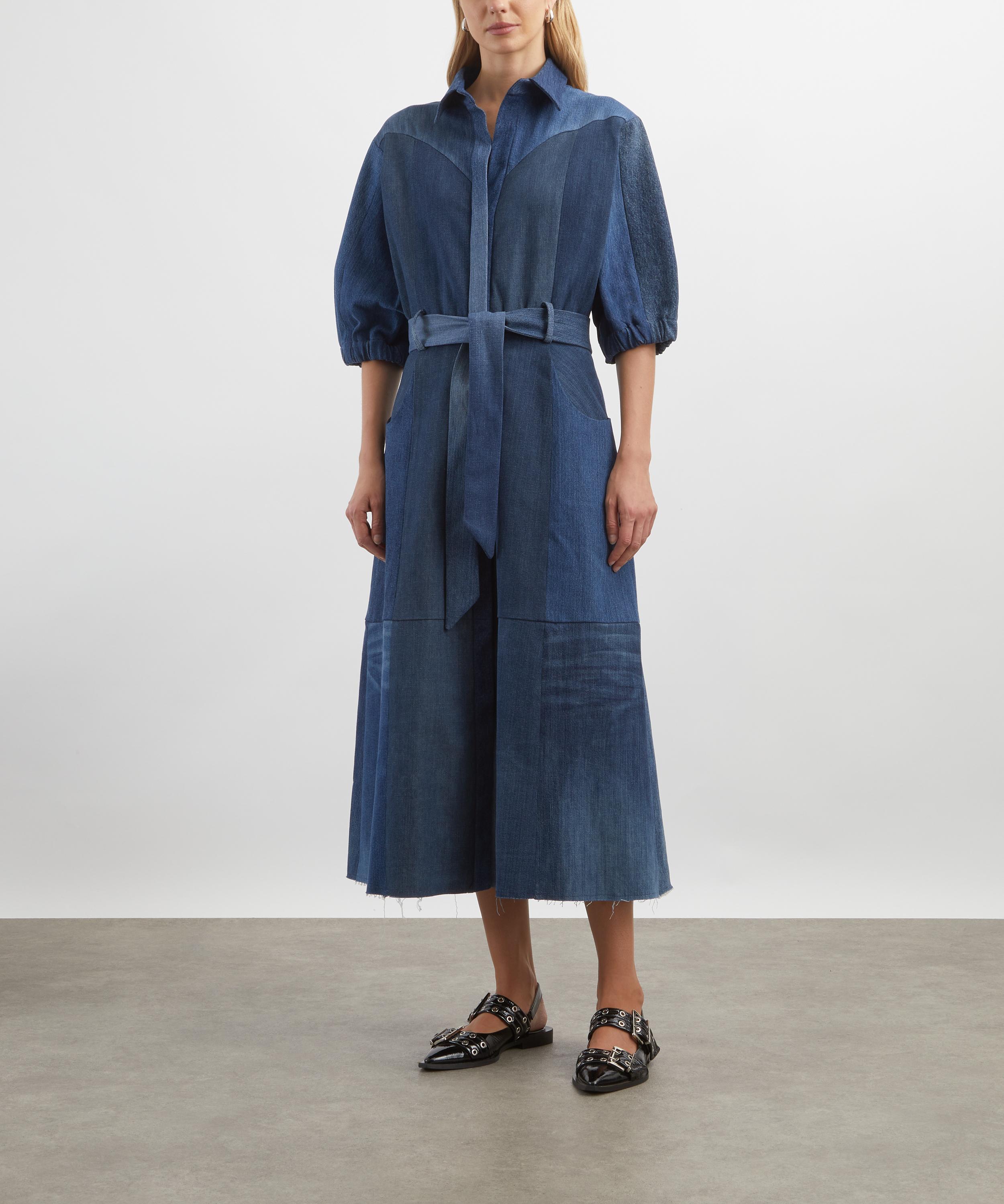 Constructed from disparate panels of upcycled denim, the Willow Dress showcases a one-of-a-kind, contrasting design for an eclectic twist on classic tailoring. Featuring a flattering fit-and-flare silhouette, this dress is designed with three-quarter-length balloon sleeves, an A-line skirt with side pockets, and a removable belt that cinches the waist for a defined shape.