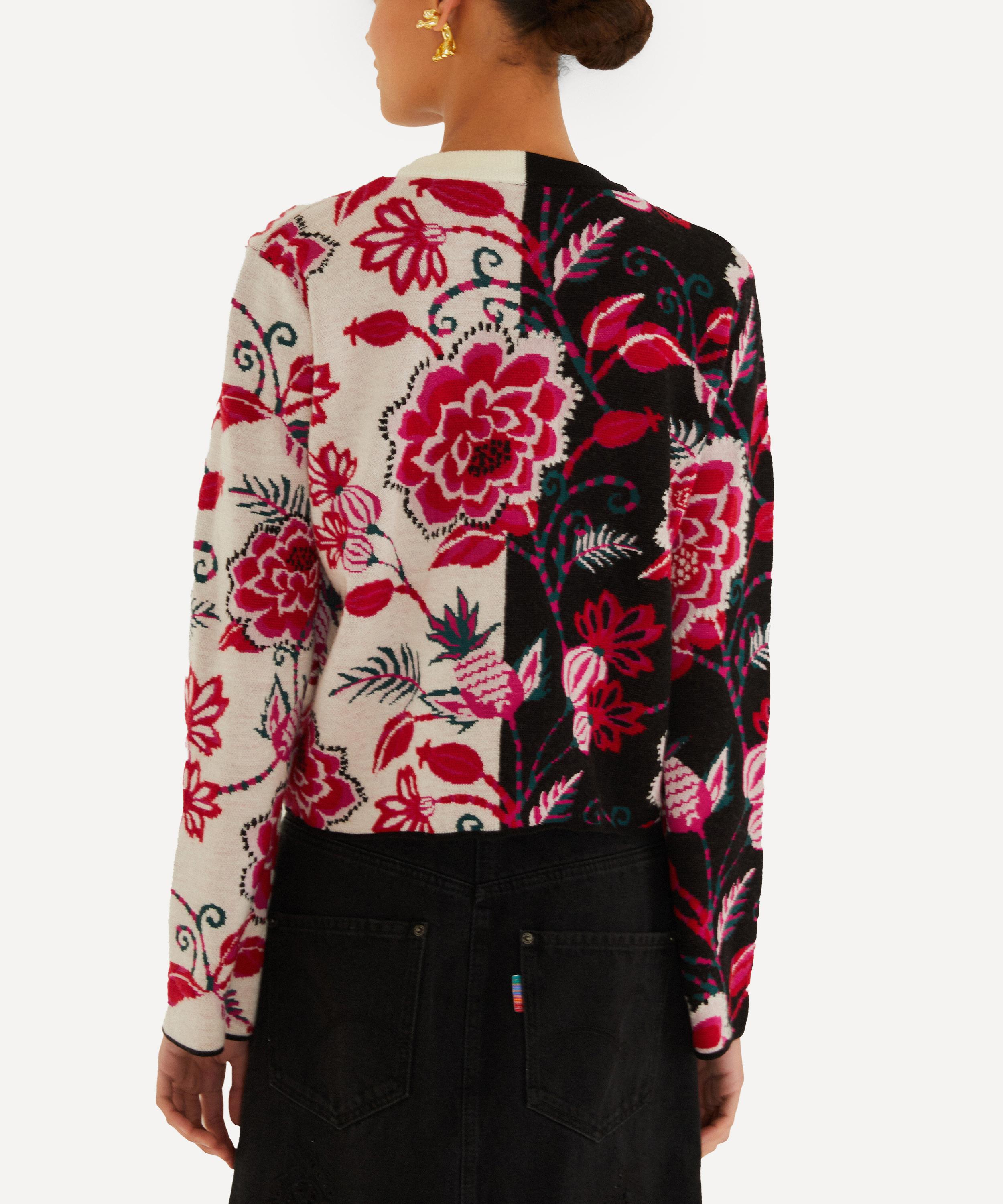 The Winter Garden Mixed Knit Cardigan blends eclectic florals and warm hues with a relaxed silhouette and intricate borders for cozy, artful layering.