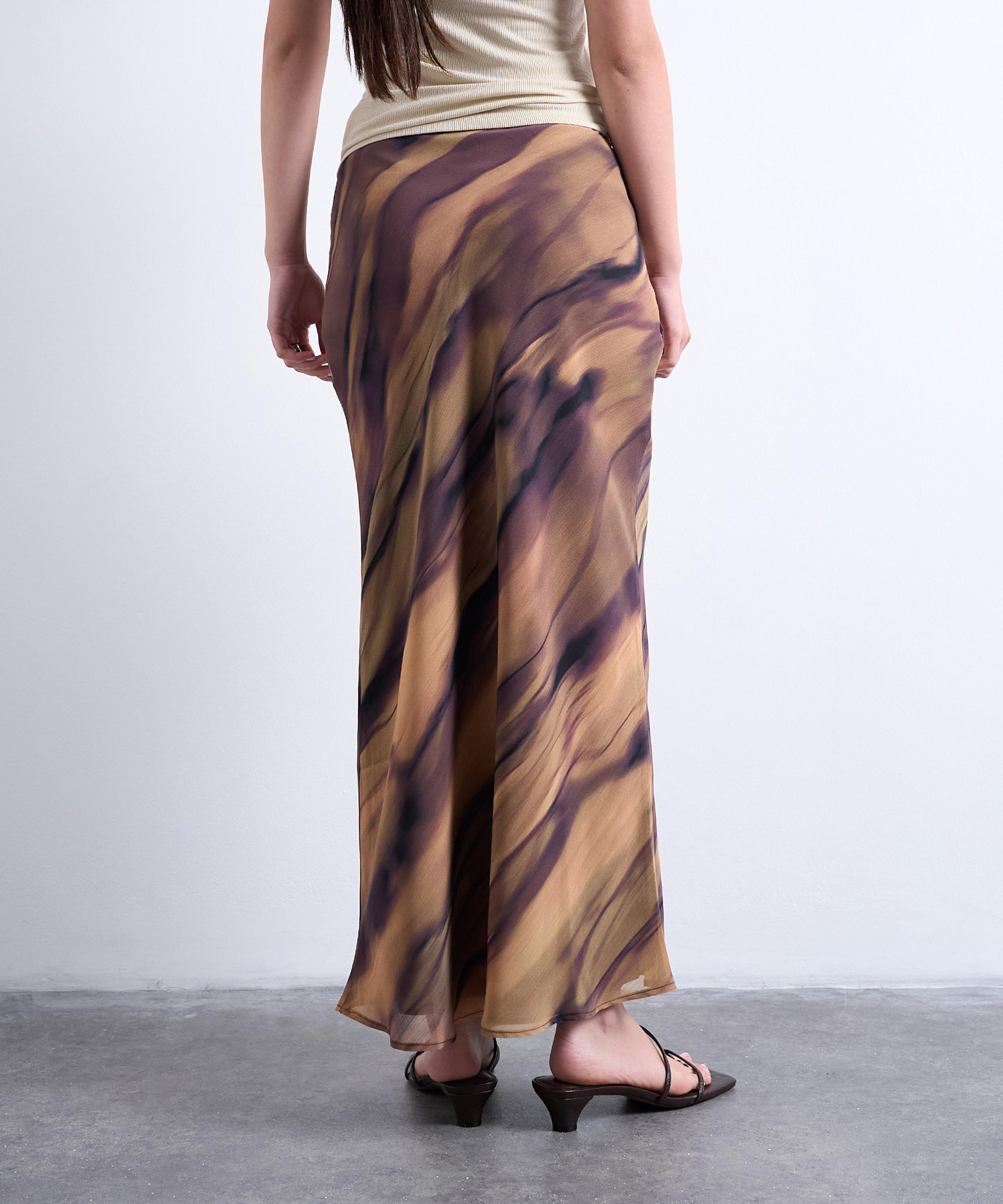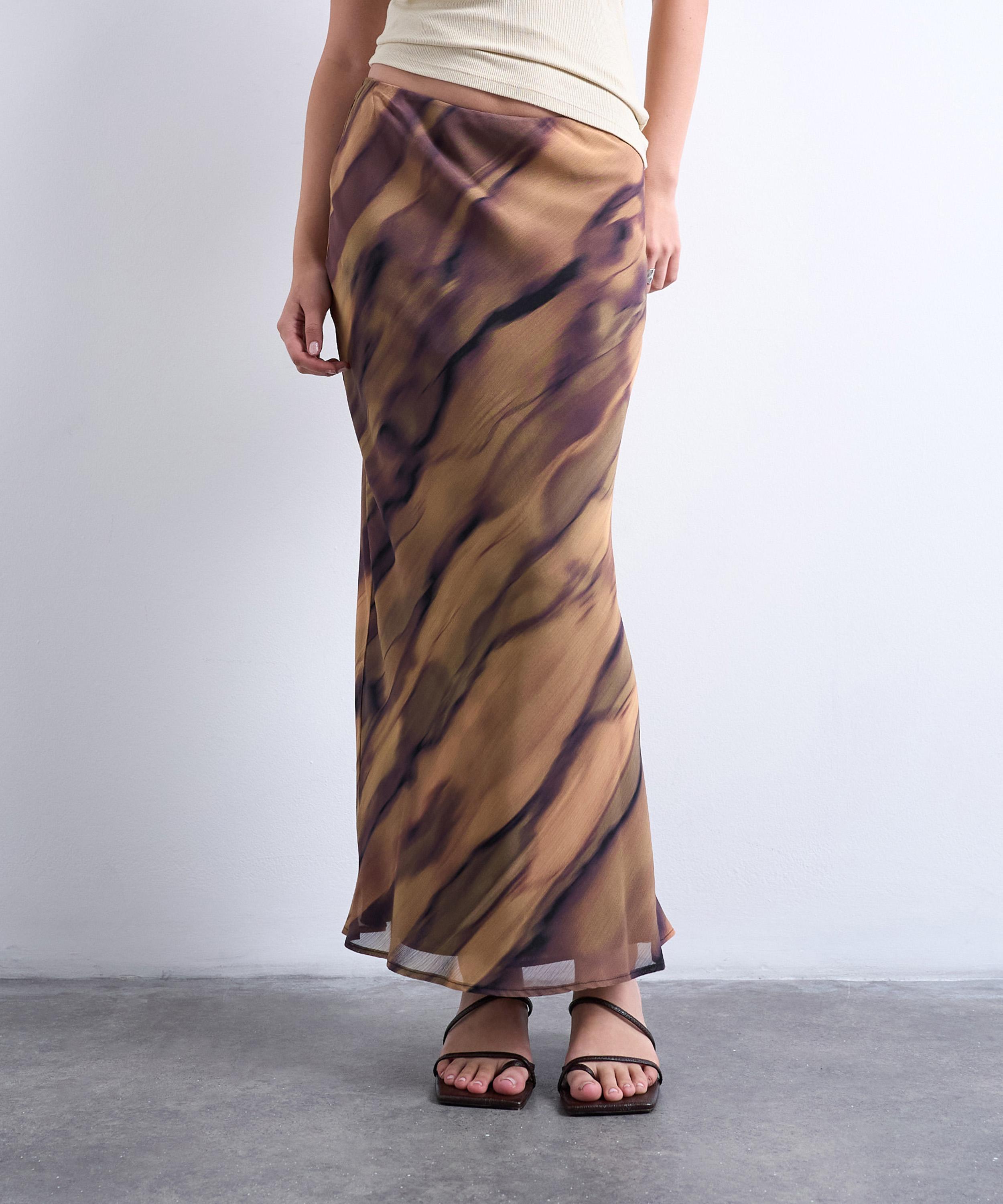 Crafted from lightweight chiffon featuring a striped woodgrain pattern, this midi skirt is tailored for a slim, streamlined silhouette and finished with an elasticated waist for comfort.