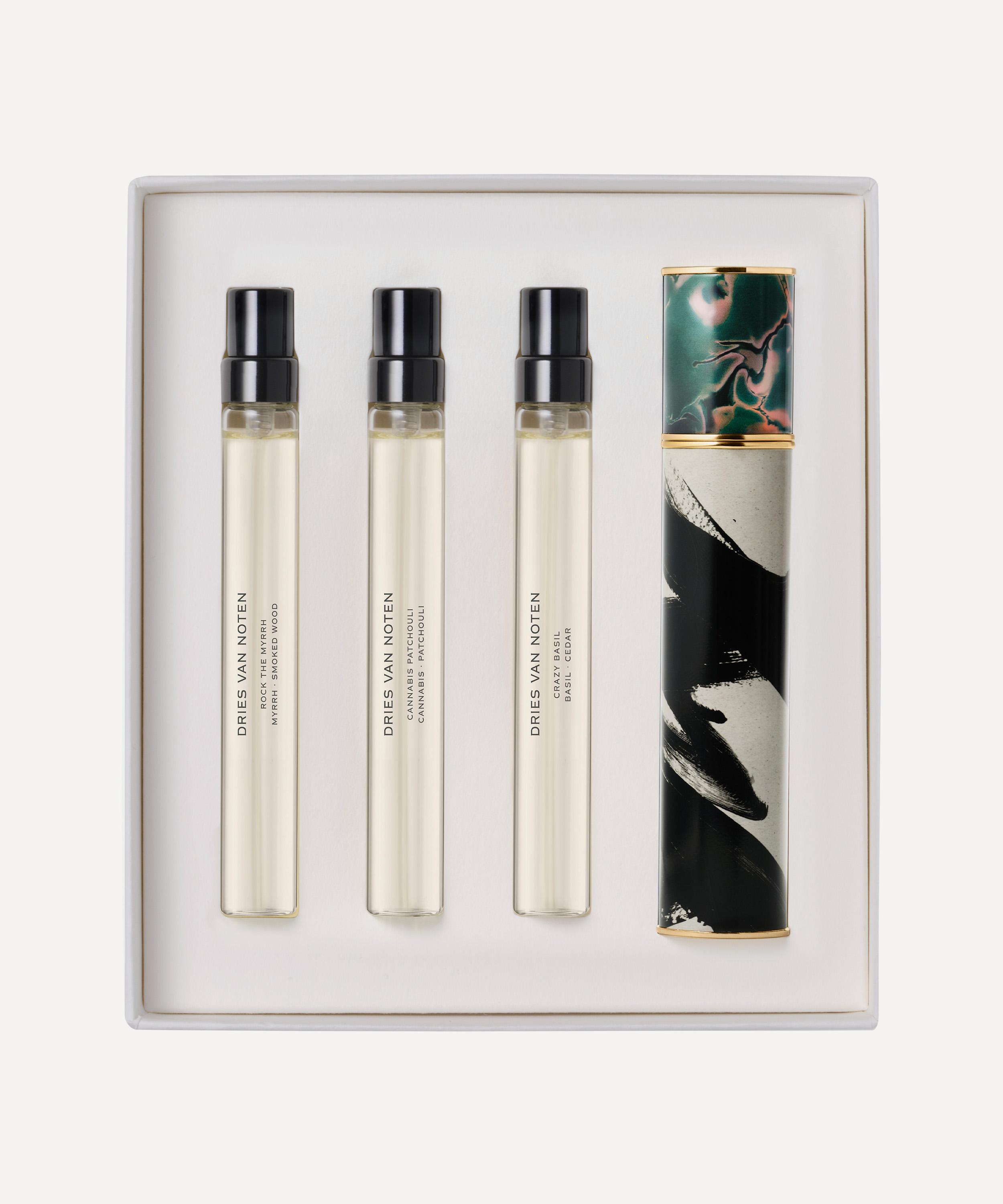 Featuring three of Dries Van Noten’s iconic fragrances, with aromatic folds of verdant herbs and smoky woods, the perfume set offers lightweight scents to evoke a subtle silage – creating the ideal base for layering.