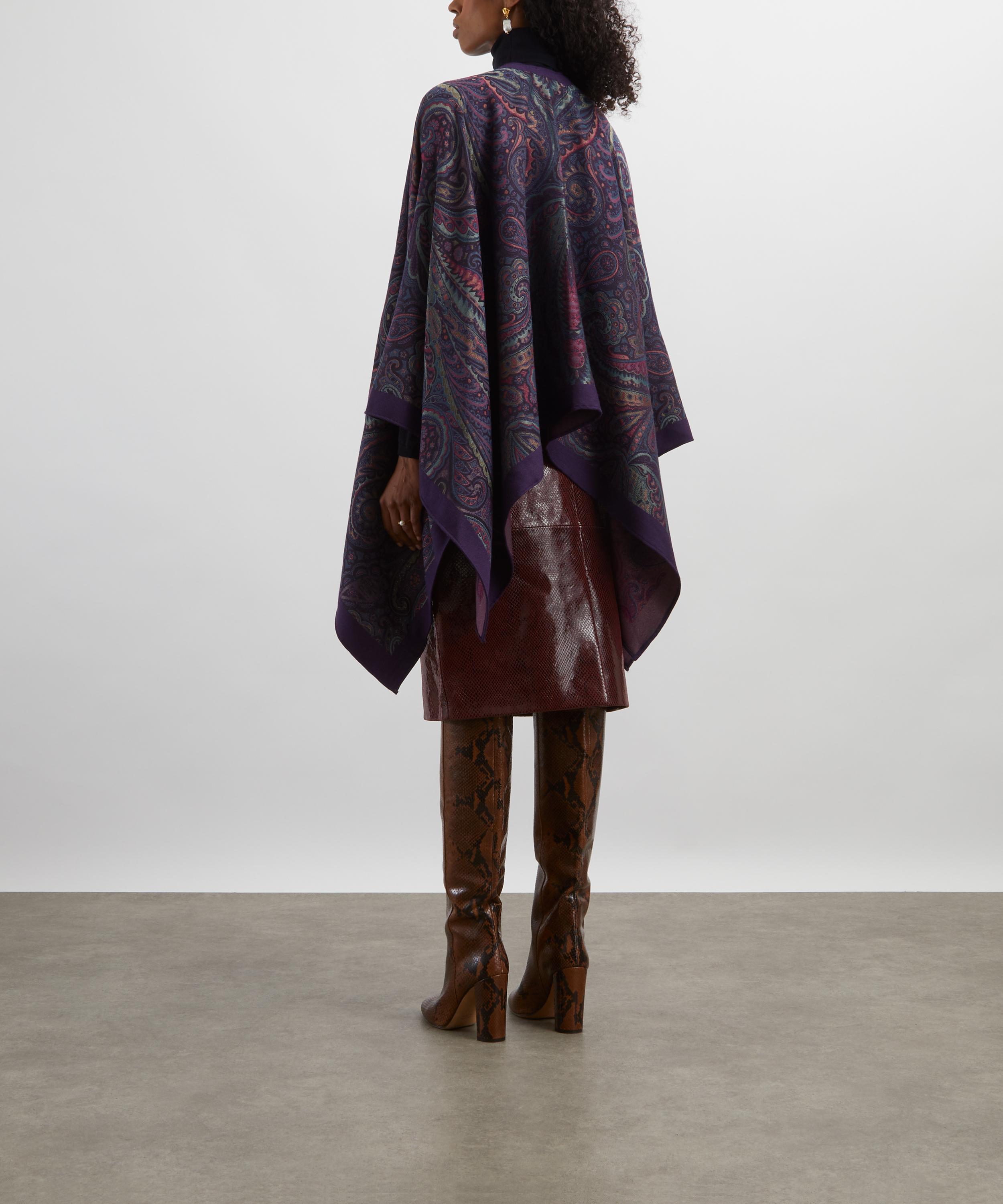 Expertly crafted in Italy from a wool-blend, this poncho is woven all-over with a purple paisley jacquard motif that brings opulence and flair. The relaxed drape and open front is framed by contrasting edging, adding definition to its fluid silhouette.