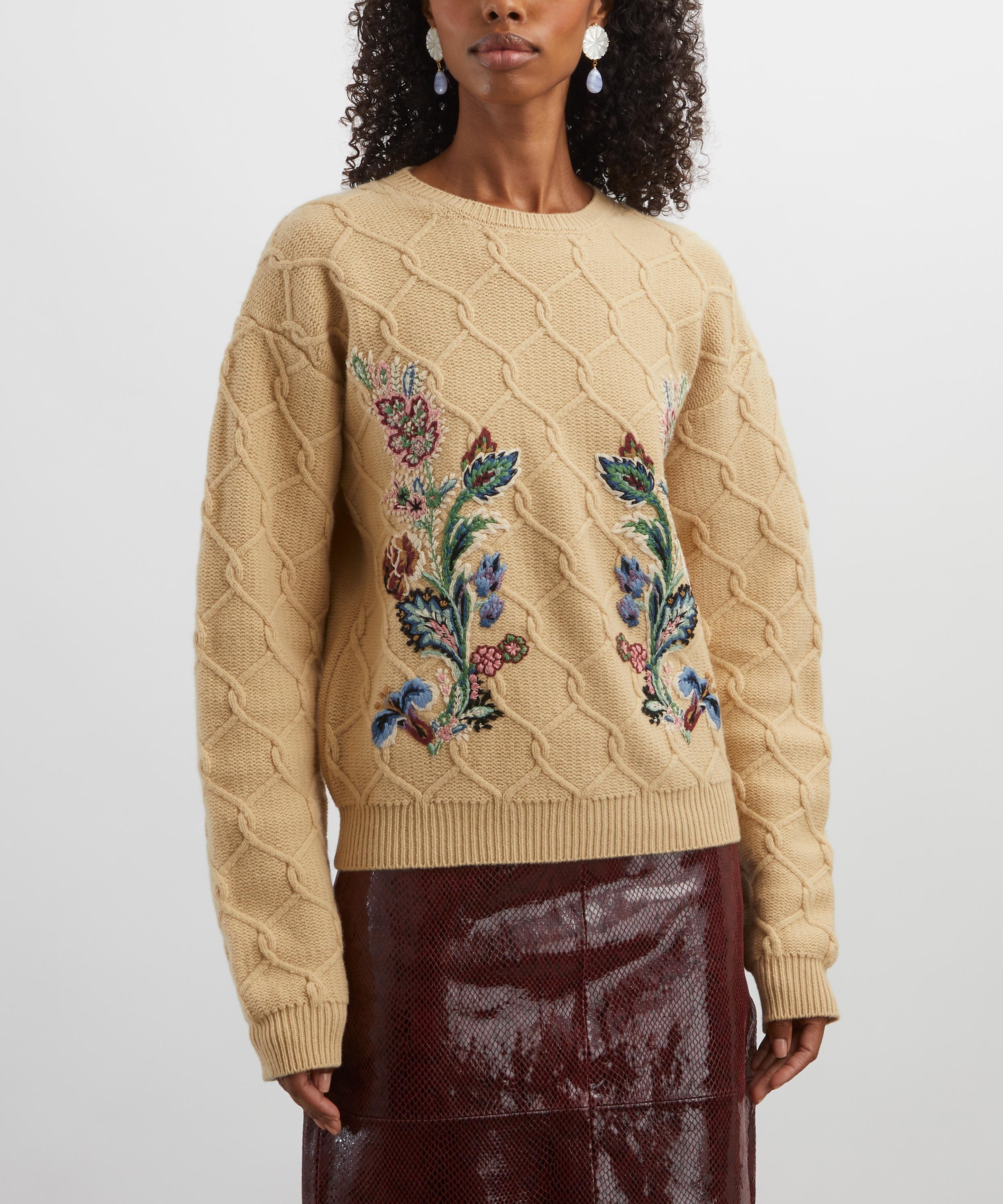 Expertly crafted in Italy from a luxurious wool and cashmere blend, this relaxed jumper is brought to life with raised cable detailing and multi-coloured floral embroidery - bringing bold texture and refined detail to this cold-weather classic.