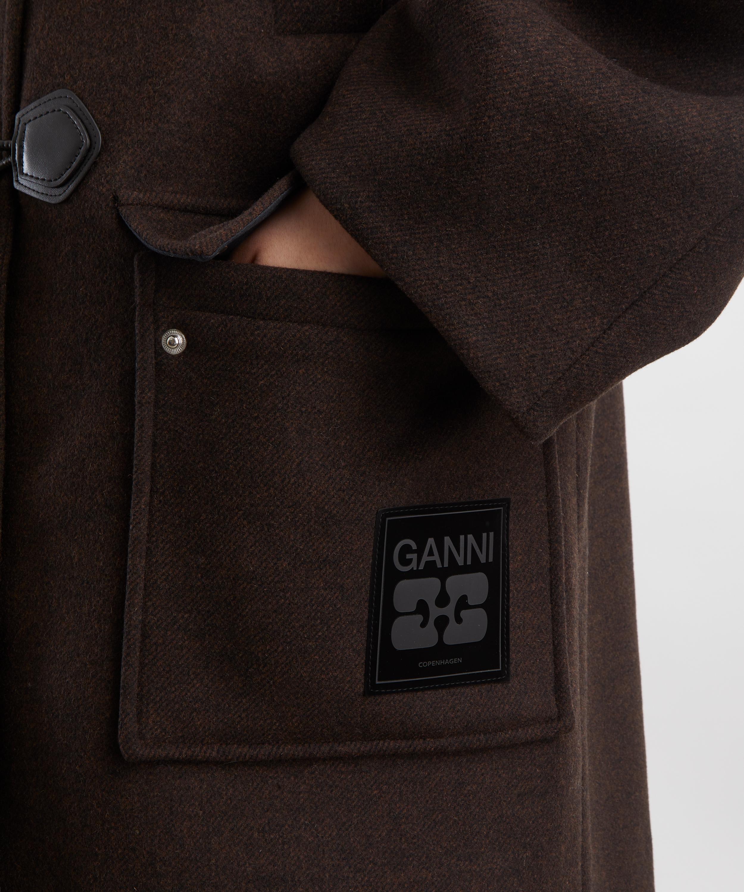 Crafted from a rich wool and cashmere blend, this hooded duffle coat is cut to a relaxed silhouette with a high collar and curved sleeves. Designed with four pockets and a classic button-and-loop closure, it’s finished with a GANNI logo patch for a refined signature touch.