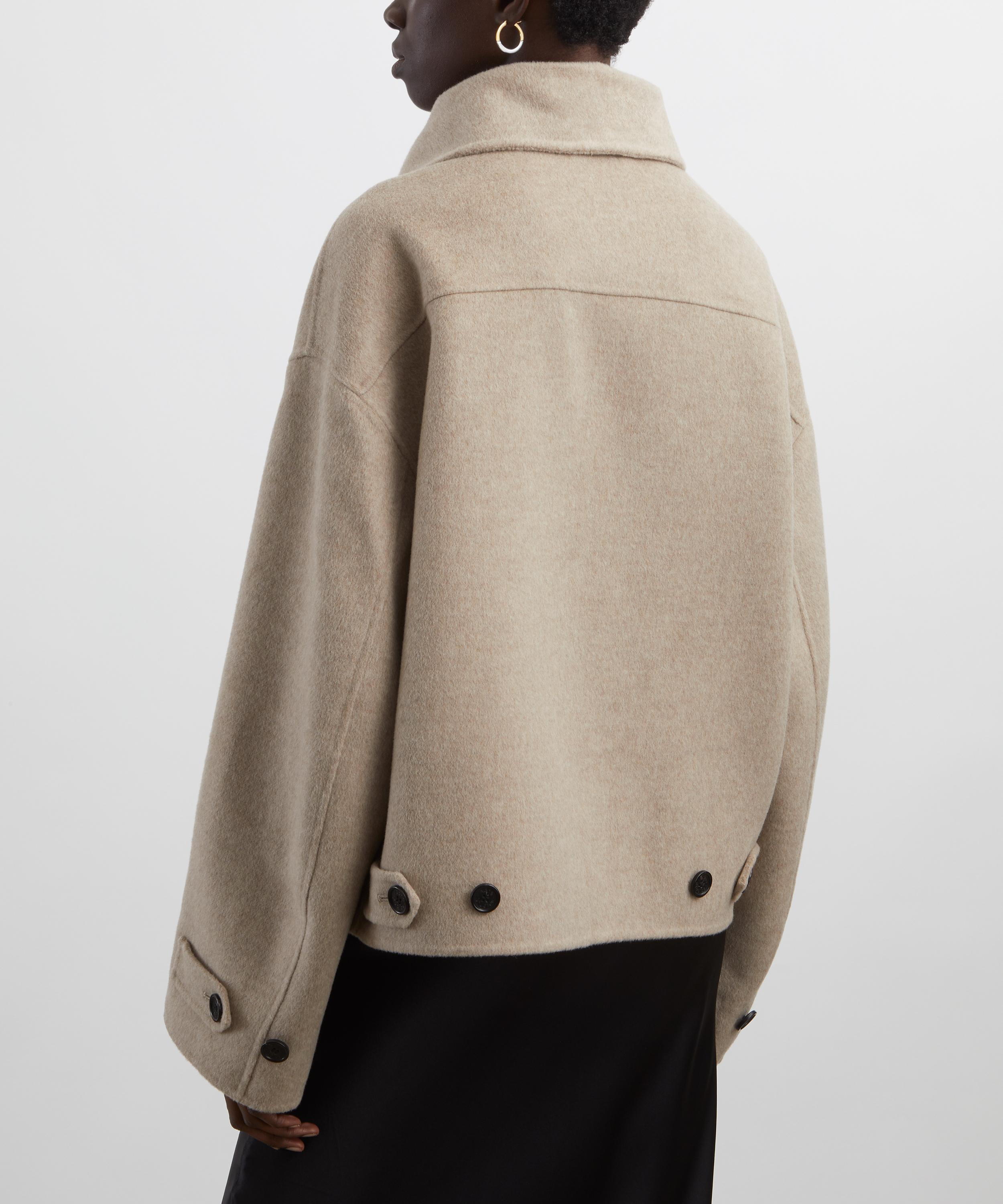 Crafted from a brushed cashmere-wool blend for elevated softness, this sumptuous jacket features a relaxed fit with dropped shoulders. Designed with a two-way front closure, it’s detailed with an oversized high neckline, front pockets, and buttoned tabs at the cuffs and back for an adjustable fit.