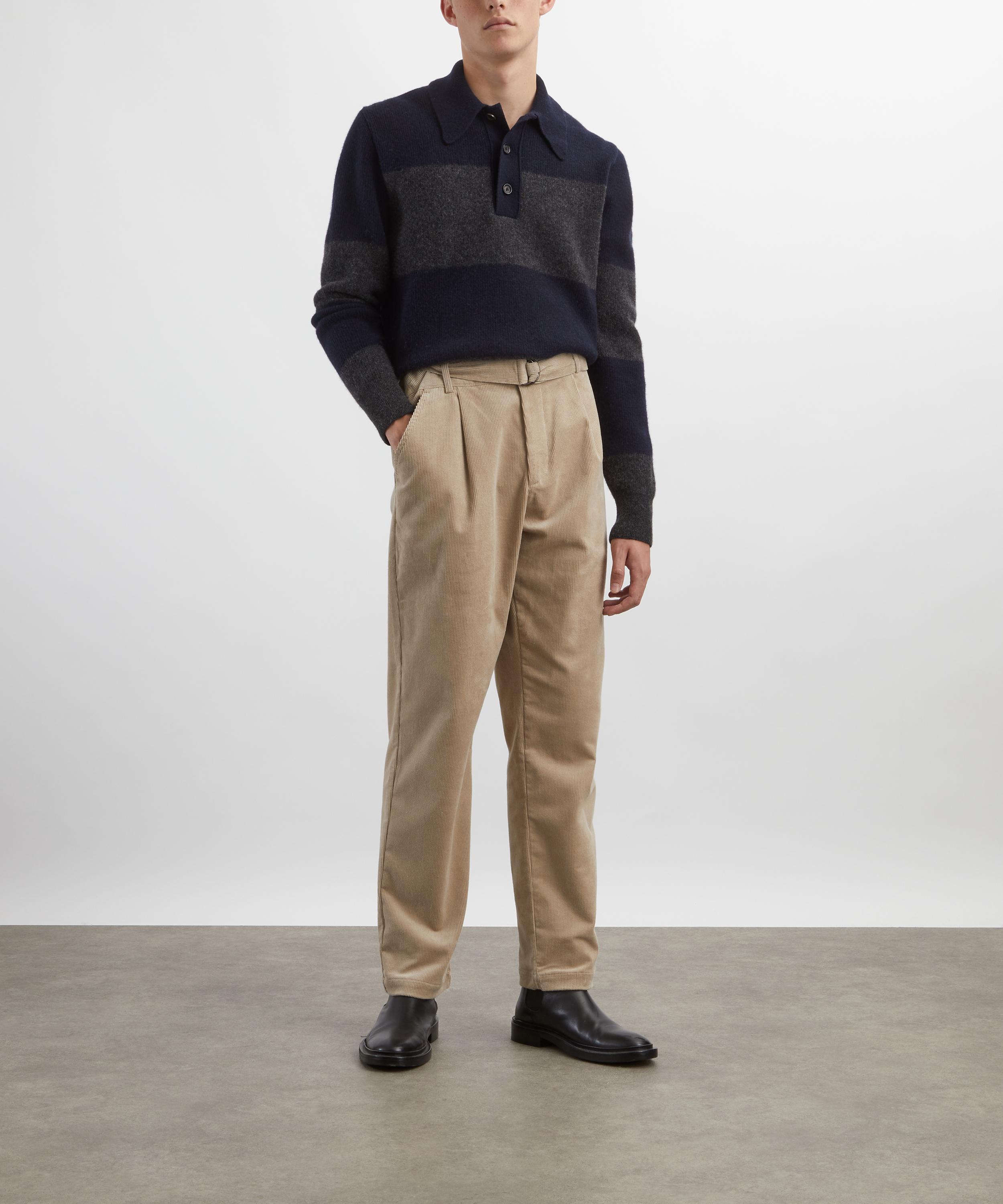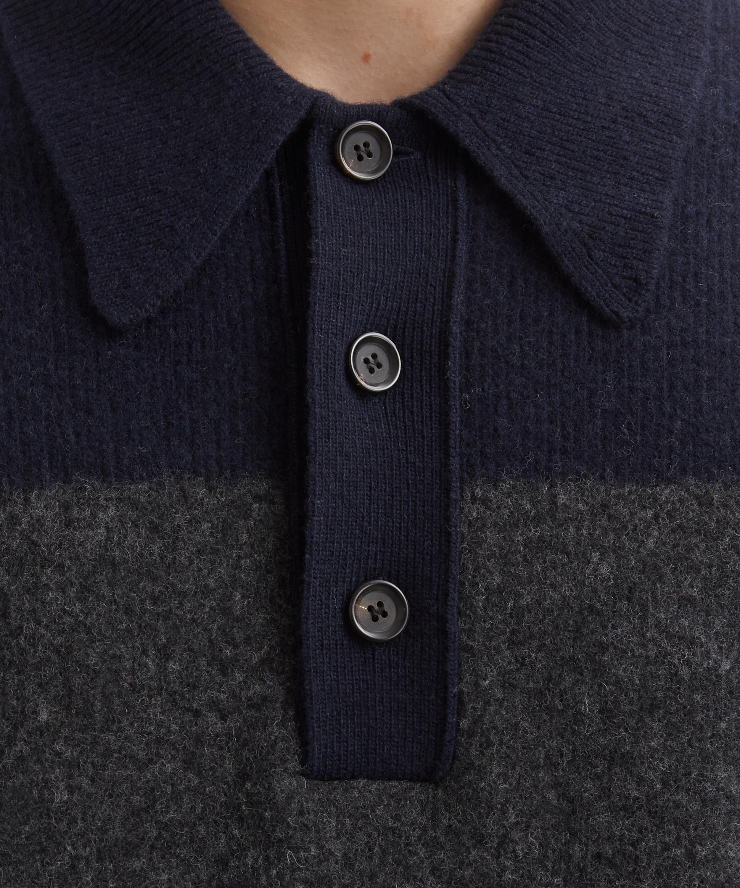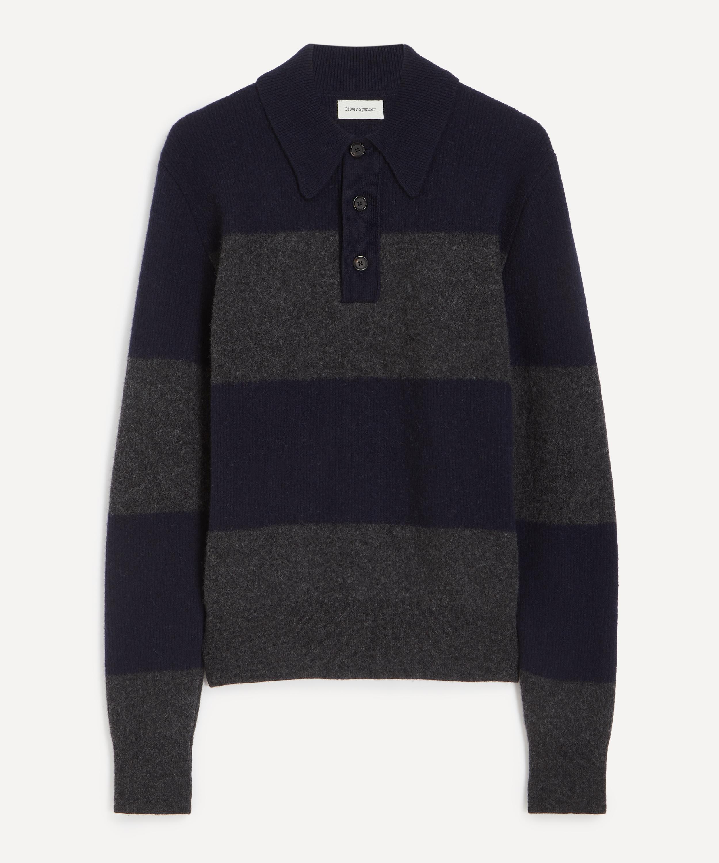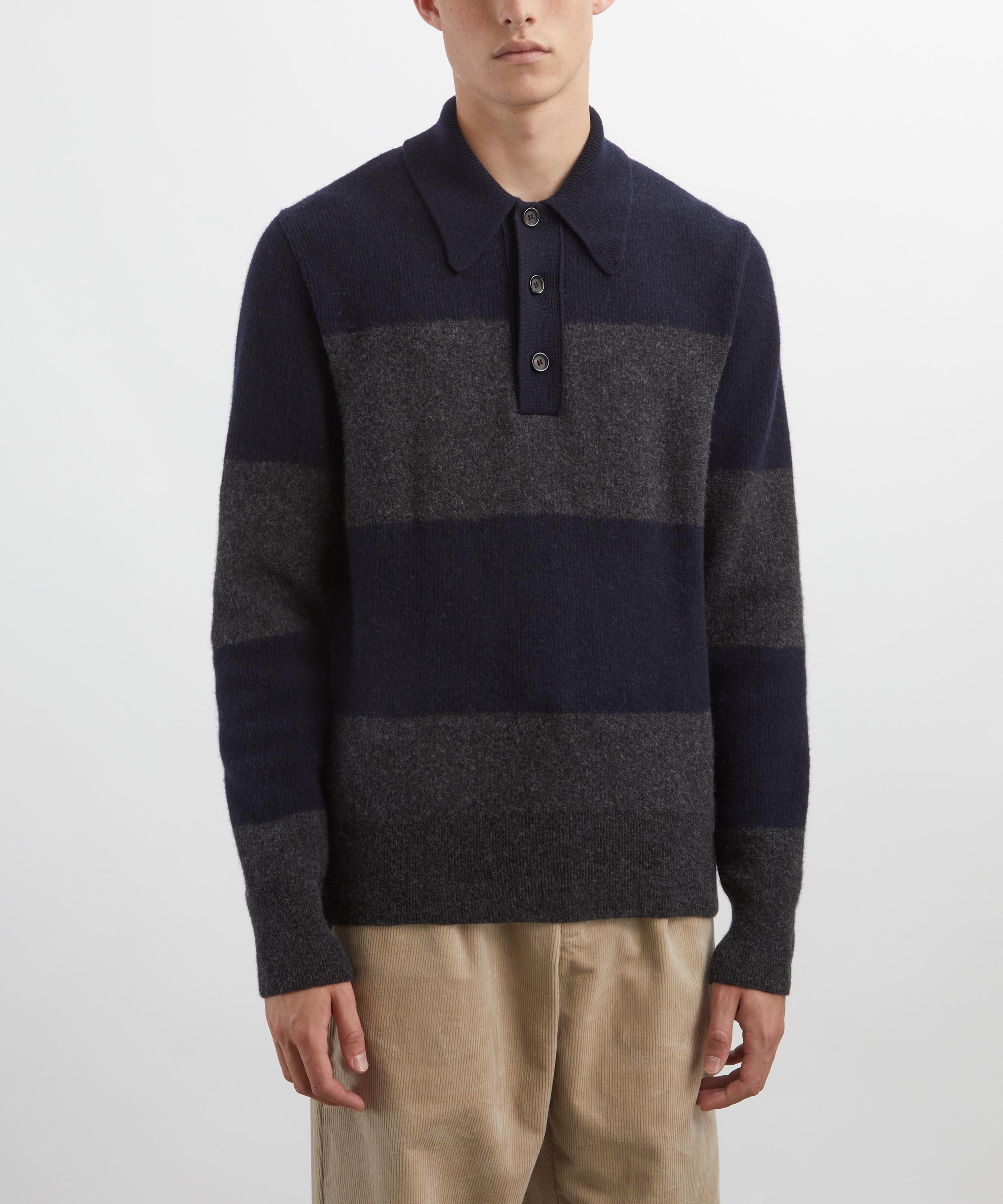 Crafted from extra-fine wool, this knitted polo shirt adds a touch of polished preppiness to your seasonal wardrobe. Featuring a bold navy and charcoal stripe, it’s finished with a flat-knit collar and a partial button placket for a timeless, refined look.