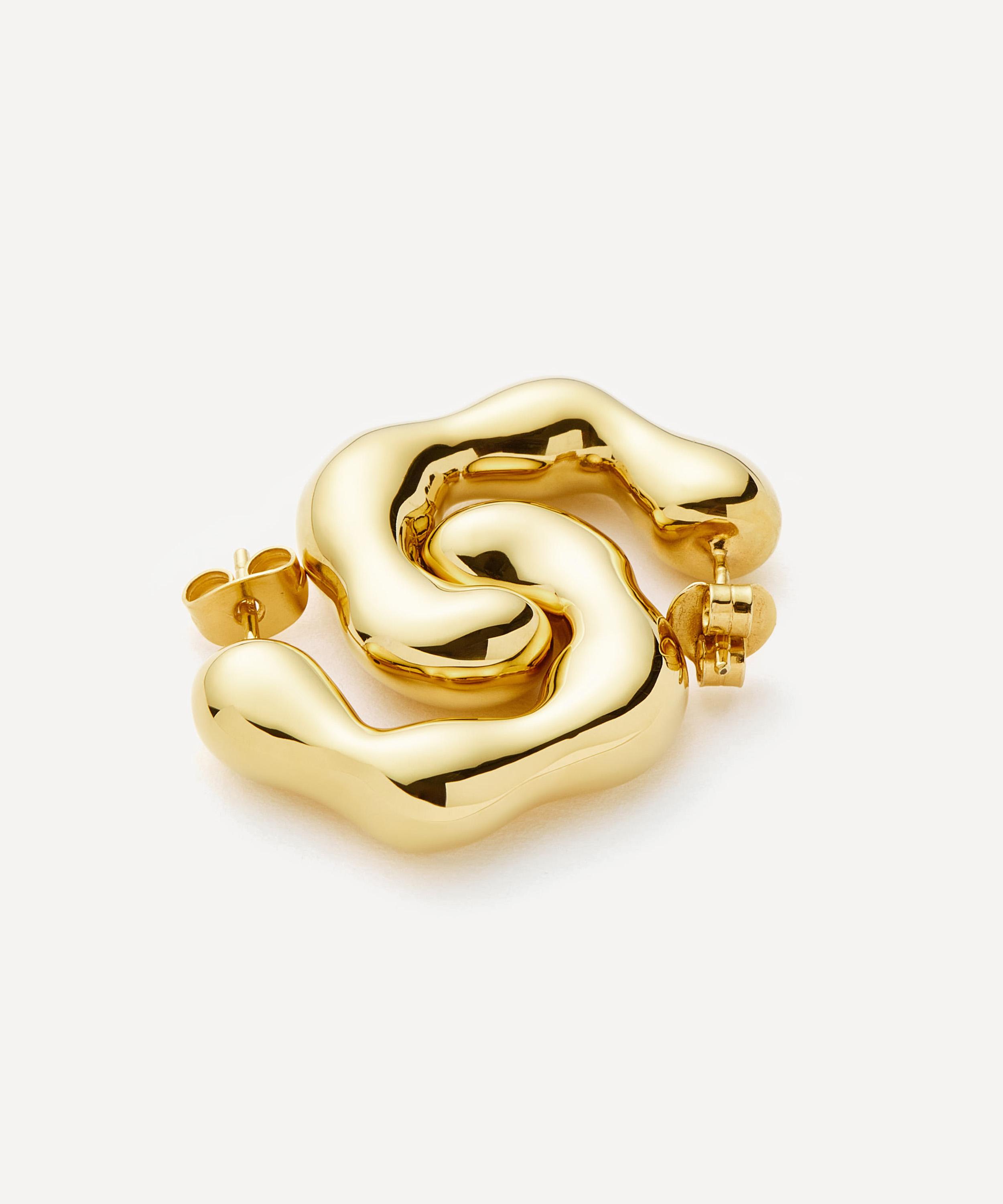 Made in collaboration with ceramicist, artist, and designer Eny Lee Parker, each hoop features a puffy, molten design that has been rippled and ridged from 18ct gold-plated brass. Capturing raw, organic forms inspired by nature, interiors, and sculpture, they effortlessly blend bold maximalism and fine artistry for an intriguing look that is both versatile and ultra-wearable – style them solo or compliment with gold stud earrings and mini hoops.