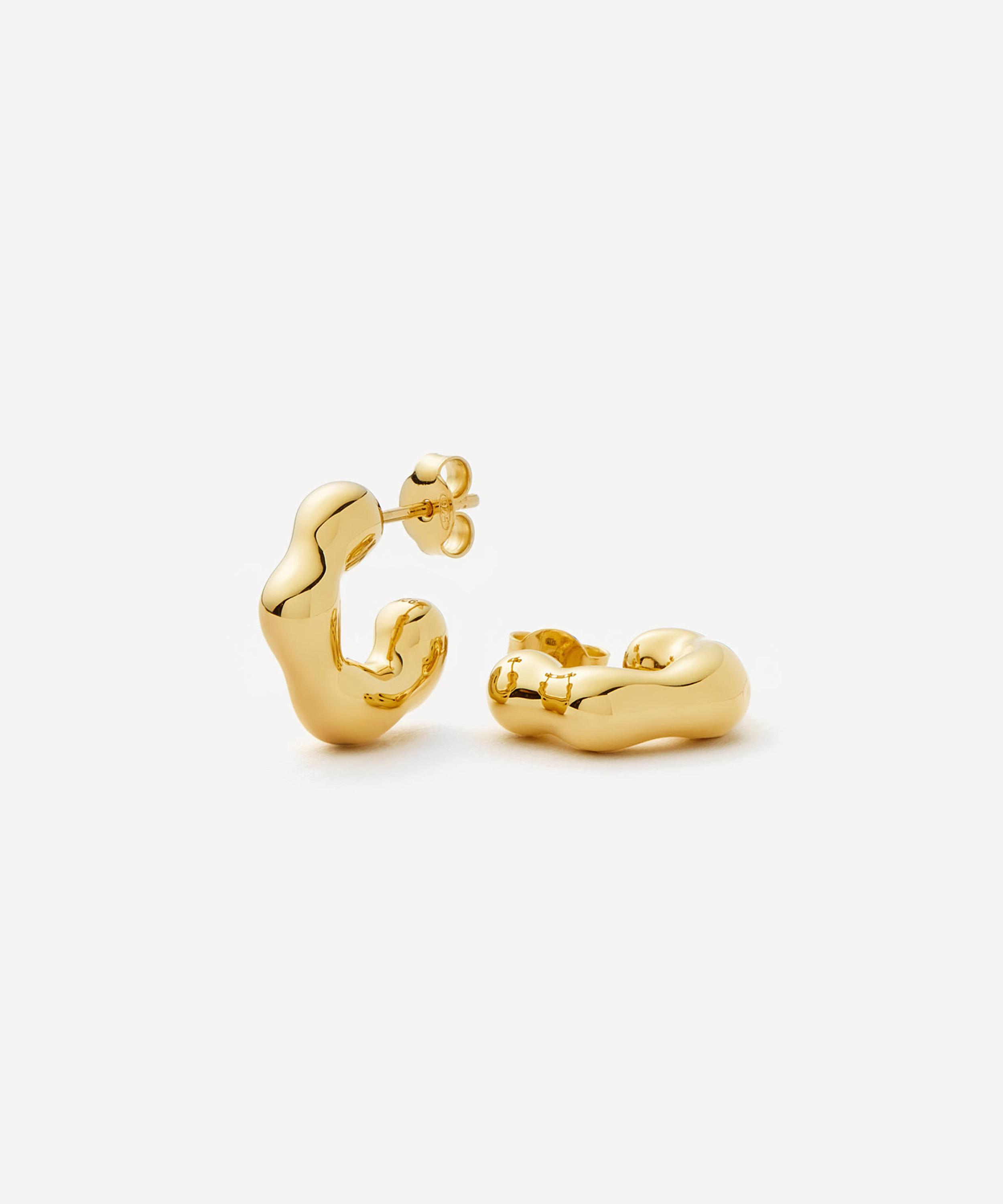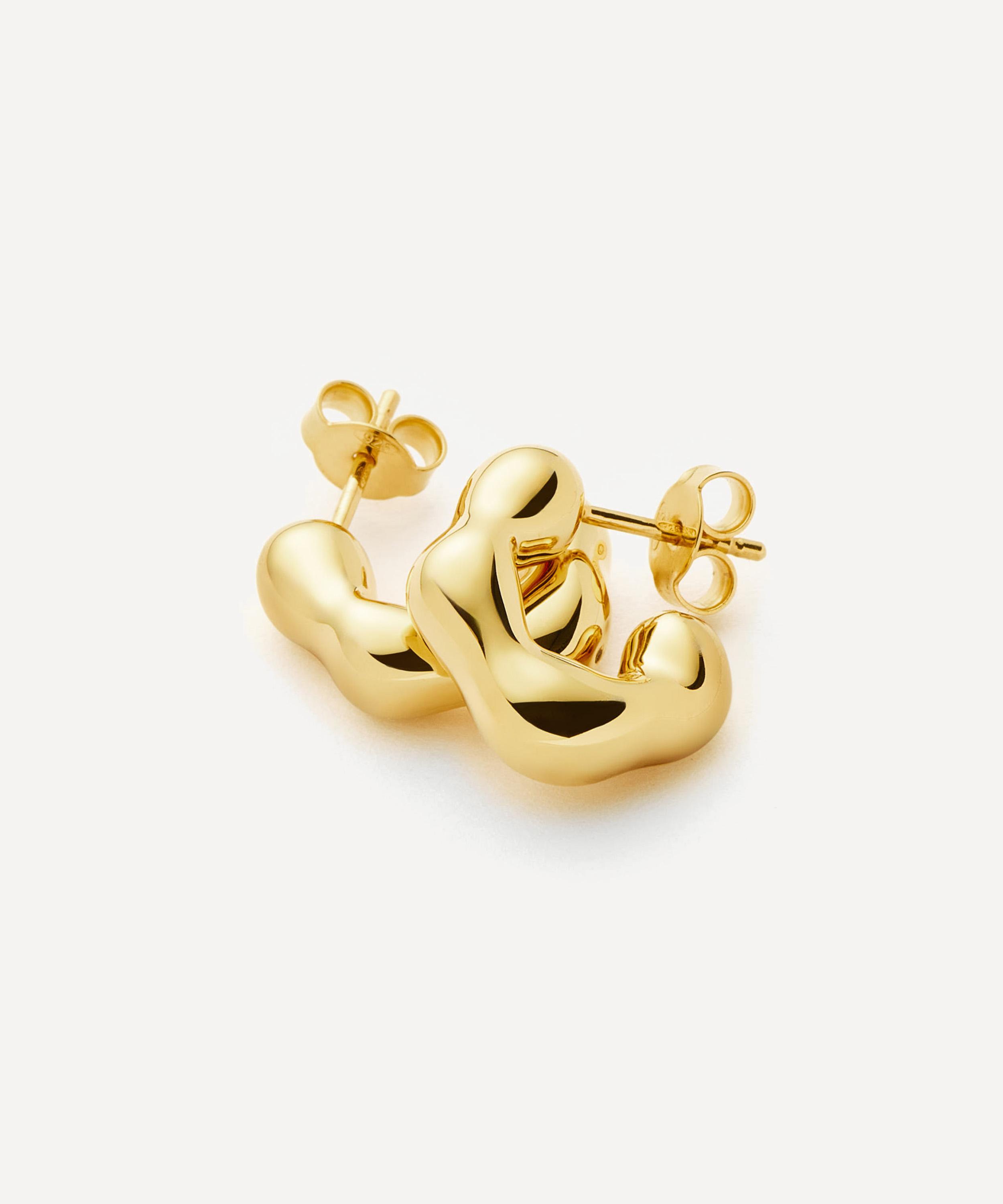 Made in collaboration with ceramicist, artist, and designer Eny Lee Parker, each hoop features a puffy, molten design that has been rippled and ridged from 18ct gold-plated brass. Capturing raw, organic forms inspired by nature, interiors, and sculpture, they effortlessly blend bold maximalism and fine artistry for an intriguing look that is both versatile and ultra-wearable – style them solo or compliment with gold stud earrings and mini hoops.