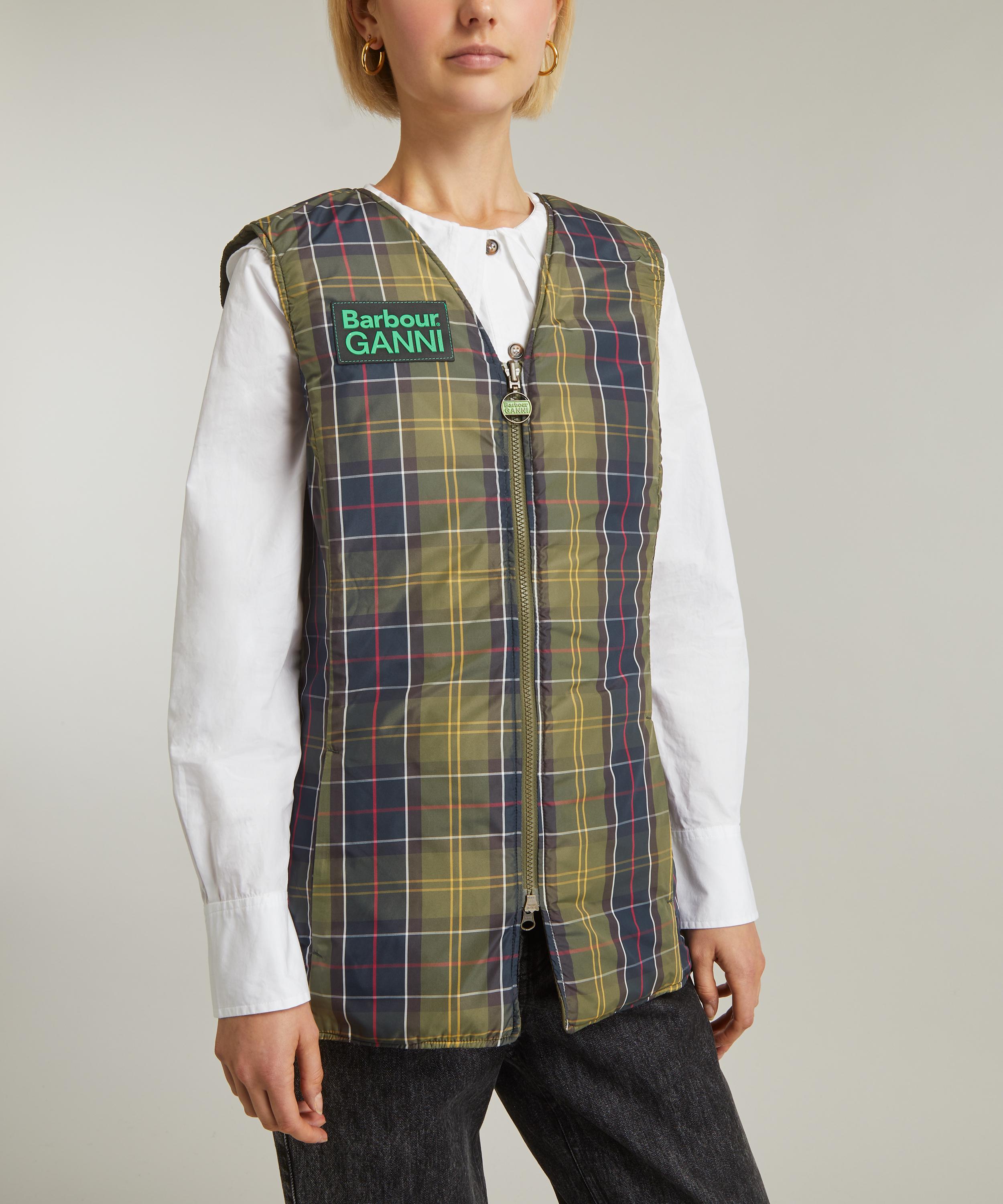 Celebrating exaggerated features and core wardrobe staples for the perfect marrying of style, the Betty Reversible Liner displays the personality and experimentation of GANNI with its bold pops of neon green while its classic tartan lining speaks to the heritage and roots of Barbour. A functional high-fashion design with its dual-branded ring pull and zip fastening, it’s embossed with a neon logo patch at the chest for a contemporary finish.
