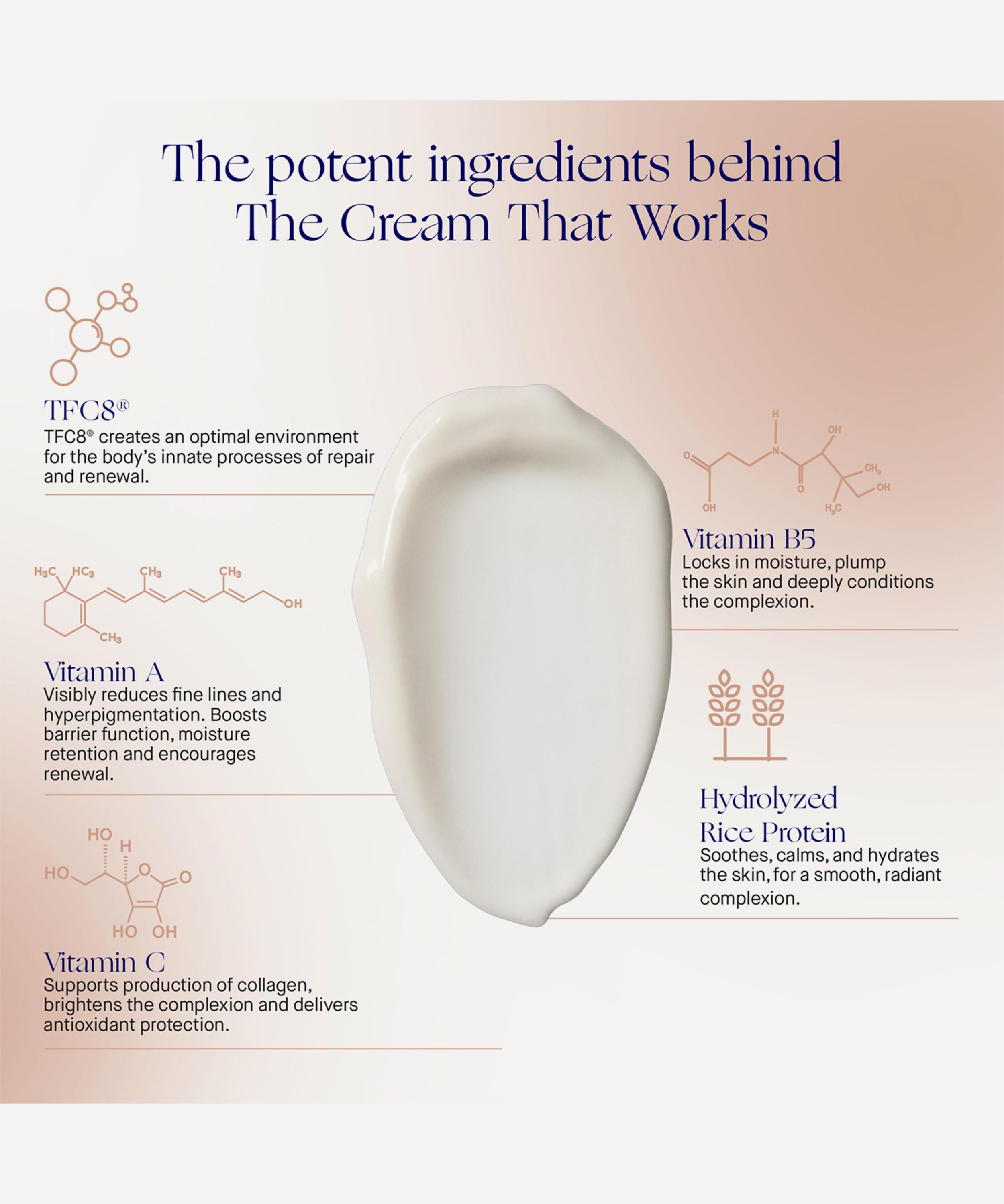 Aqua (Water), Caprylic/Capric Triglyceride, Pentylene Glycol, Propylene Glycol, Hydrogenated Phosphatidylcholine, Glycerin, Sorbitol, Butyrospermum Parkii (Shea) Butter, Tocopheryl Acetate, Butylene Glycol, Xanthan Gum, Panthenol, Sodium Carbomer, Aloe Barbadensis Leaf Juice, Retinyl Palmitate, Hydrolyzed Rice Protein, Squalane, Helianthus Annuus (Sunflower) Seed Oil, Phenoxyethanol, Ascorbyl Palmitate, Lecithin, Alcohol, Carbomer, Ceramide NP, TFC-8, Sodium Benzoate, Glycine Soja (Soybean) Protein, Superoxide Dismutase, Citric Acid, Sodium Hydroxide, Dextran, Palmitoyl Tripeptide-8, Ascorbic Acid, Ethylhexylglycerin, Tocopherol, Potassium Sorbate, Sodium Dextran Sulfate (Allergens: soy)