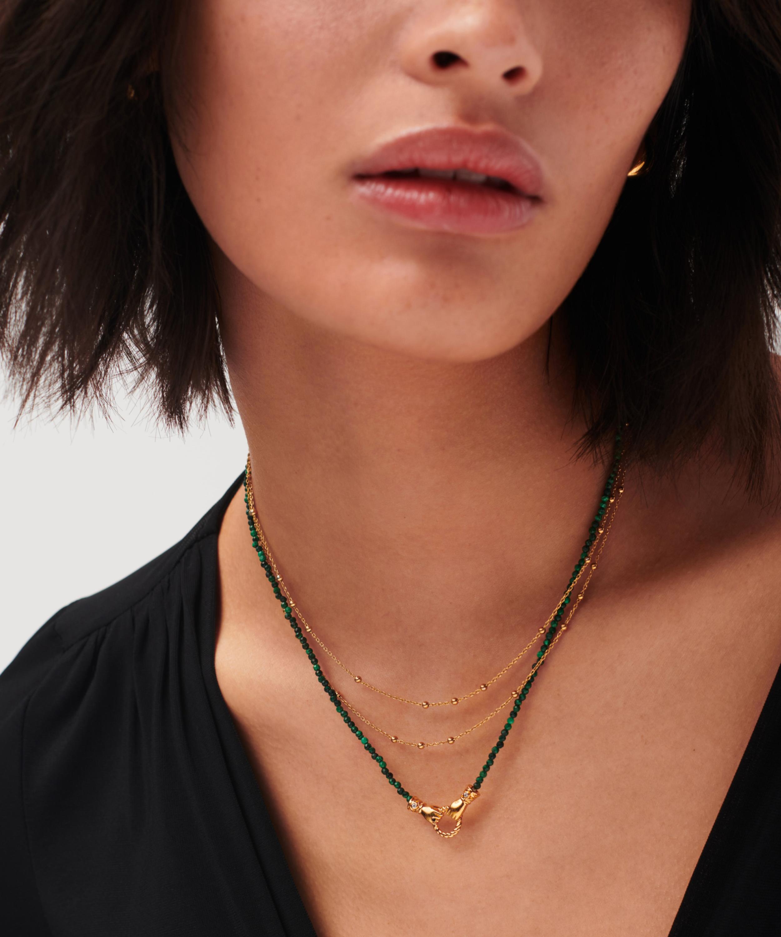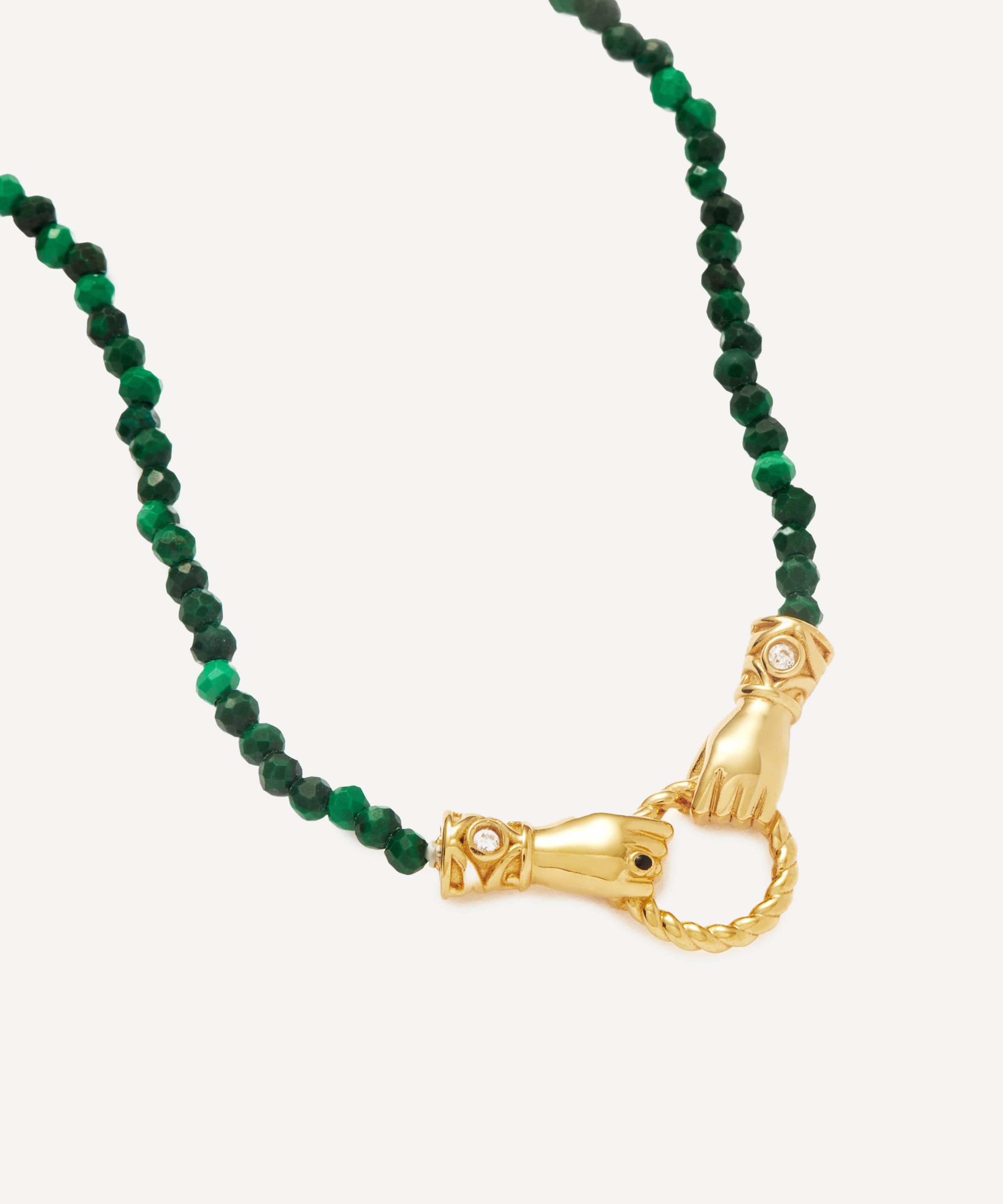 Curate your own bespoke stack with this beaded gemstone necklace from the Harris Reed x Missoma collection. Crafted from gold-plated brass, it's made up of green malachite beads and two Georgian-style hands, inspired by the collections popular ‘In Good Hands’ design, holding a twisted ring. Each cuff has been embellished with a white cubic zirconia and one hand features a black enamel ring. Wear it solo, or team with an assortment of necklaces or matching pieces from the collection.