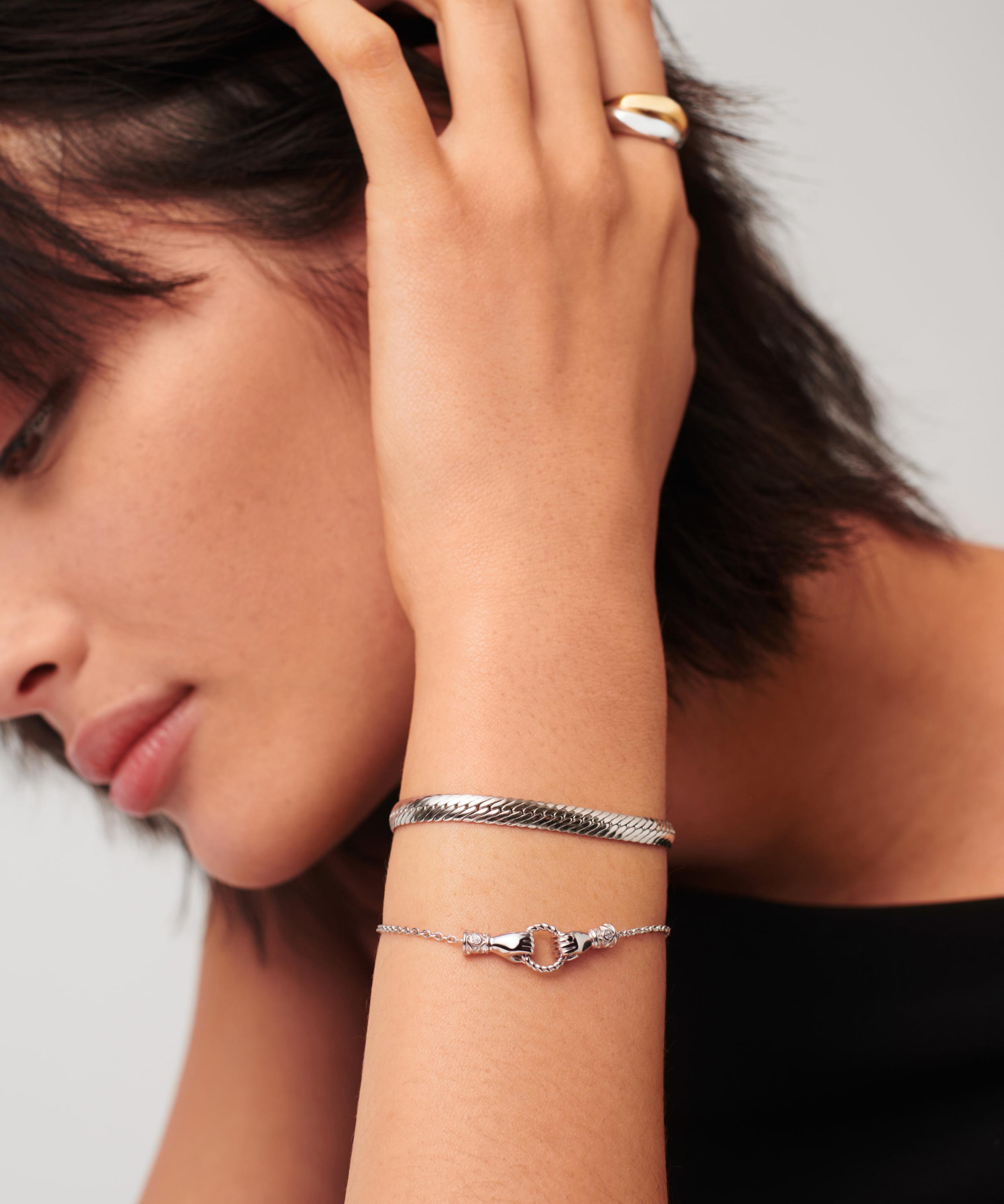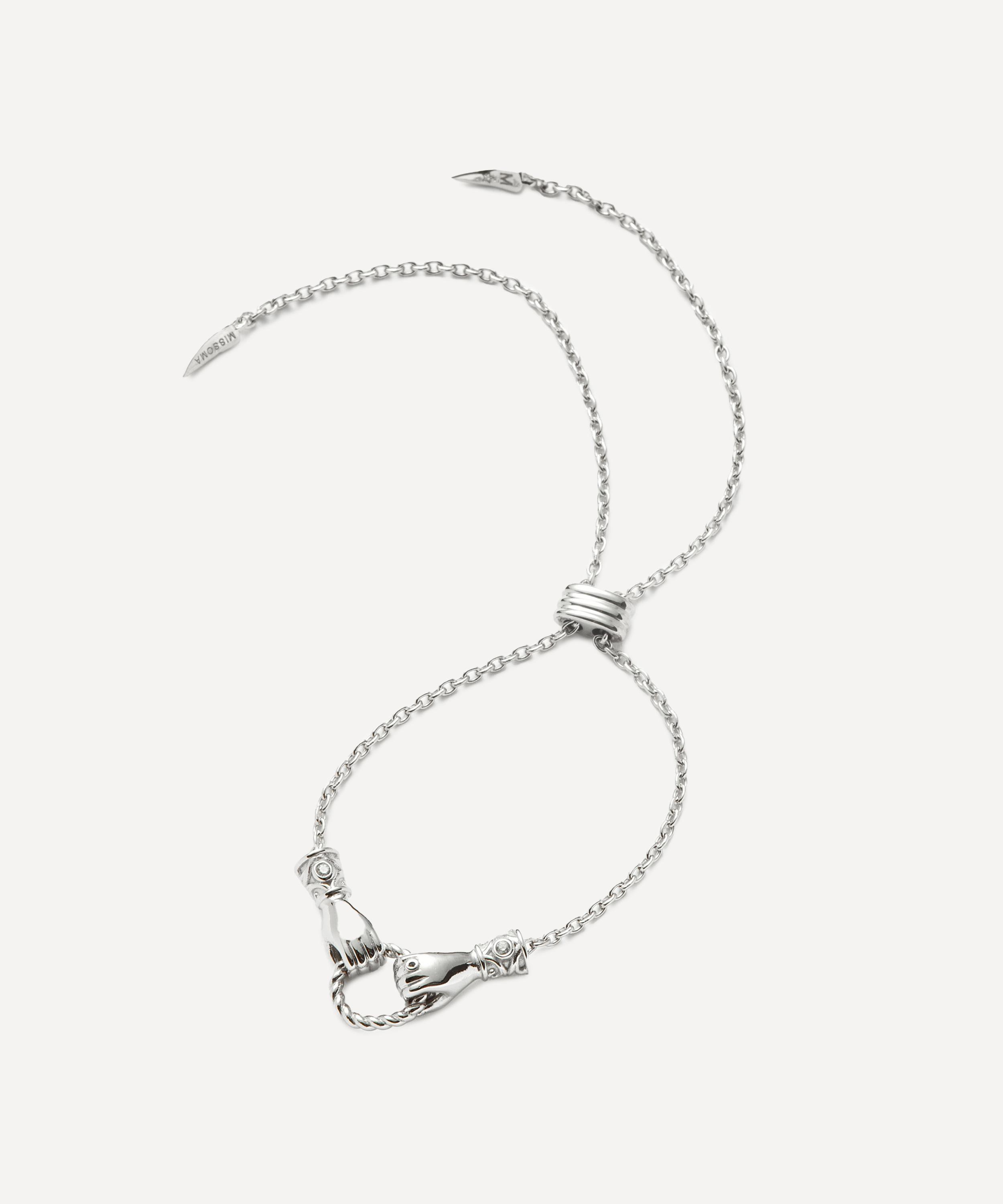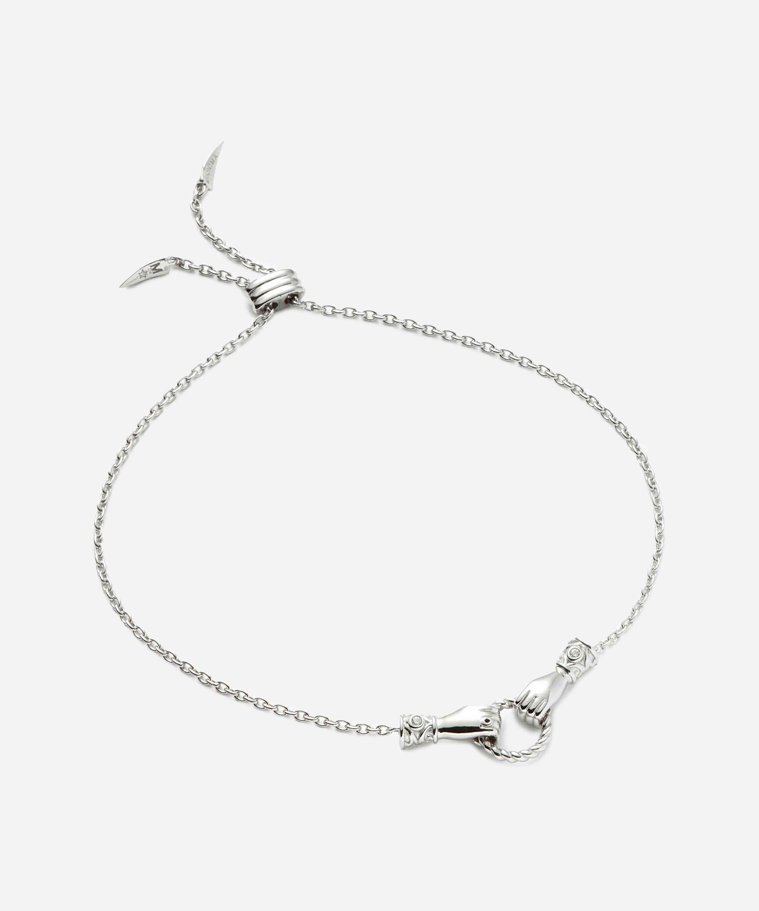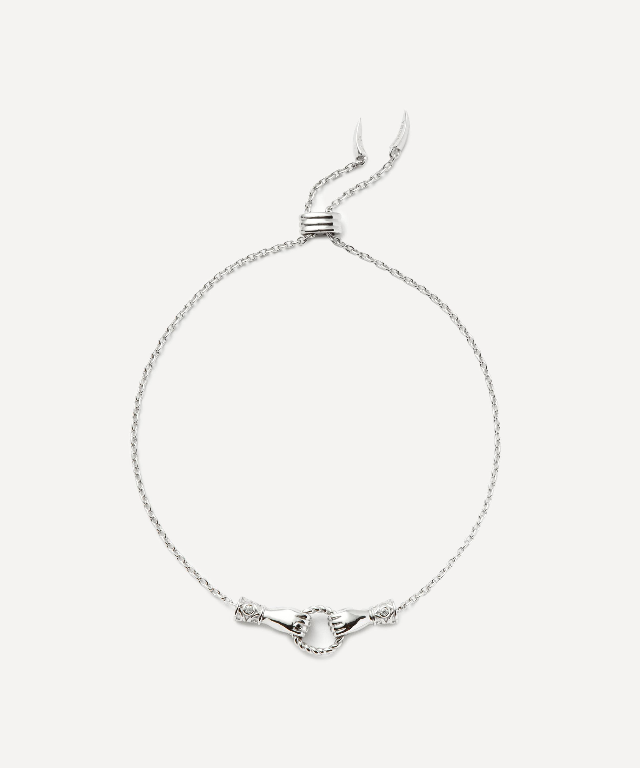 Curate your own bespoke stack with this bracelet from the Harris Reed x Missoma collection. Crafted from silver-plated brass, it features a fine cable chain and two Georgian-style hands, inspired by the collections popular ‘In Good Hands’ design, holding a twisted ring. Each cuff has been embellished with a white cubic zirconia and one hand features a black enamel ring. Wear it solo, or team with an assortment of bracelets or matching pieces from the collection.