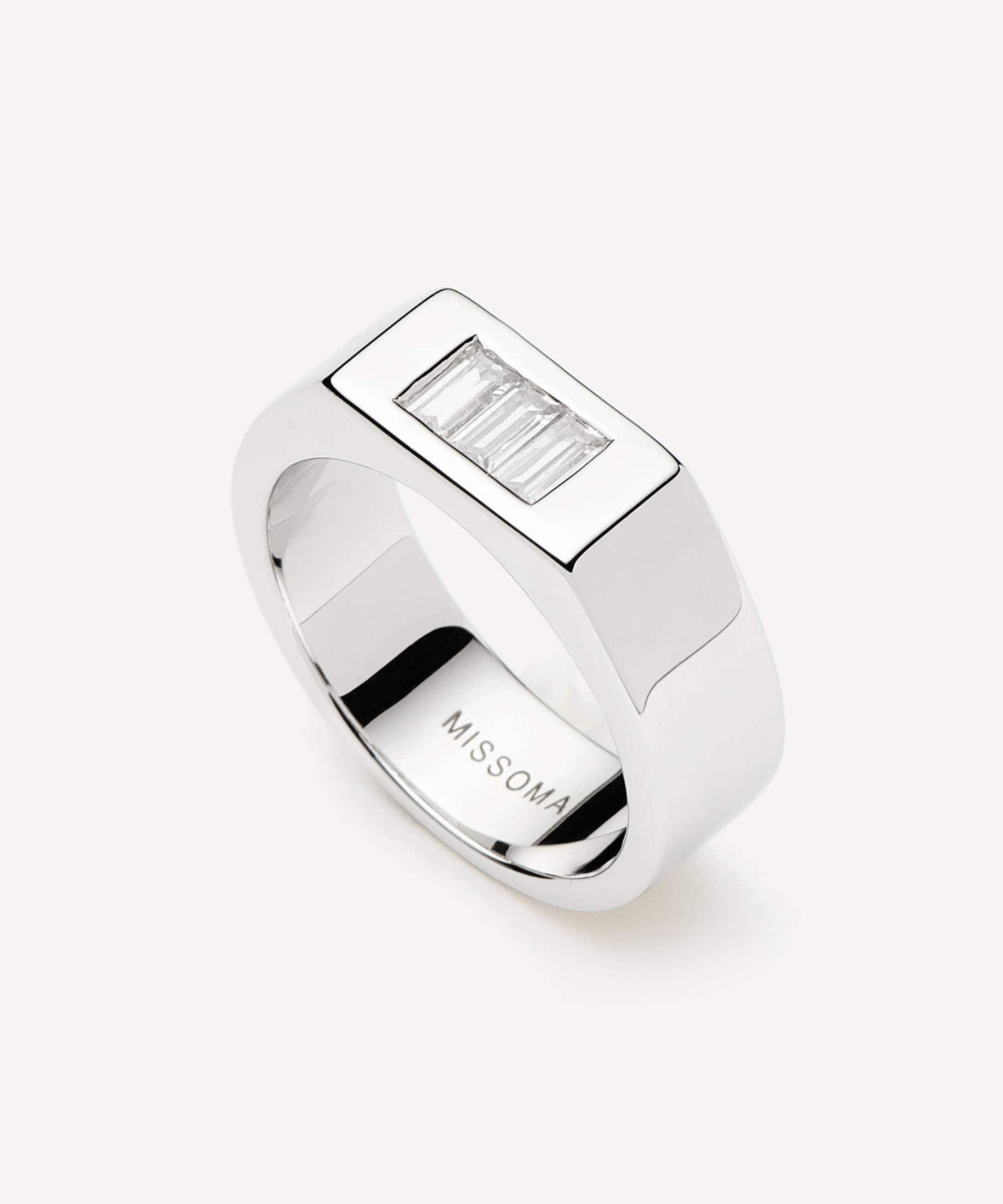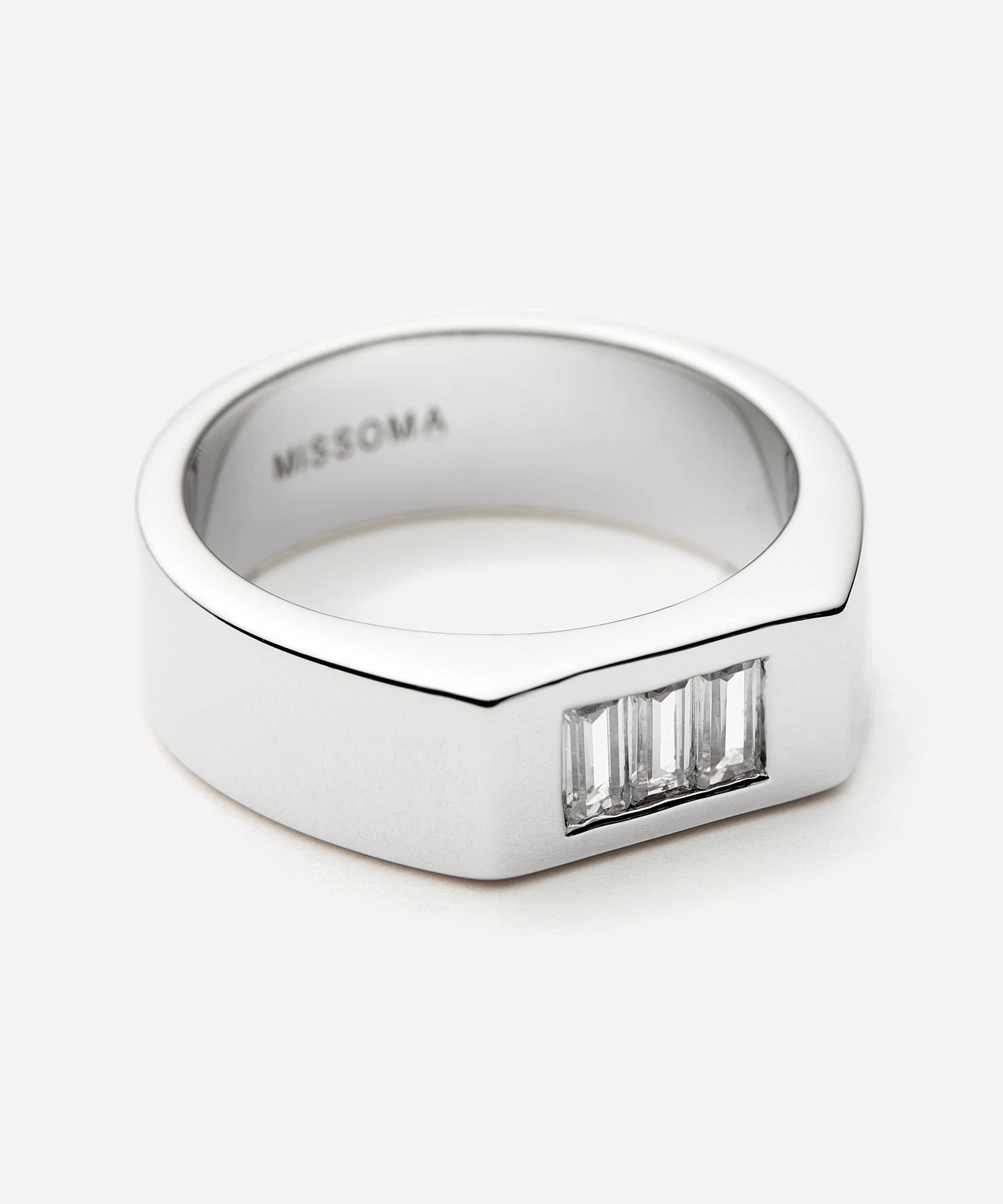 Make a statement and elevate your outfit with the standout Triple Stone Chunky Ring from Missoma, in collaboration with Lucy Williams. Crafted from rhodium-plated brass, it features a chunky silhouette, adorned with three baguette cut cubic zirconia stones. Perfect for every day and special occasions, style yours solo or stacked, and try pairing it with other iconic Lucy Williams styles.