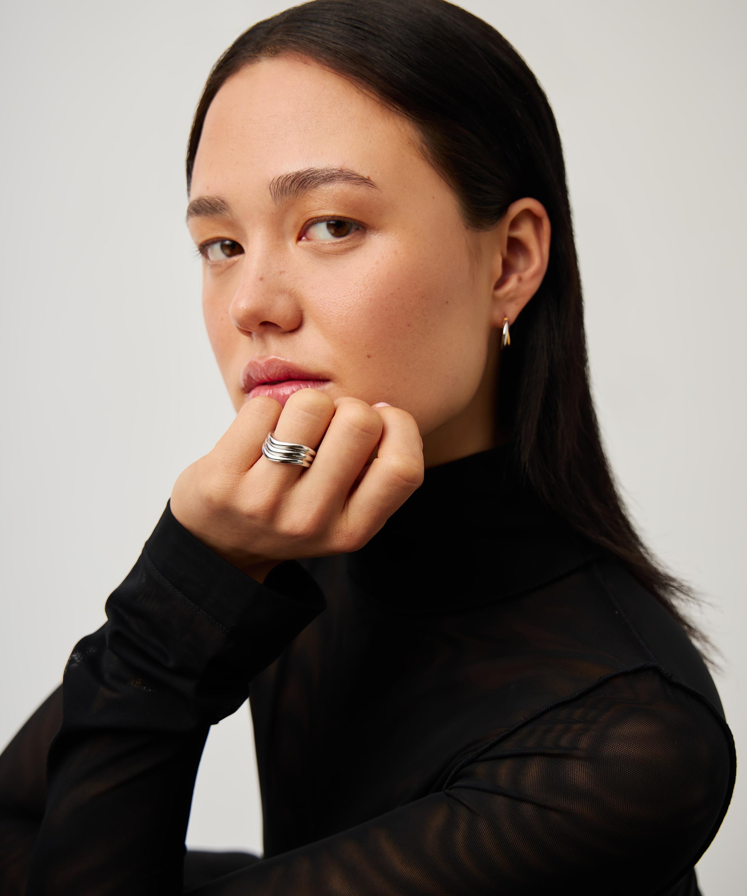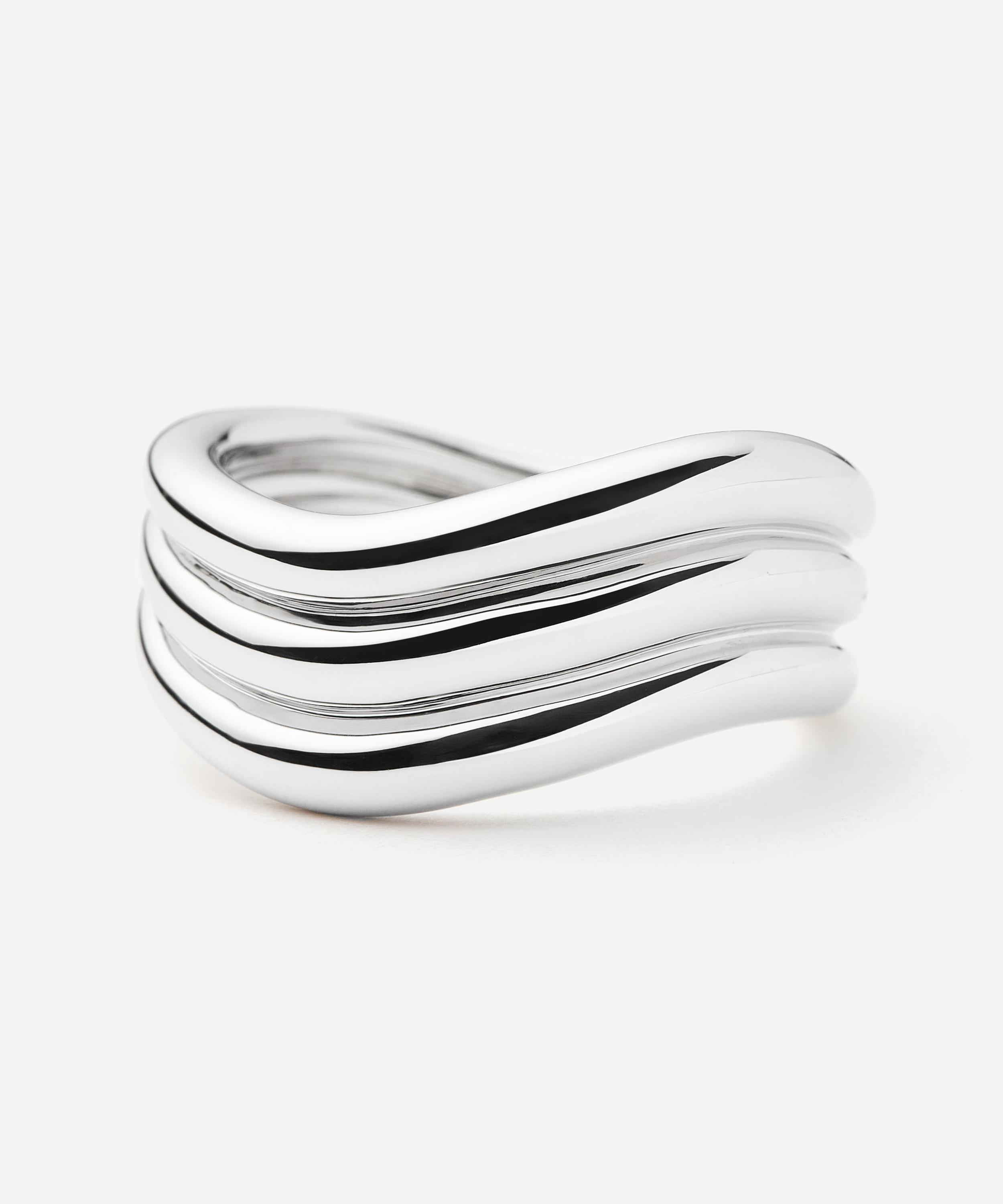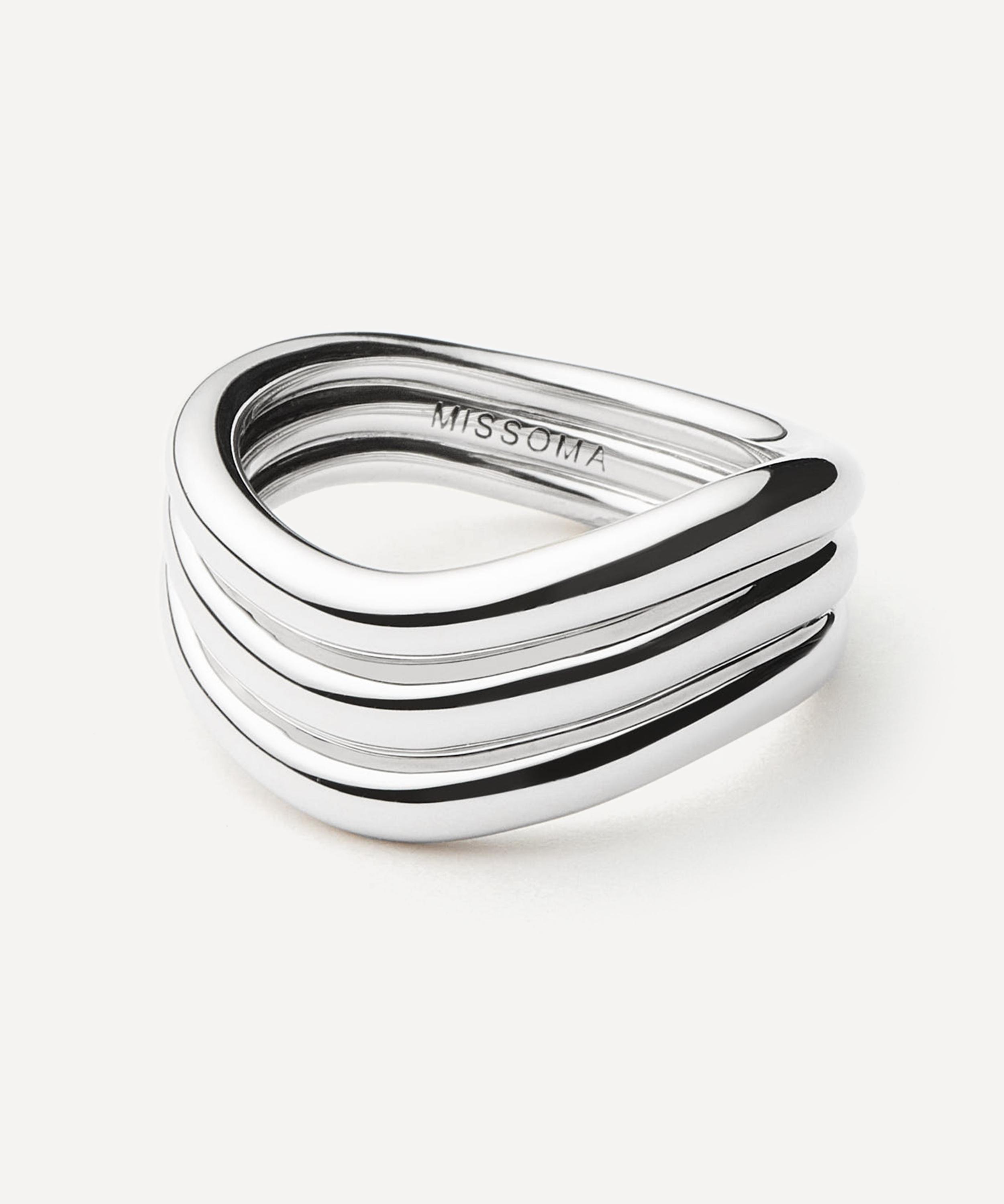 Made from polished, rhodium-plated brass, in collaboration with creative SAVISLOOK, it features a triple stacked design, where each band is formed into an organic, fluid silhouette. Style it solo, add it to a ring stack or pair with the matching pieces from the Signature series.