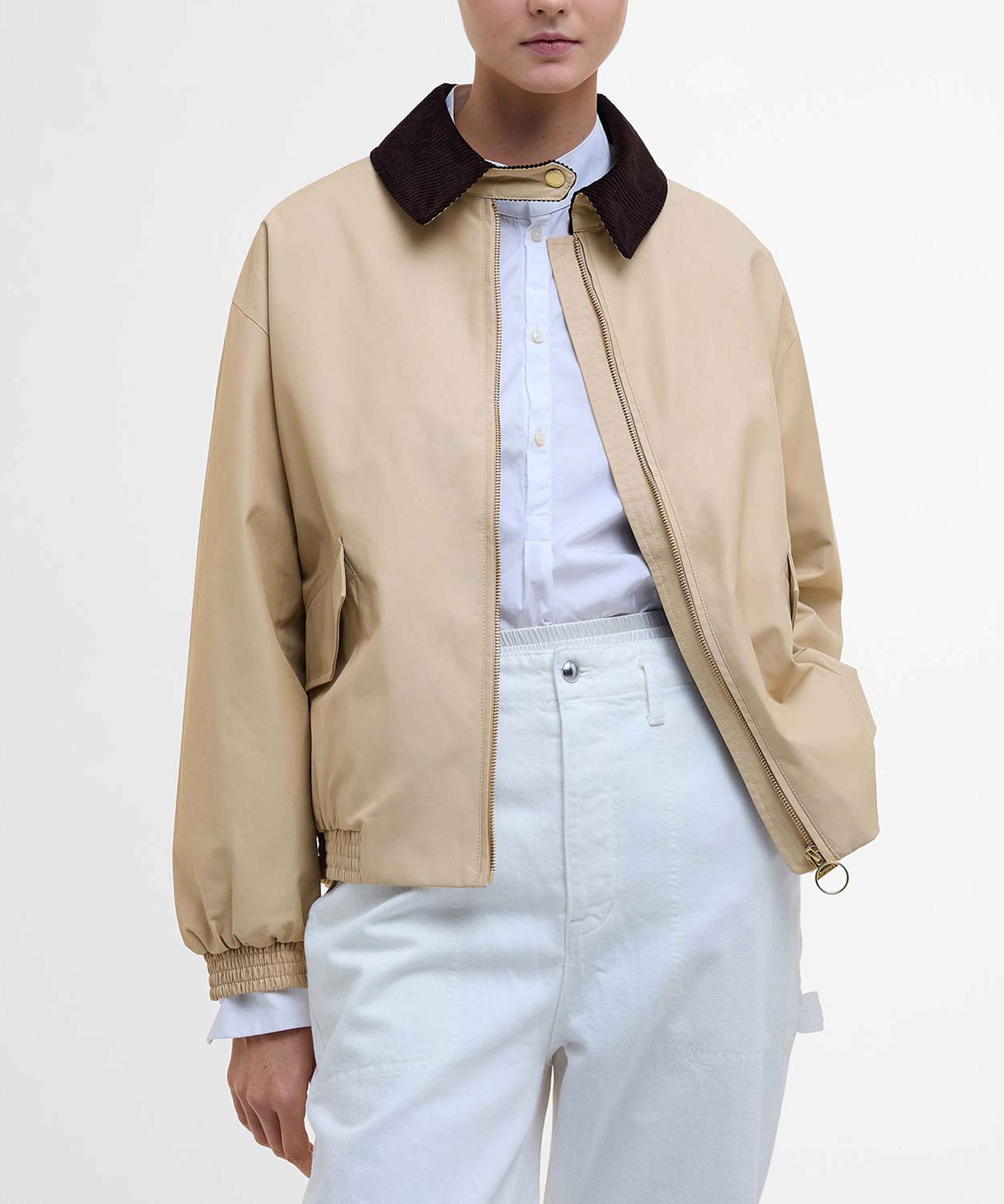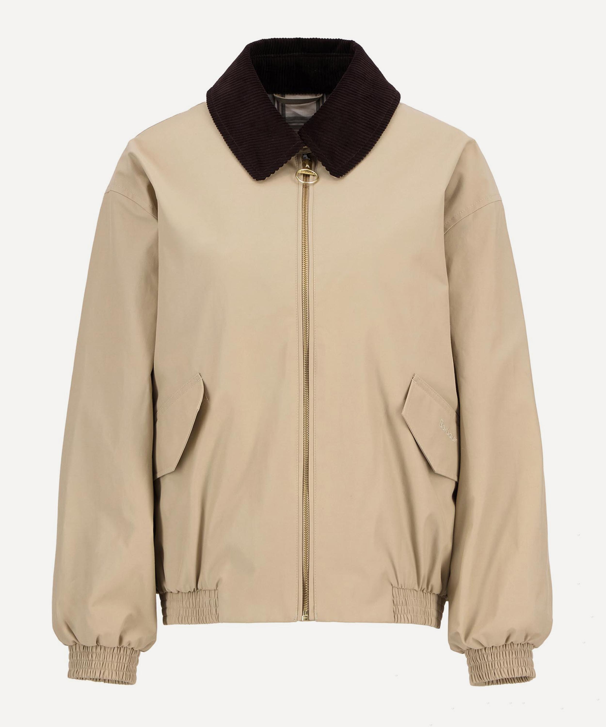 Stylish and effortless, Alexa’s interpretation of the classic bomber jacket features a cinched hem and cuffs, adding a casual masculine edge to any wardrobe. Detailed with signature Barbour fittings, including a traditional 8-wale cord collar and throat guard, this shower-proof jacket seamlessly combines timeless style with rugged functionality.