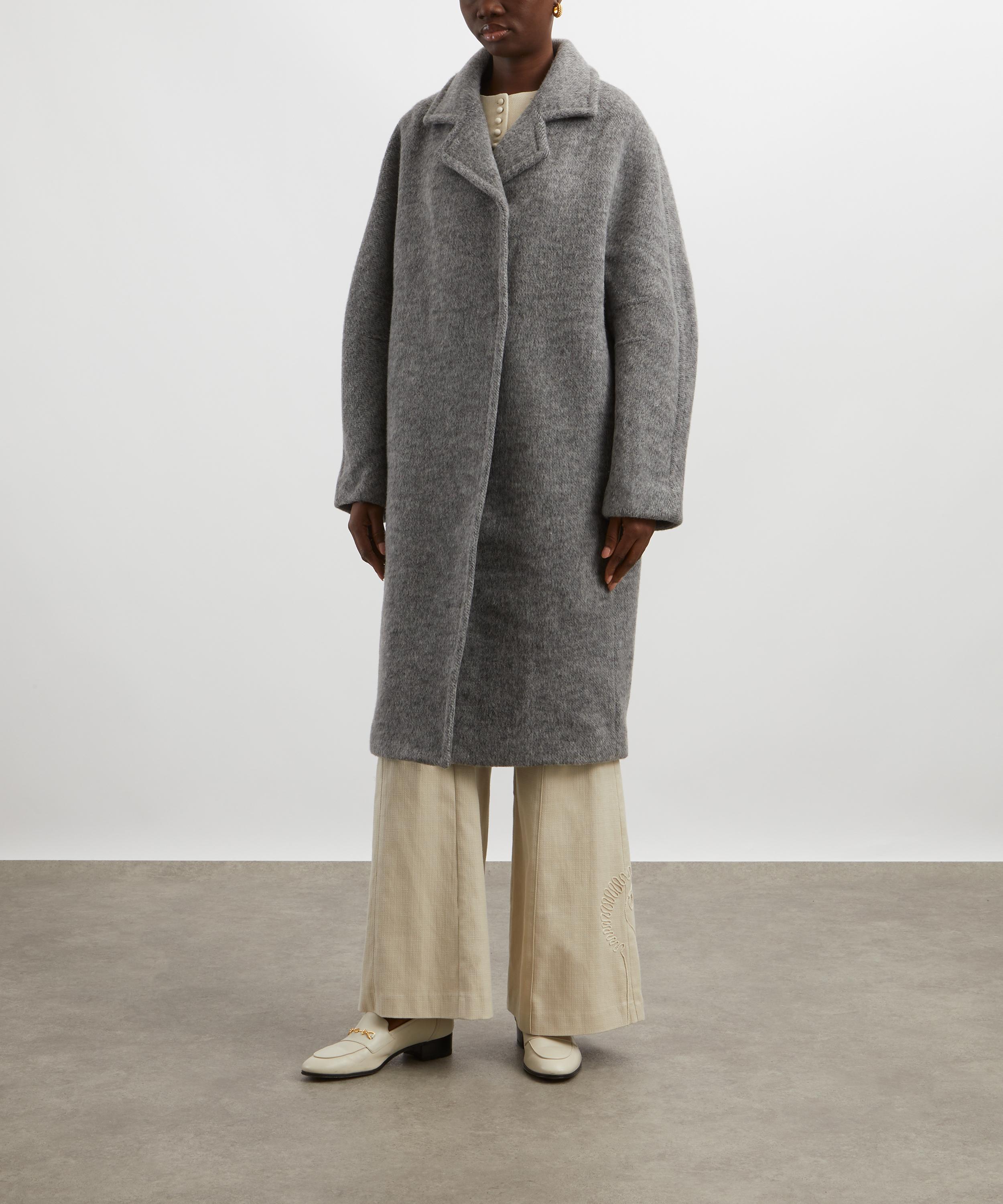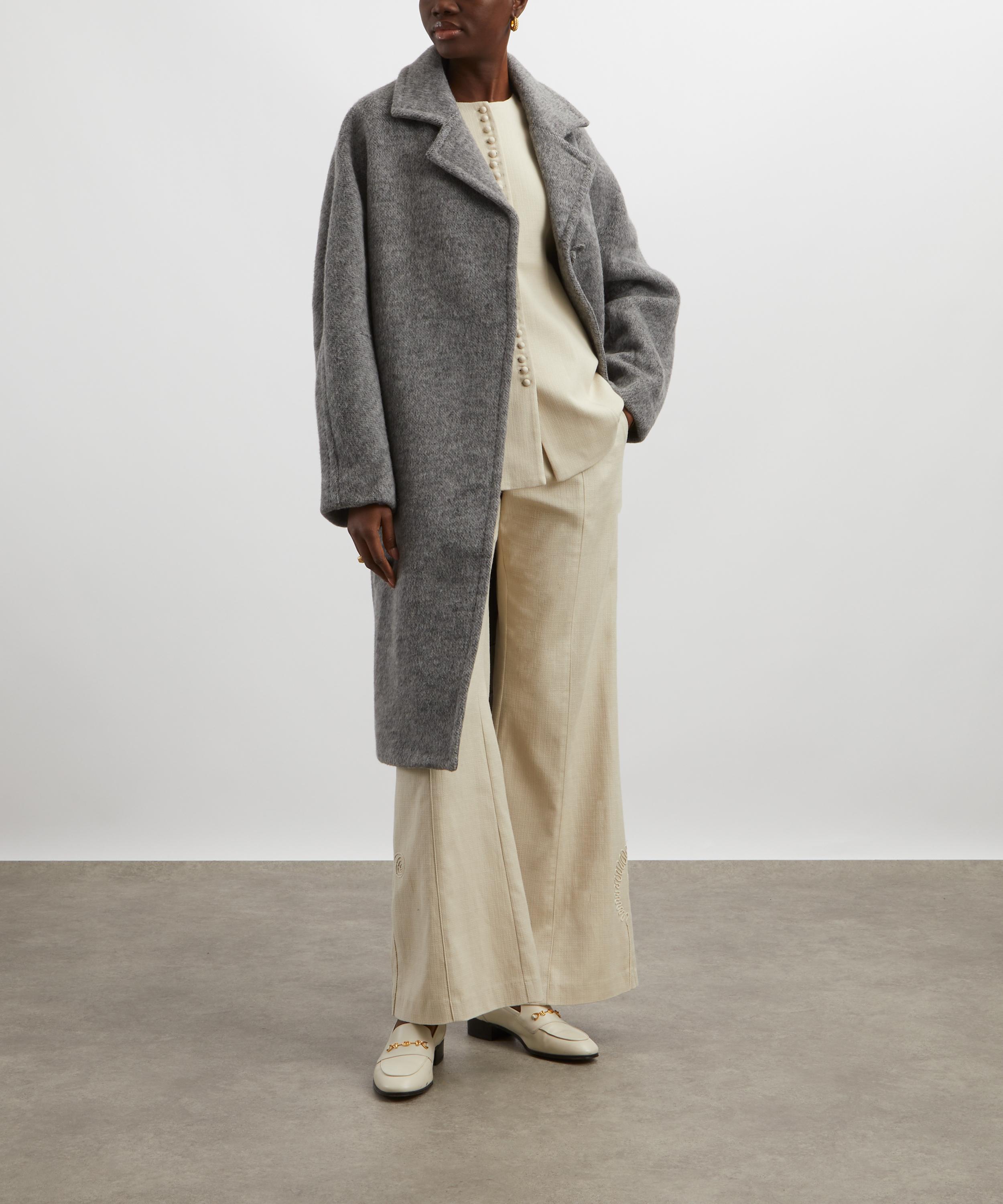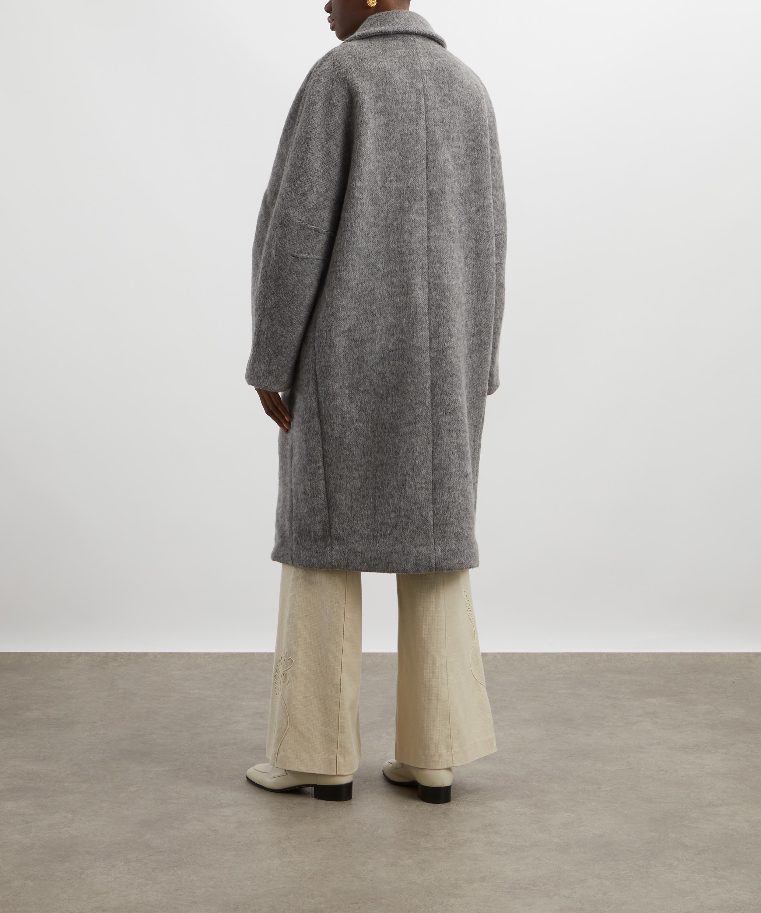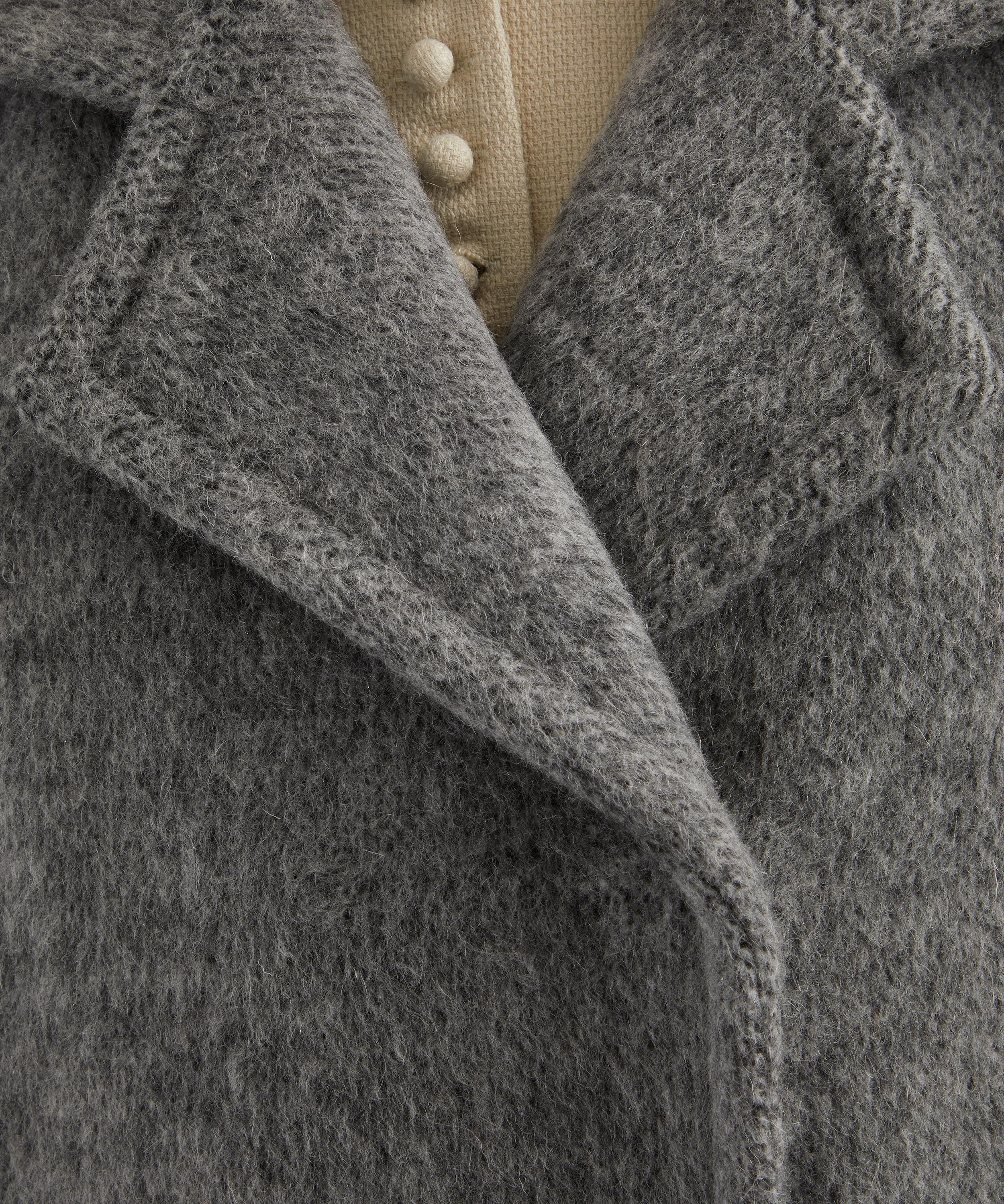 Luxuriously crafted from a soft charcoal wool blend, this double-breasted style features a longline profile that wraps at the centre front, with dolman sleeves and subtle darts for a rounded cocoon silhouette. A timeless design with refined detailing, the inseam pockets, self-covered buttons, and welt buttonholes highlight premium finishing.