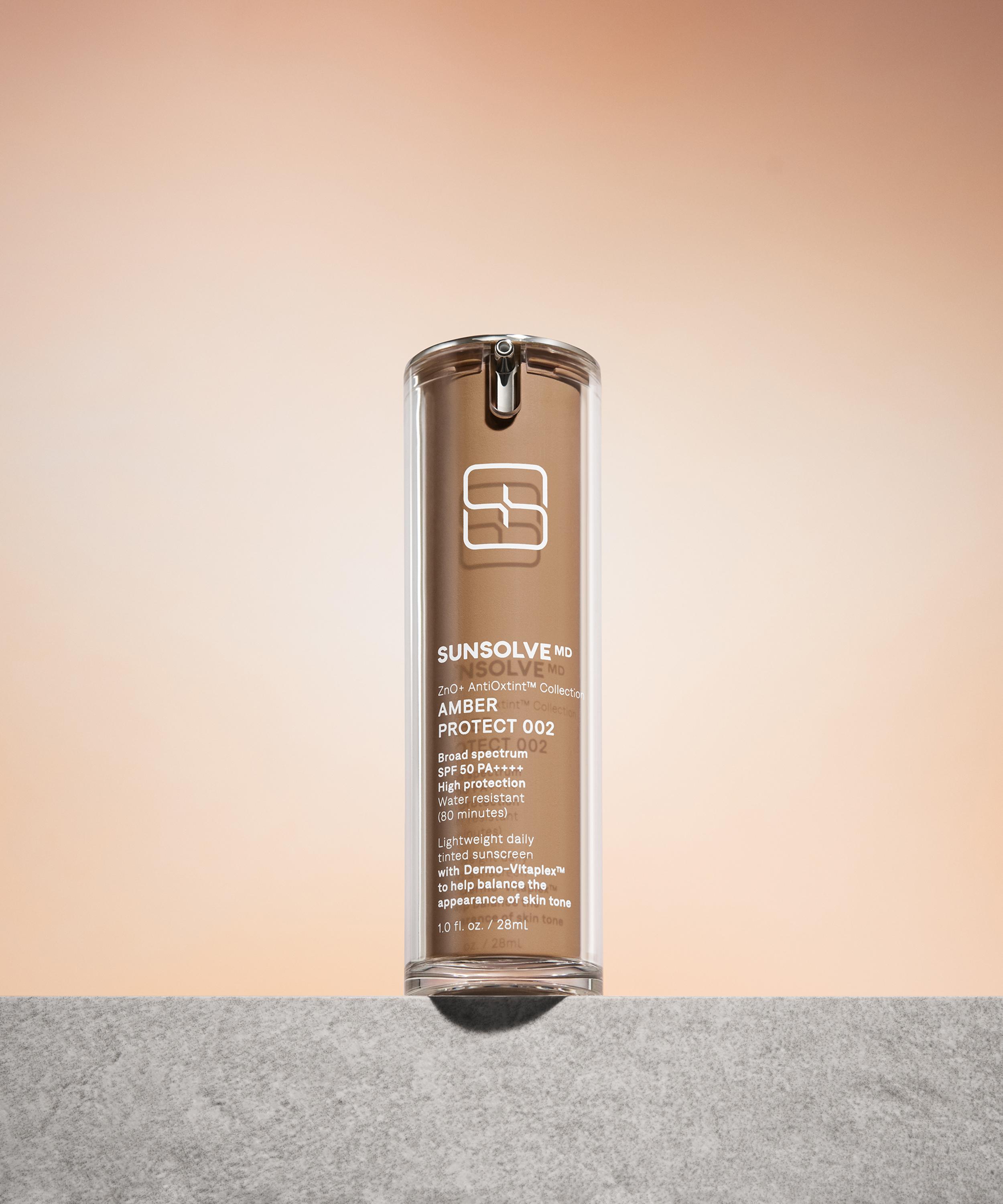 Enhance your skin and blur imperfections with SunsolveMD’s daily-wear ZnO + AntiOxtint Amber Protect, a multi-tasking tinted mineral sunscreen with broad spectrum SPF 50 that instantly evens your skin tone with a soft-matte, silky finish.