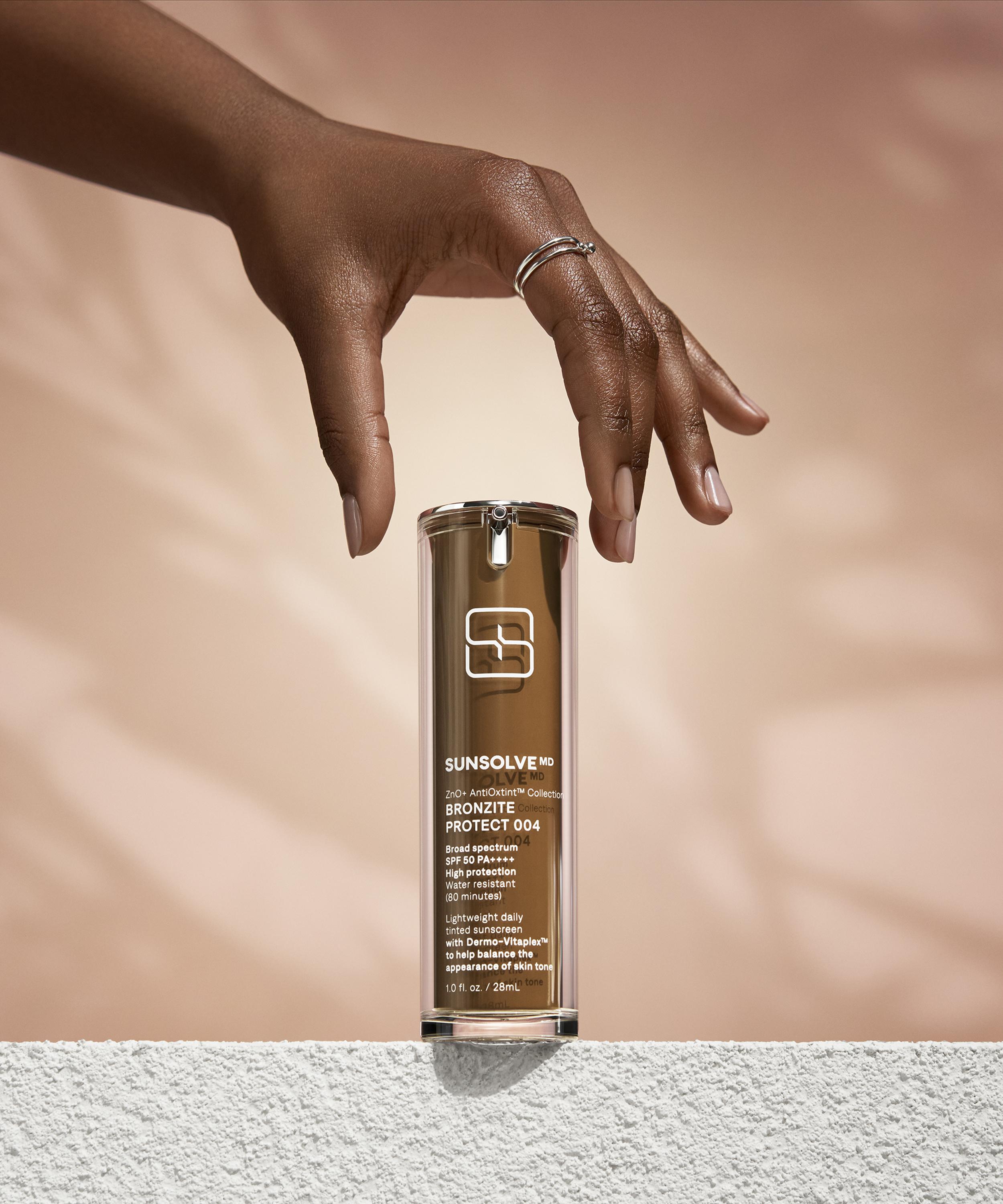 Enhance your skin and blur imperfections with SunsolveMD’s daily-wear ZnO + AntiOxtint Bronzite Protect, a multi-tasking tinted mineral sunscreen with broad spectrum SPF 50 that instantly evens your skin tone with a soft-matte, silky finish.