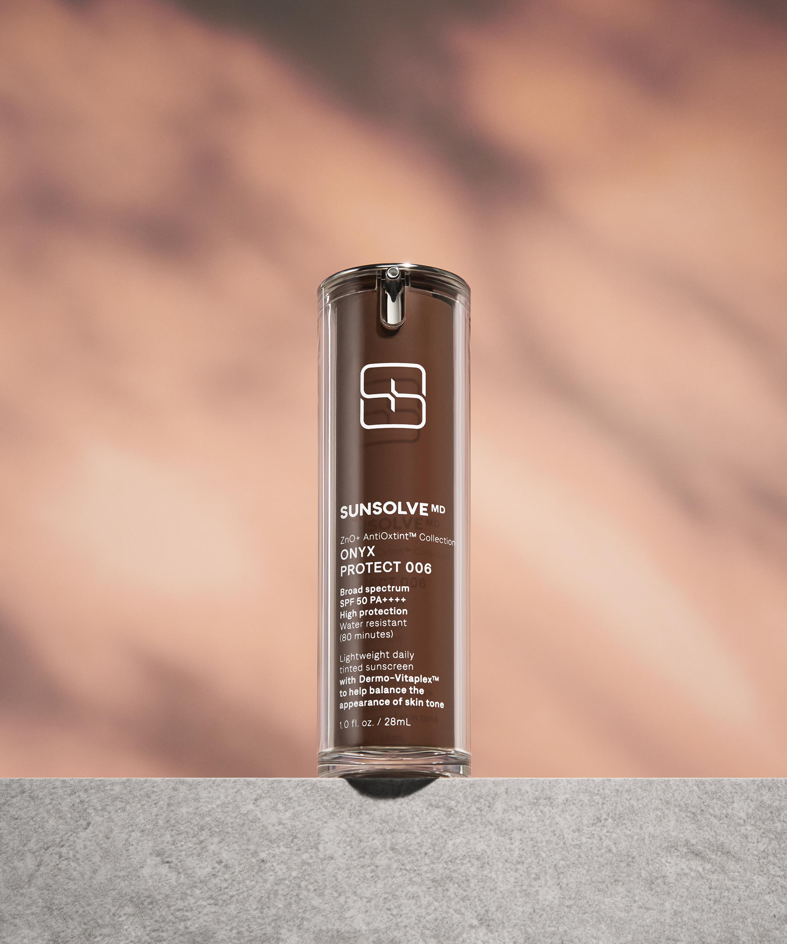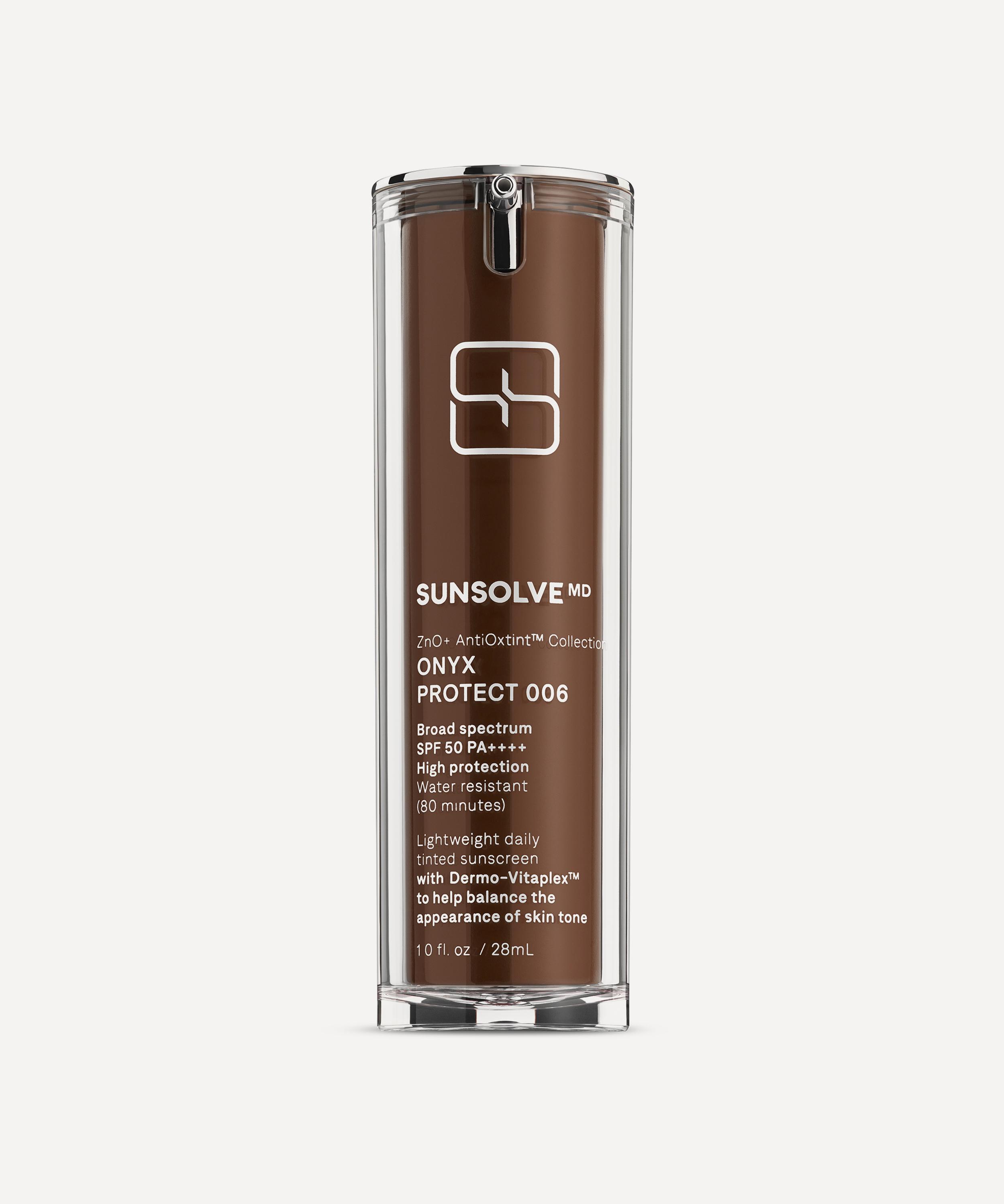 Enhance your skin and blur imperfections with SunsolveMD’s daily-wear ZnO + AntiOxtint Onyx Protect, a multi-tasking tinted mineral sunscreen with broad spectrum SPF 50 that instantly evens your skin tone with a soft-matte, silky finish.
