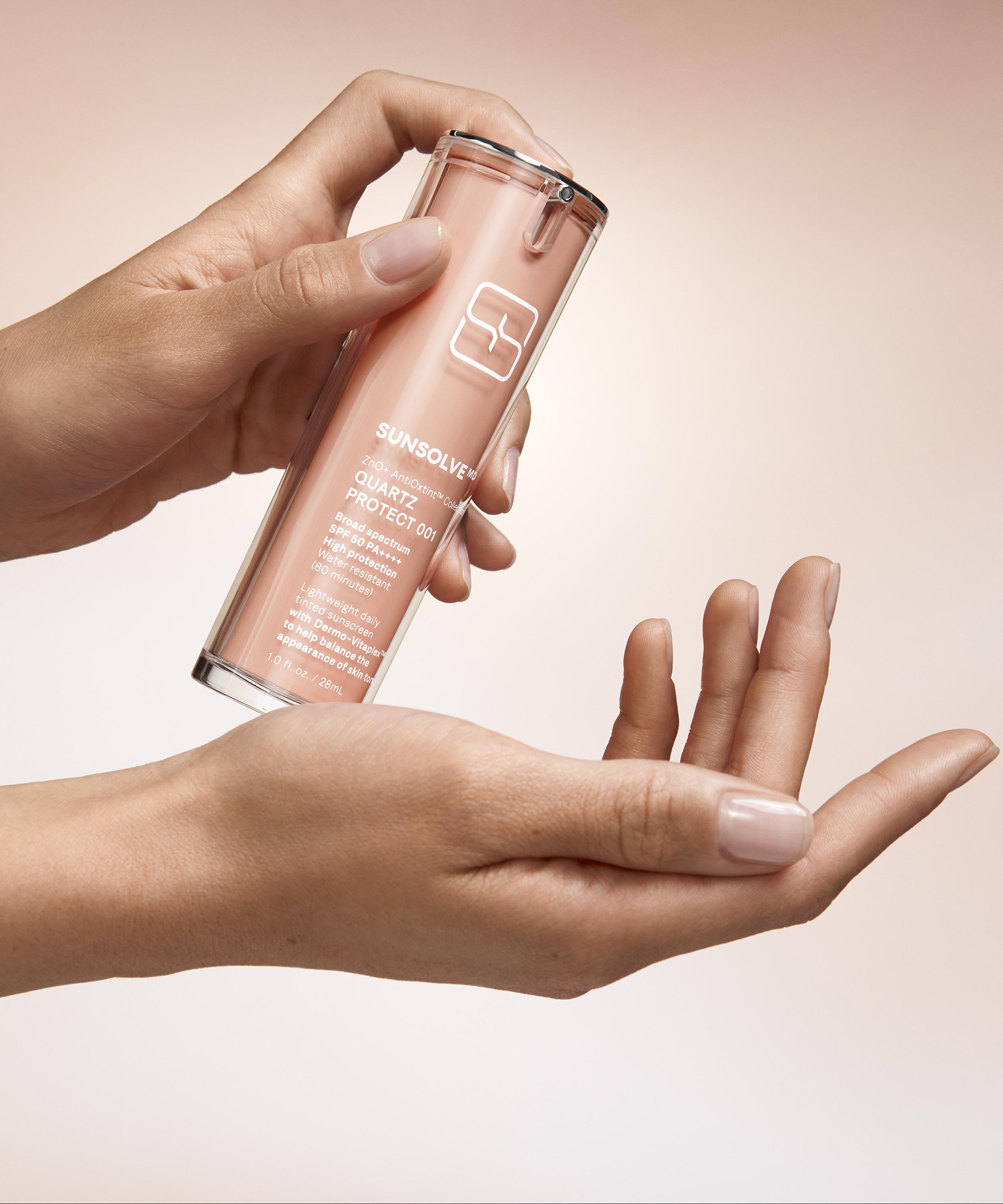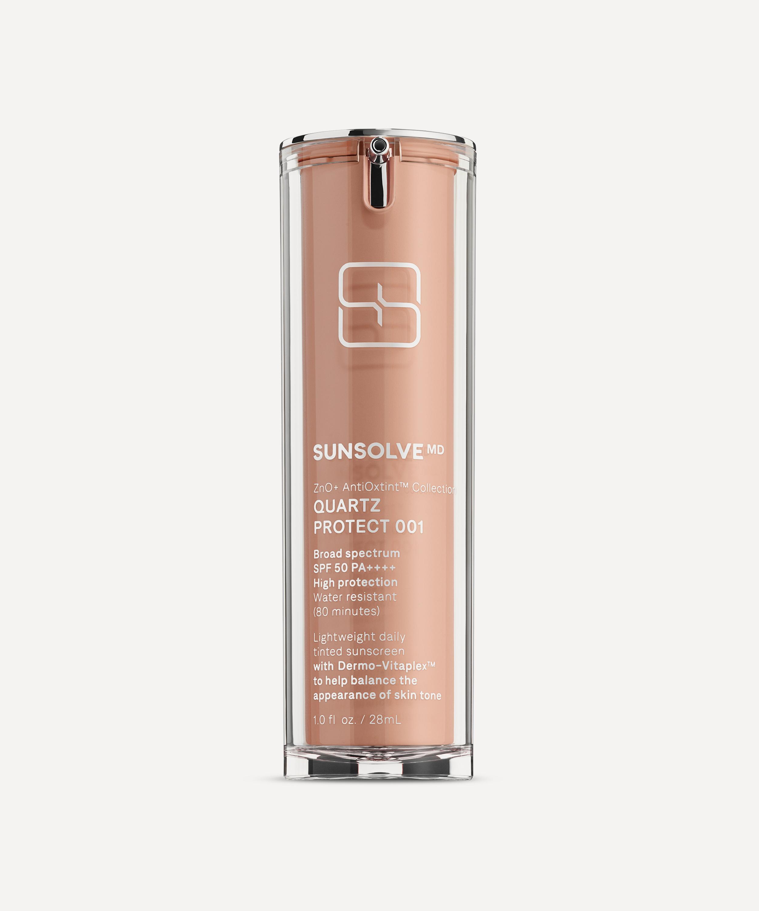 Enhance your skin and blur imperfections with SunsolveMD’s daily-wear ZnO + AntiOxtint Quartz Protect, a multi-tasking tinted mineral sunscreen with broad spectrum SPF 50 that instantly evens your skin tone with a soft-matte, silky finish.