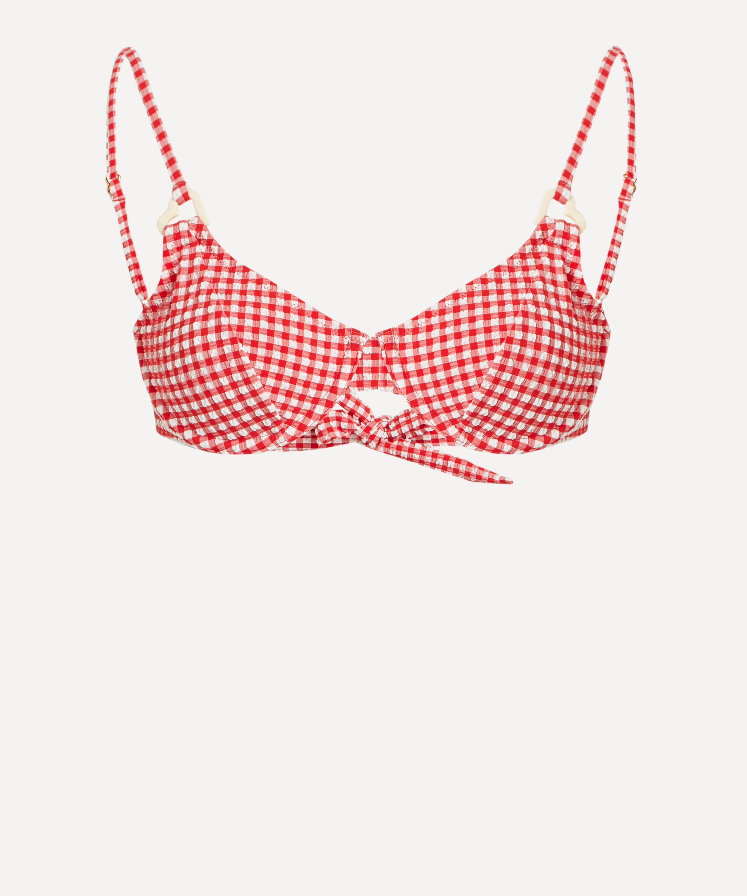 In fiery red gingham seersucker, the Zoe Bikini Top features an underwired design with an adjustable tie back for a supportive, custom fit. Heart-shaped resin rings at the straps and side add a playful, romantic finish.
