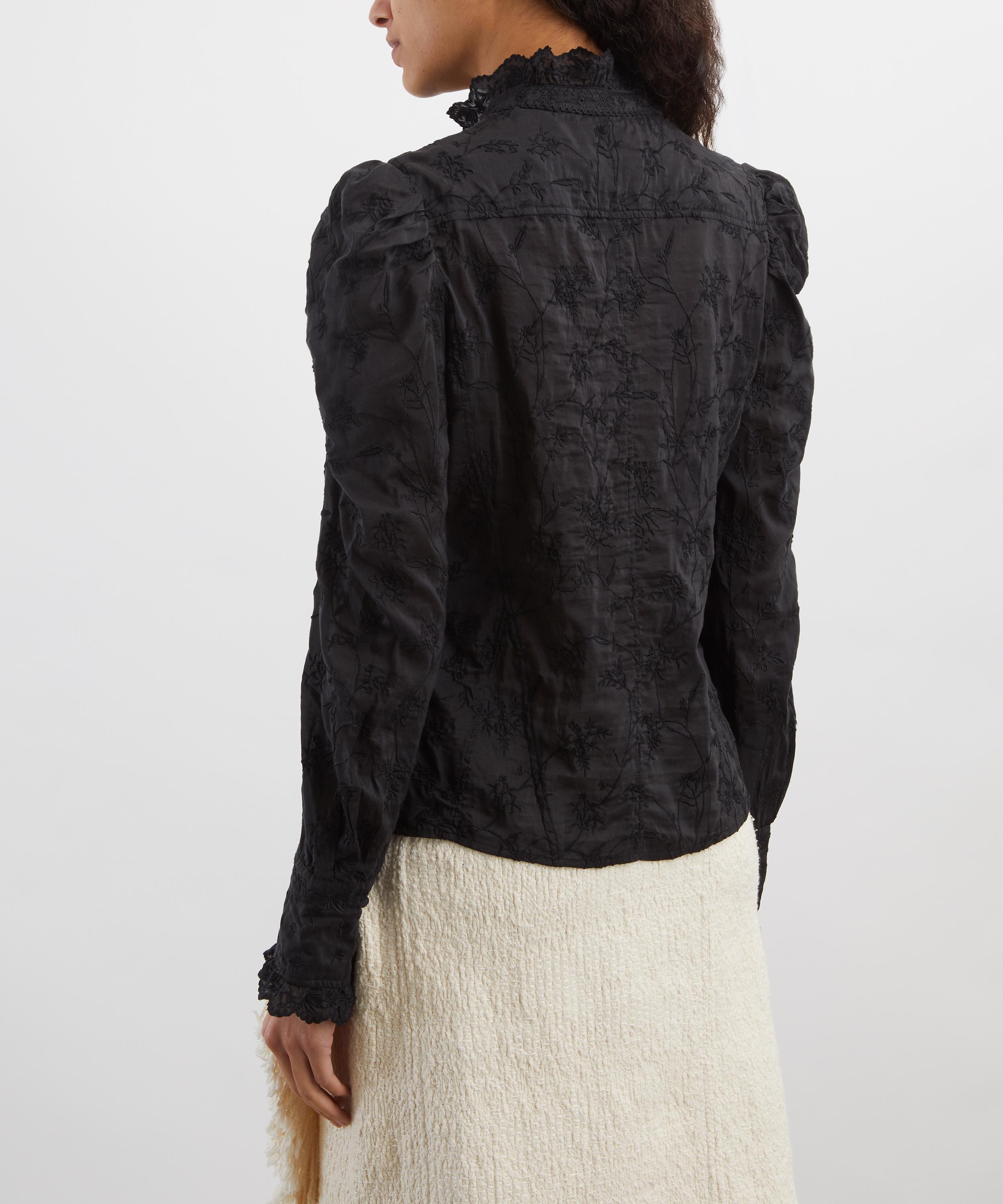 Crafted from a lightweight cotton–silk blend, this black button-through blouse is adorned all over with intricate floral embroidery. Inspired by classic Edwardian styles, it features a banded collar, gathered sleeves with buttoned cuffs, and broderie anglaise trims for a timeless, romantic finish.