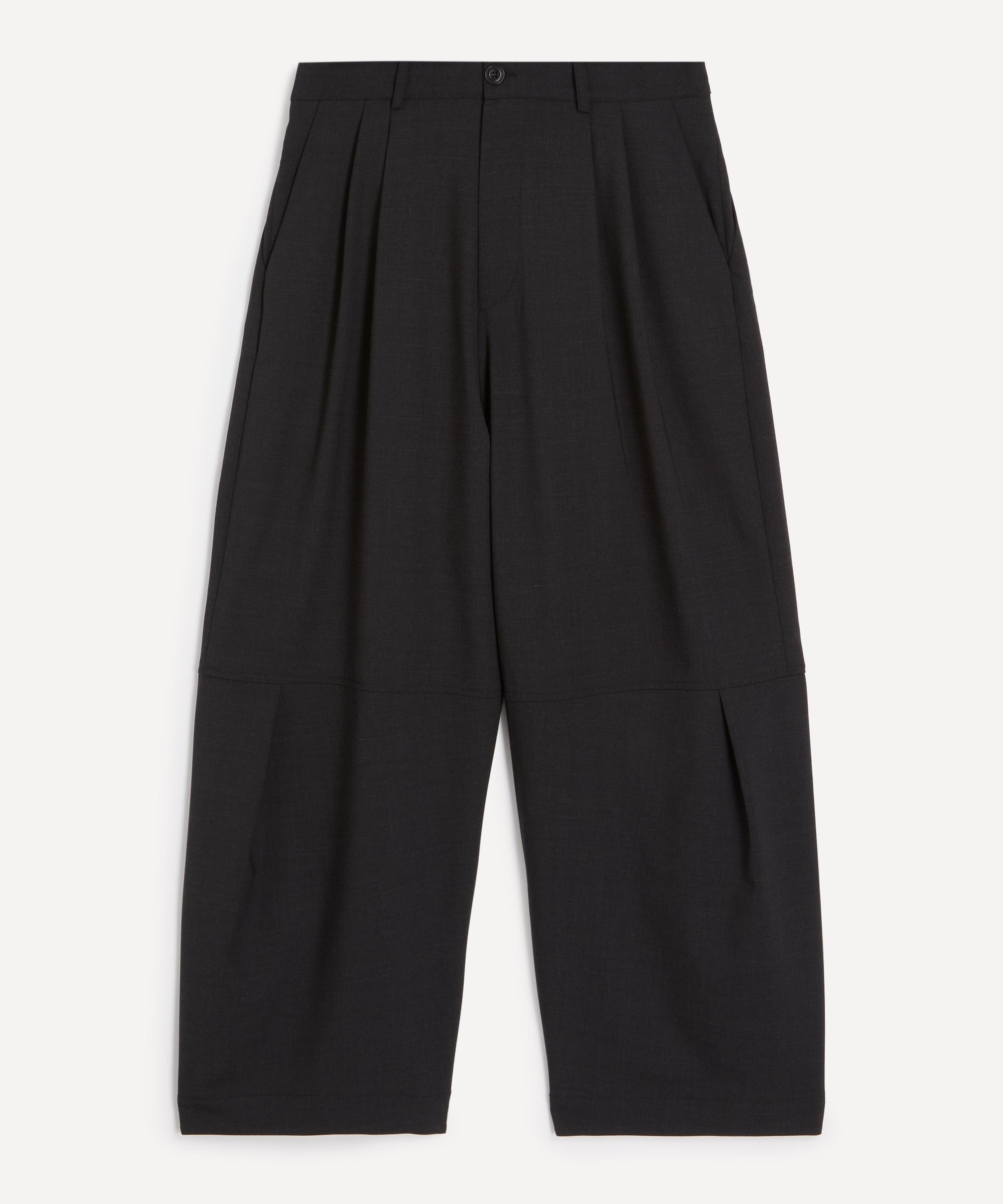These cotton twill trousers feature a high waist, wide-leg silhouette, relaxed fit, front pleating, and side and rear pockets for a refined, utilitarian touch.