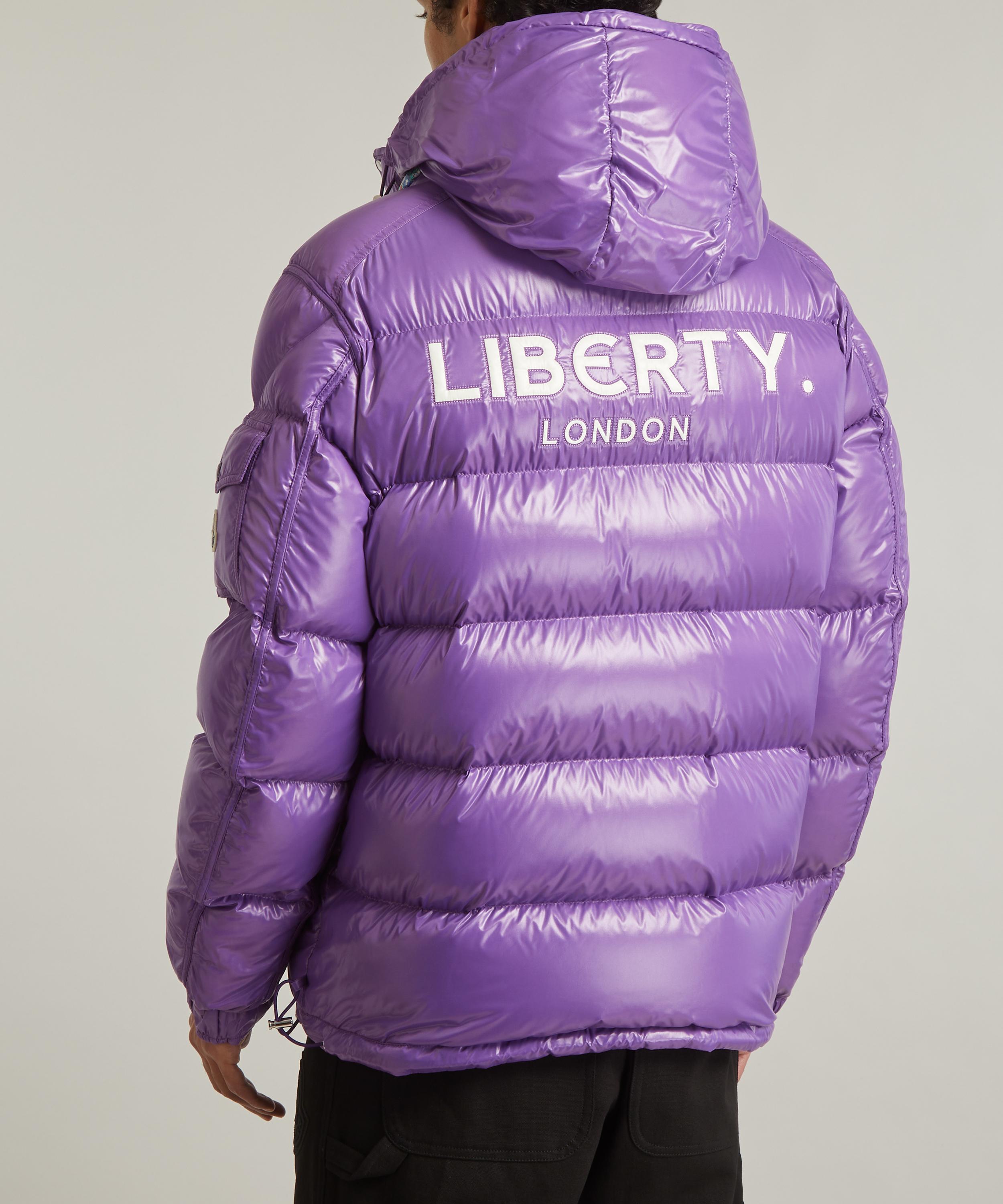 A versatile, two-way design with a distinctive Liberty purple reverse and logo branding embossed on the back, this short puffer jacket features a detachable hood, an adjustable hemline, and a flap pocket on its sleeve with an appliquéd Moncler logo patch for a trademark finishing touch.