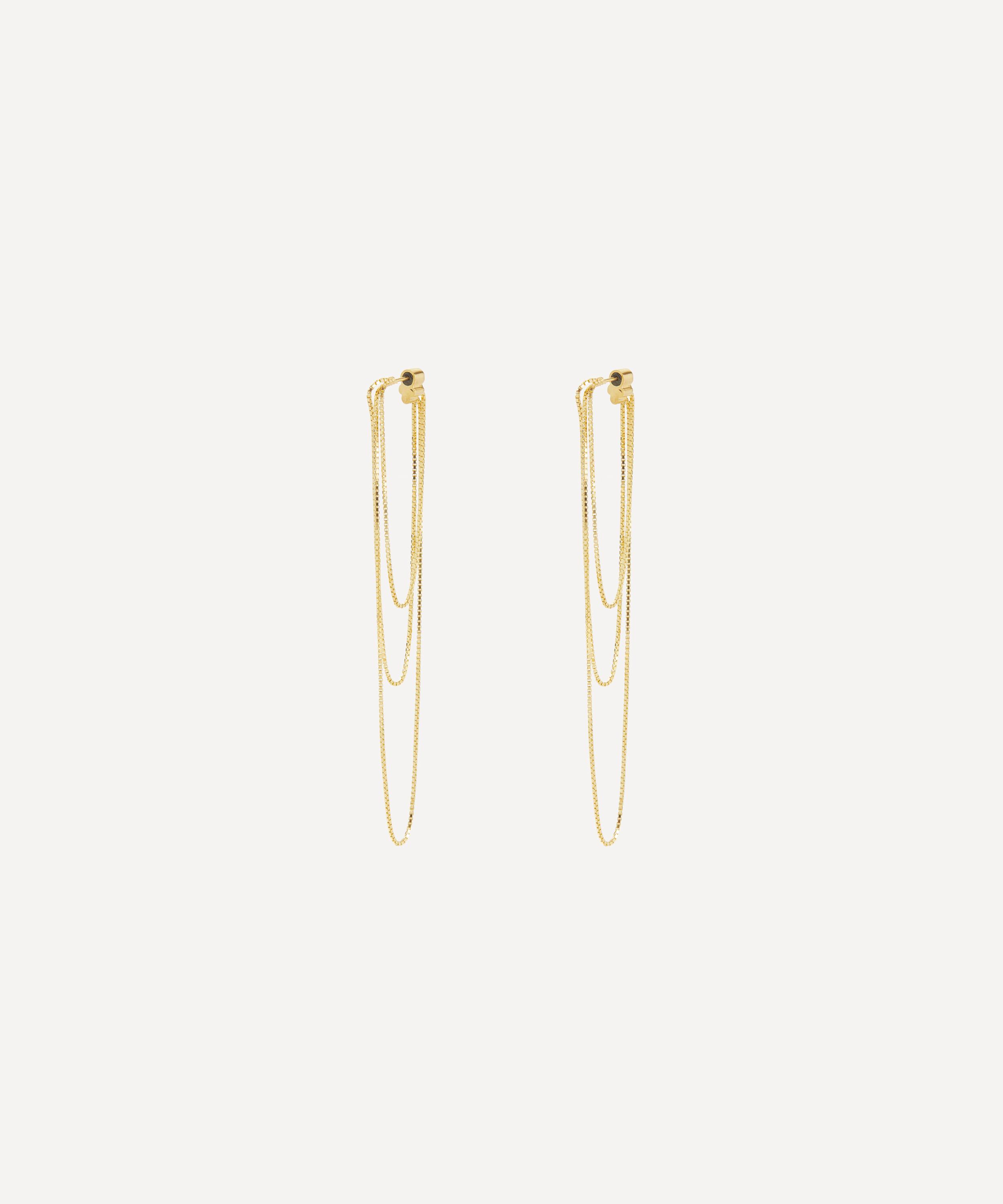 Maggoosh is an extension of the body’s natural movement fashioned into fluid forms, here expressed in the Nighttime Box Chain drop earrings. Crafted from 10ct gold and gold-plated silver, each earring features three graduated box chain drops – offering a glowing liquidity that makes them look like the continuation of your hair. Style yours with complimenting pieces from the brand’s extensive collection, or favourites from your own jewellery archive.