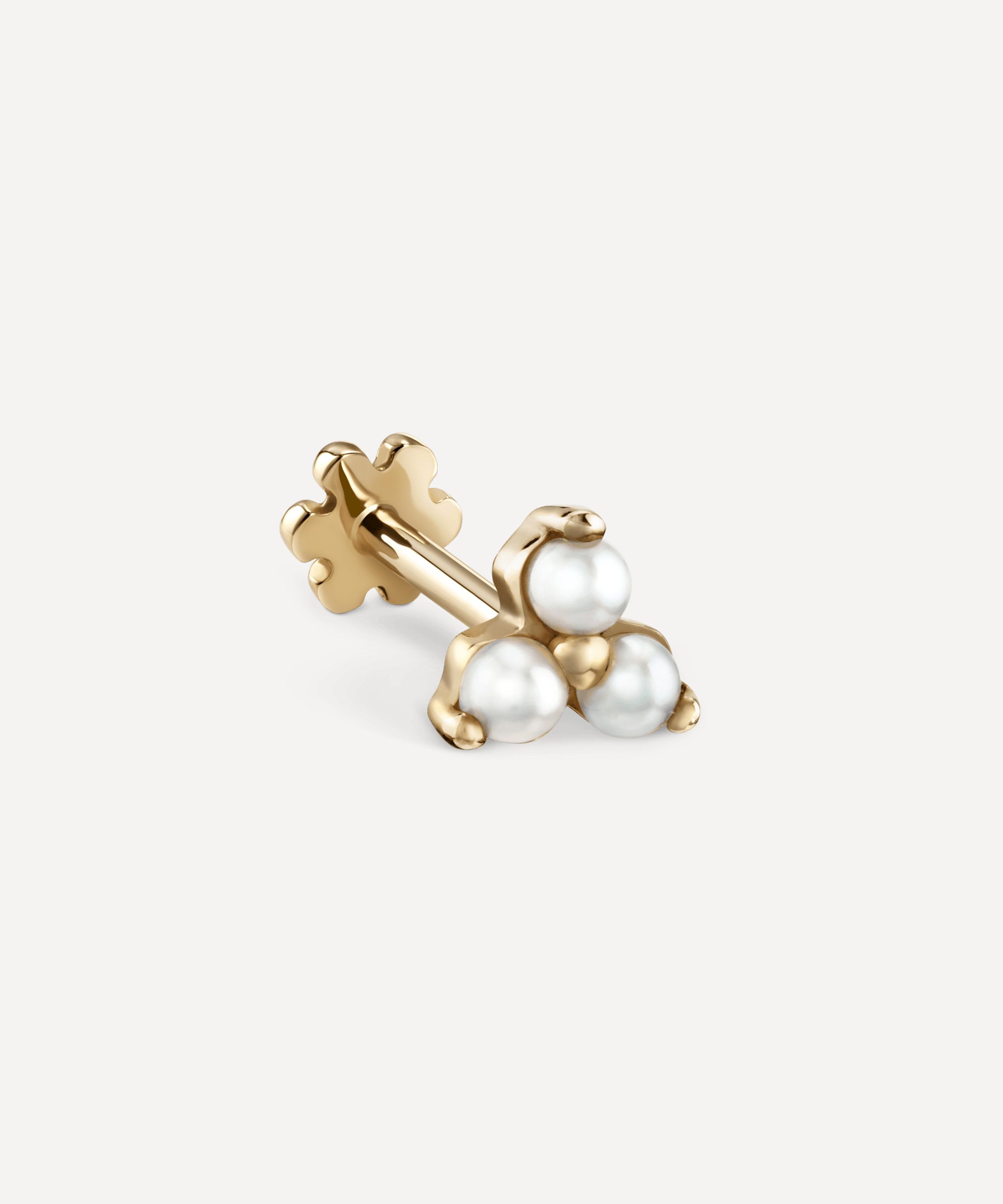 Available in multiple variations of high-polished 14 carat gold, this single stud earrings features a trio of lustrous white pearls in a cluster of prong settings. Complete with the brand's signature flower threaded backing, it styles beautifully in a range of lobe and cartilage piercings - try layering it with the smaller version for a complexion-illuminating finish.