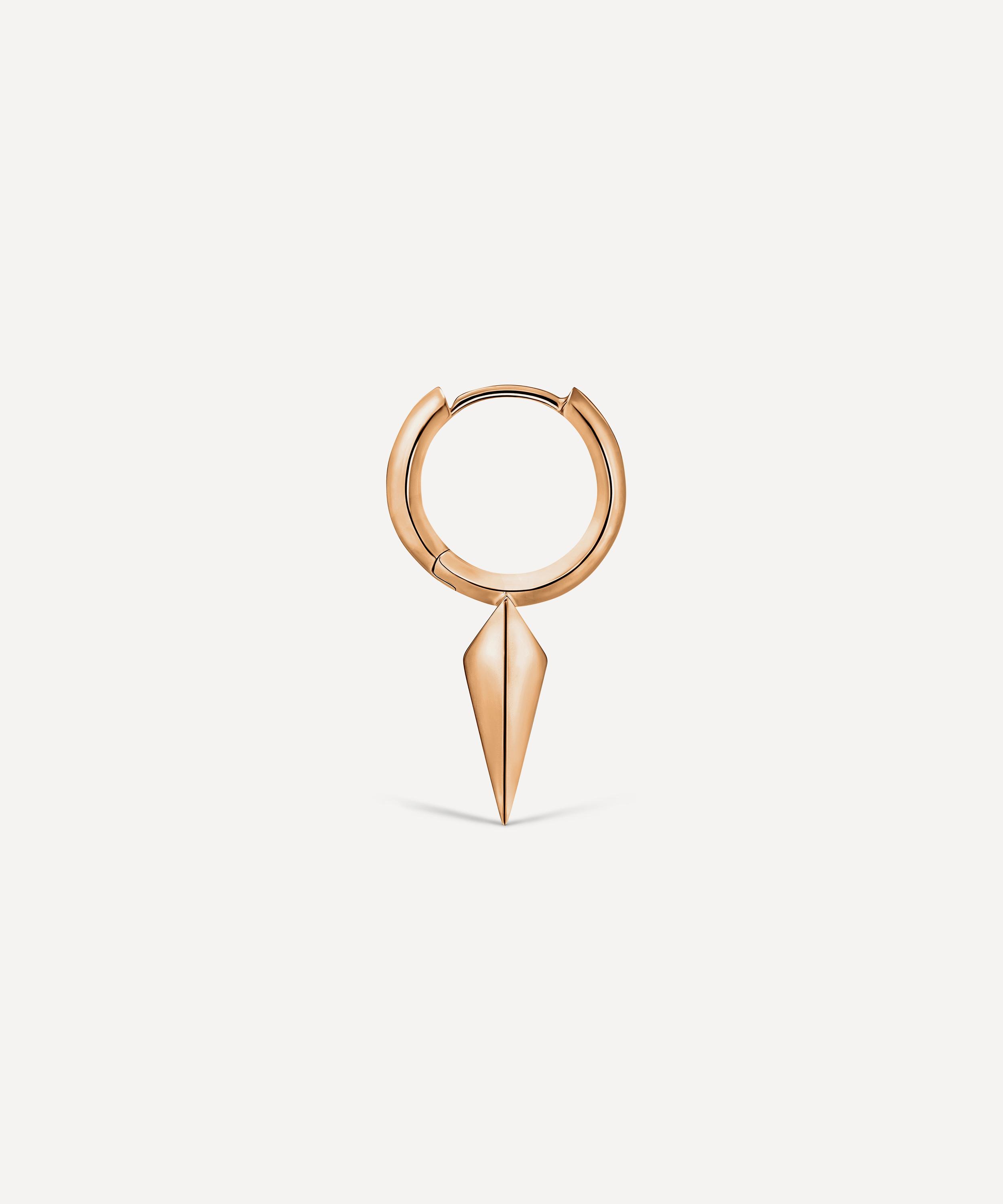 Available in multiple variations of high-polished 14 carat gold, this hoop earring will slot seamlessly into any ear curation and add a punk-inspired touch with its long, faceted spike design. Complete with a convenient clicker fastening, it styles beautifully in both helix and lobe piercings.