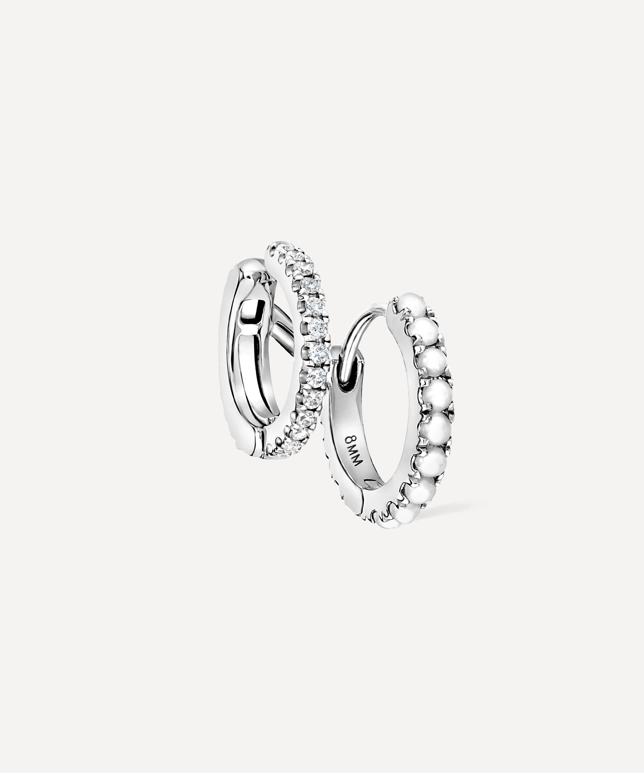 Inspired by Maria Tash’s eternity rings, this two-in-one single hoop earring from styles beautifully at the lobe. Available in multiple variations of high-polished 14 carat gold, it features a double linked silhouette – mimicking two piercings. The first diamond ring fits into any lobe piercing and the second pearl ring fastens as a cuff. Complete in an eternity-style, try layering it with a selection of small studs for a complexion-illuminating finish.