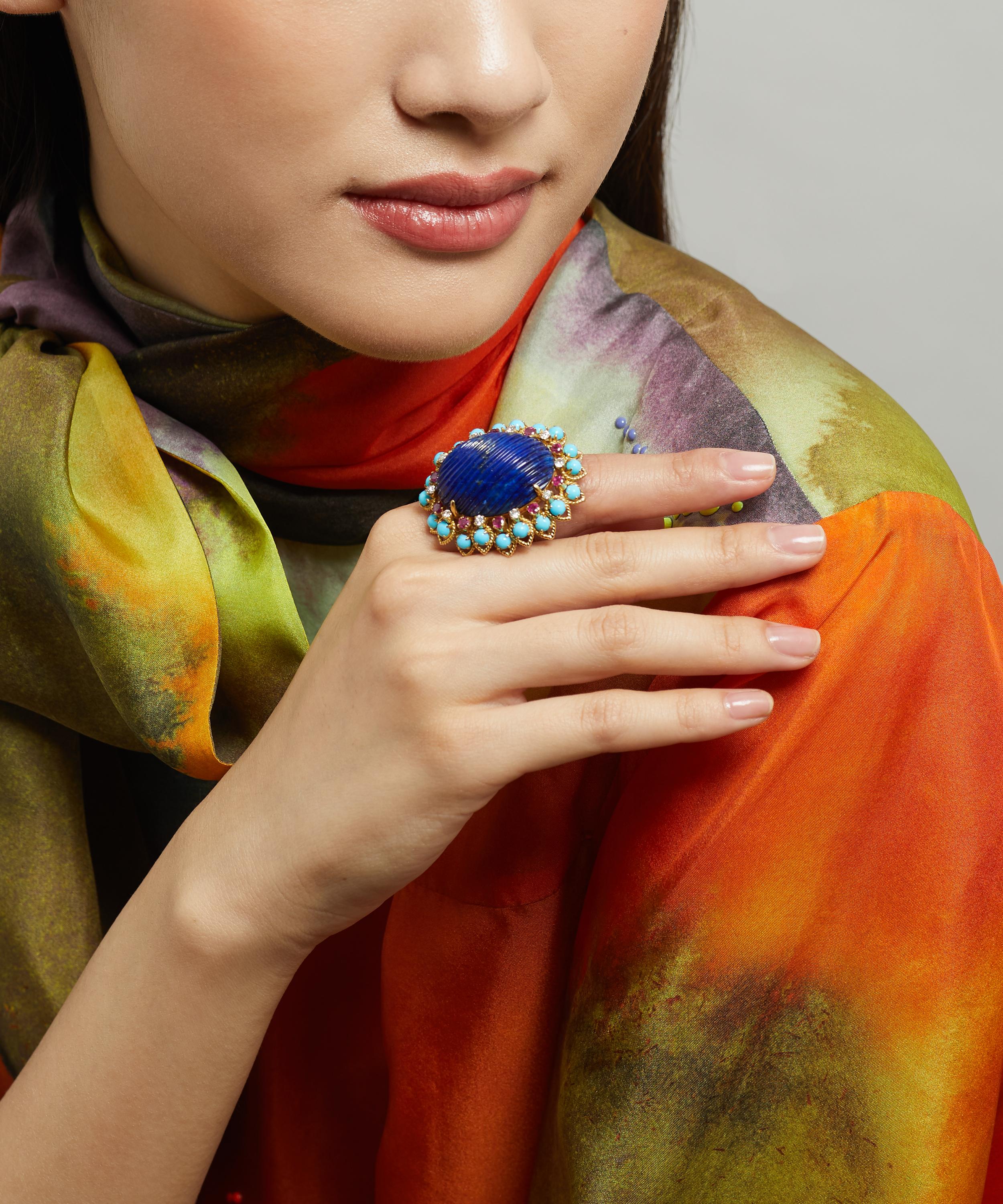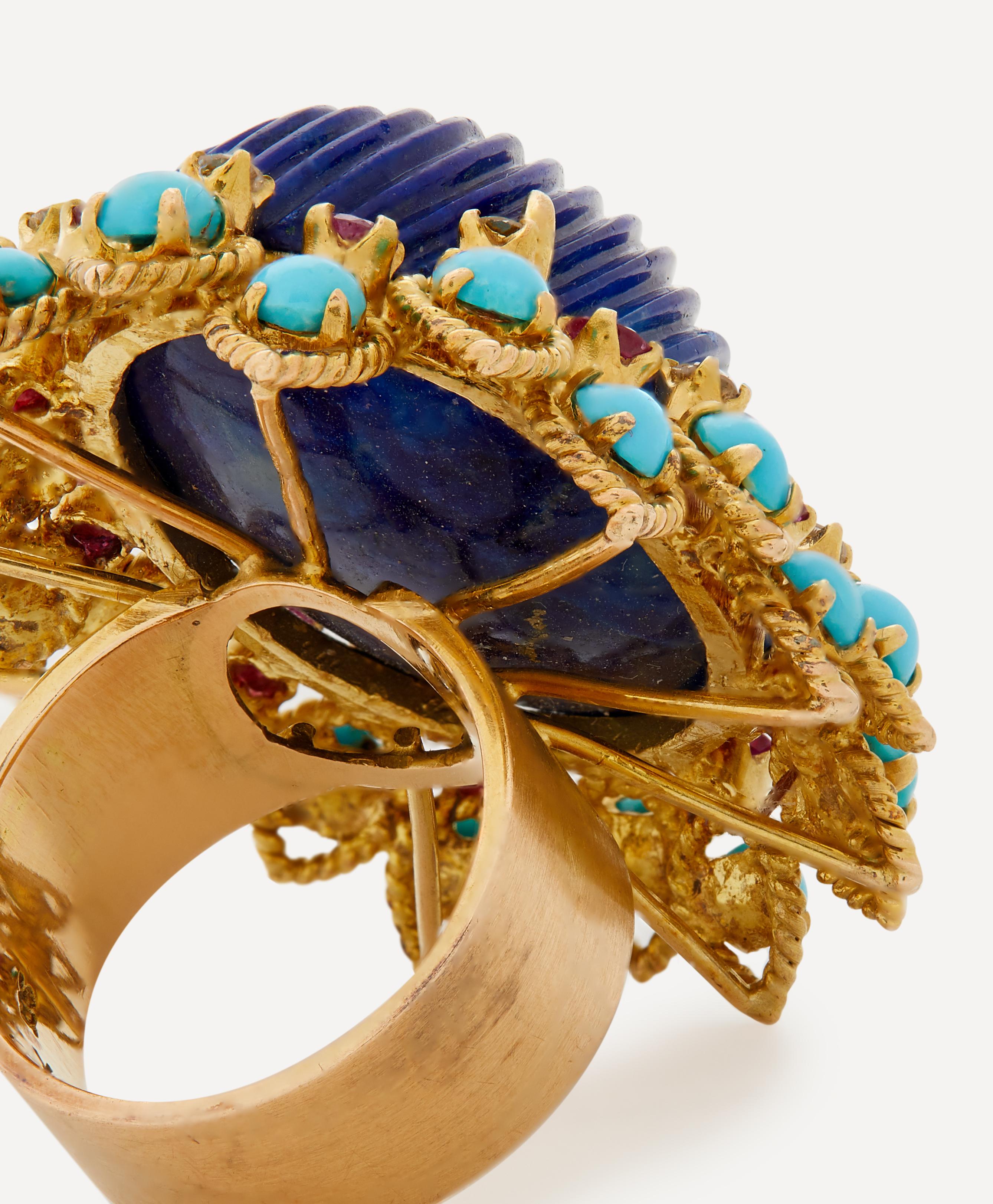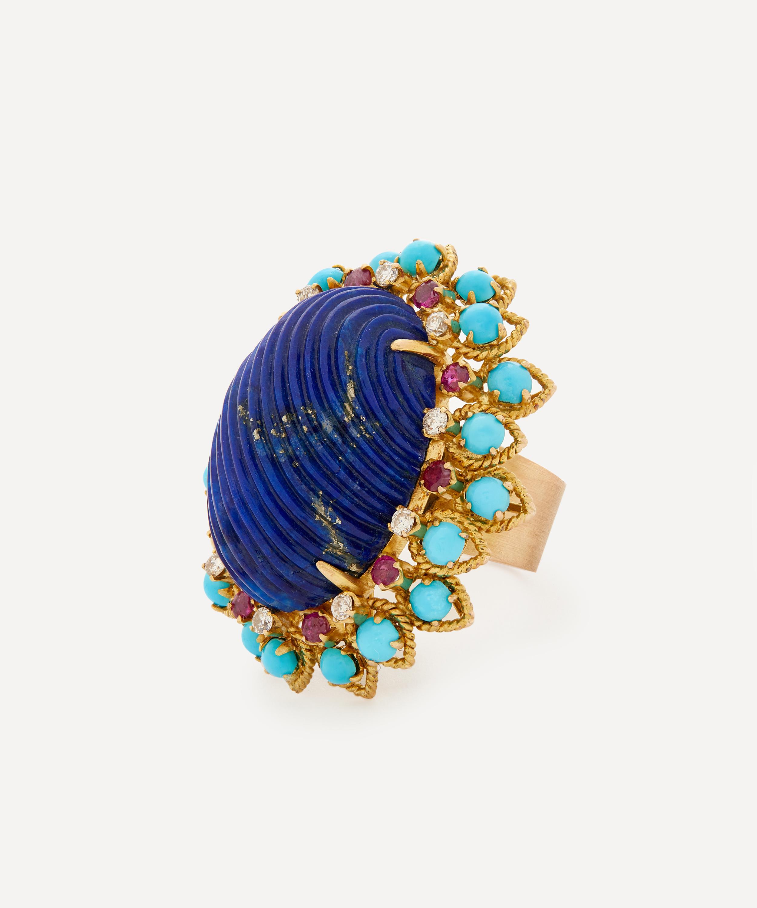 Dating back to the 1960s, this ornamental ring is crafted from 14 carat gold – showcasing a large, oval-carved lapis lazuli framed by dynamic, brilliant-cut diamonds and round-cut rubies – creating a sparkling gem to adorn the finger. The piece is complete with a cabochon-cut turquoise surrounding the edge, enclosed in twisted gold details, resembling flower petals. An elegant example of timeless vintage jewellery, wear this ring alone to make a striking statement, or pair it with additional cocktail rings and dazzling bands for a maximalist curation.